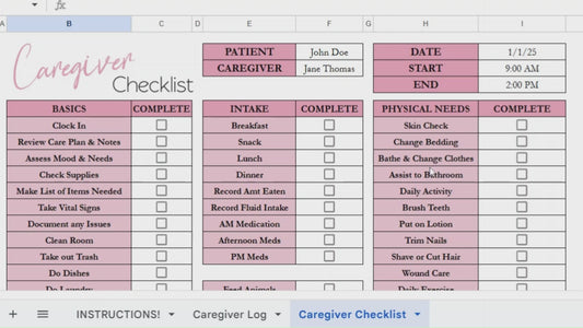 Caregiver Log & Caregiver Checklist Tracker Template for Google Sheets and Excel Spreadsheet