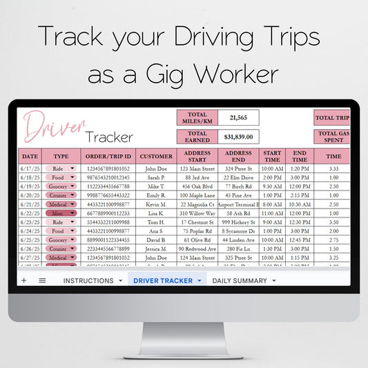Gig Driver Log Template for Google Sheets and Excel Spreadsheet - Side Hustle Mileage Tracker, Income and Expense Tracker
