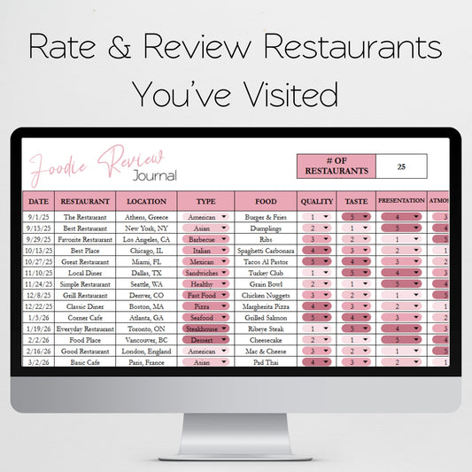 Foodie Review Journal Template Google Sheets and Excel Spreadsheet - Favorite Restaurant Tracker