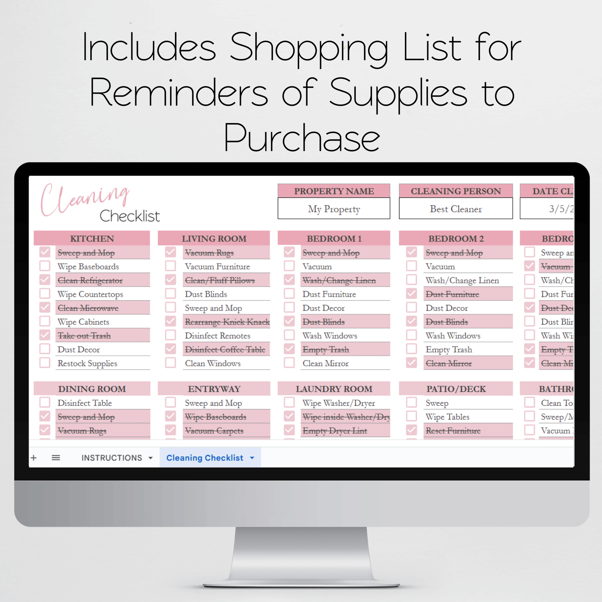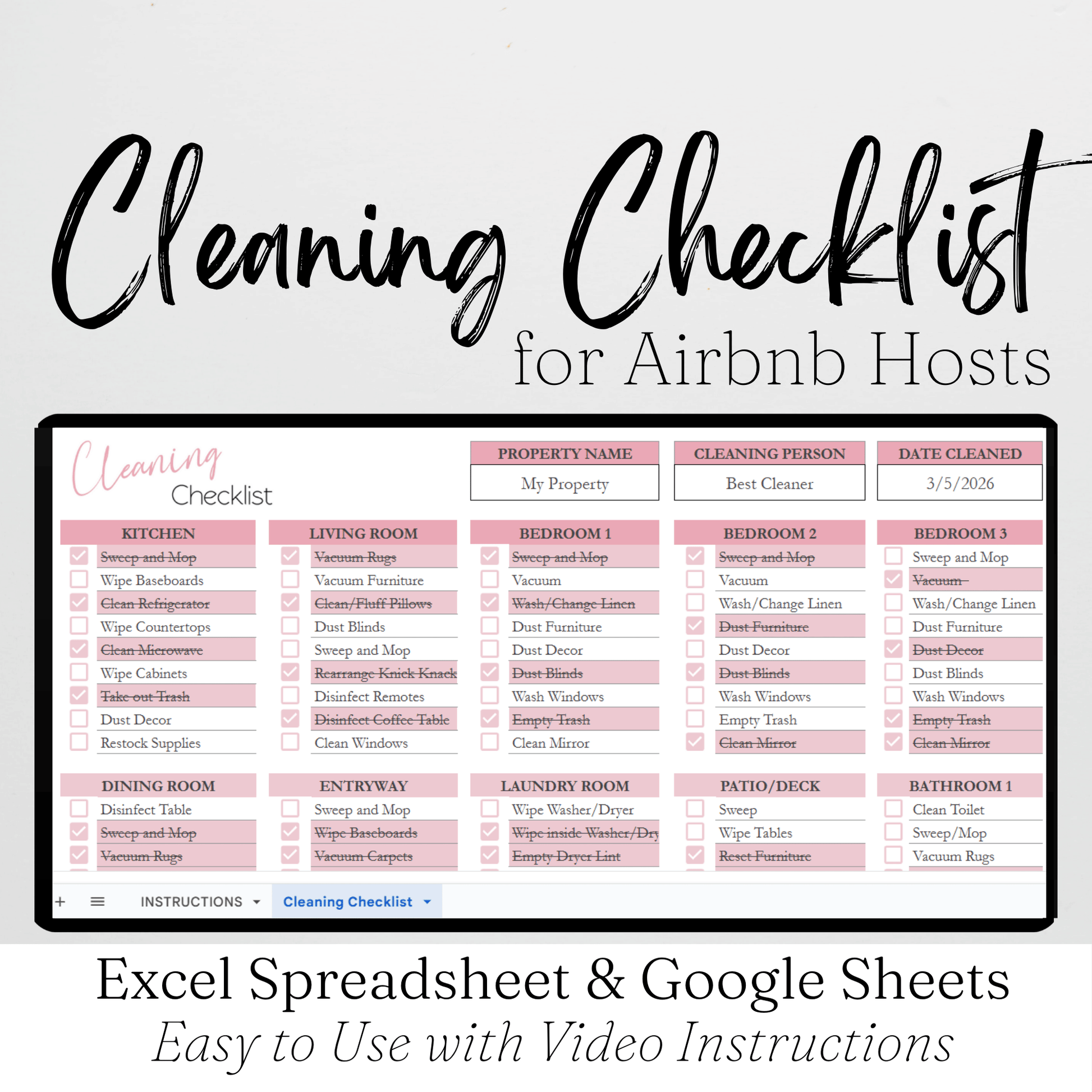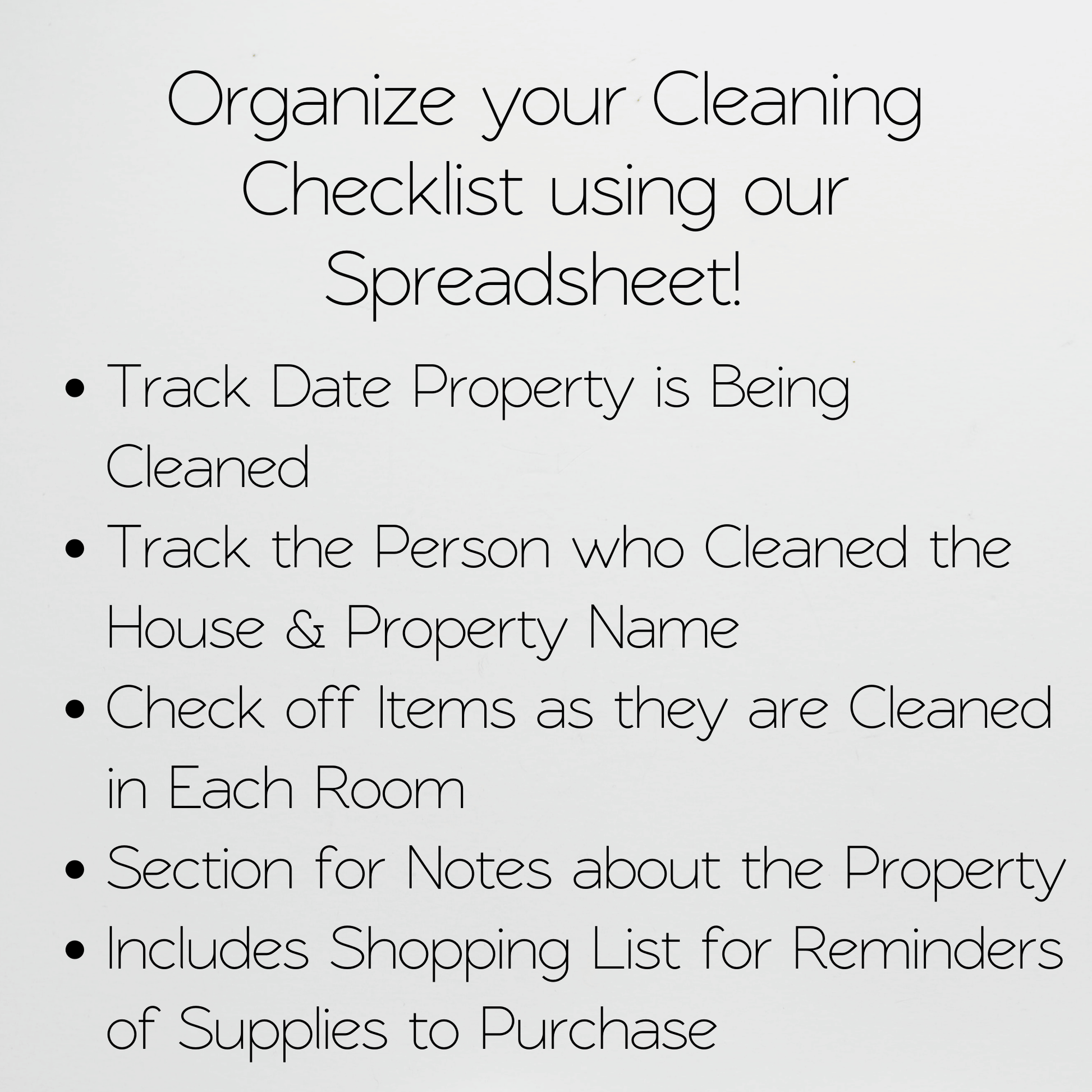 This is an Excel Spreadsheet that is an Airbnb cleaning checklist. This cleaners checklist will help you to keep up with the cleaning that needs to be done in every room of the house. There is also a notes section as well as a supplies checklist. This checklist is printable and editable.