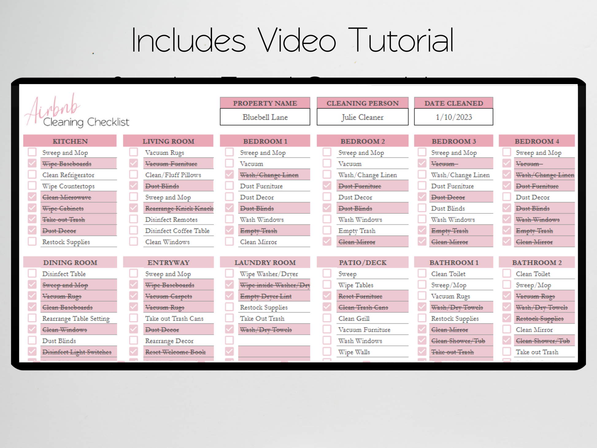 This is an Excel Spreadsheet that is an Airbnb cleaning checklist. This cleaners checklist will help you to keep up with the cleaning that needs to be done in every room of the house. There is also a notes section as well as a supplies checklist. This checklist is printable and editable.