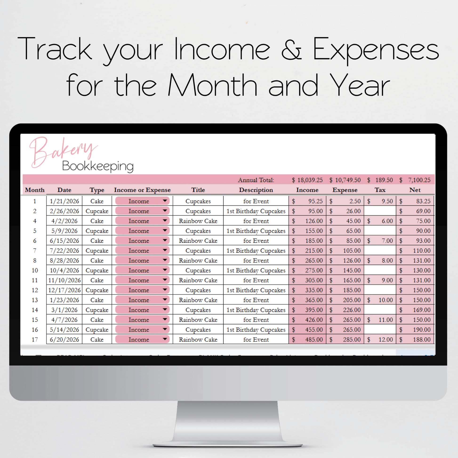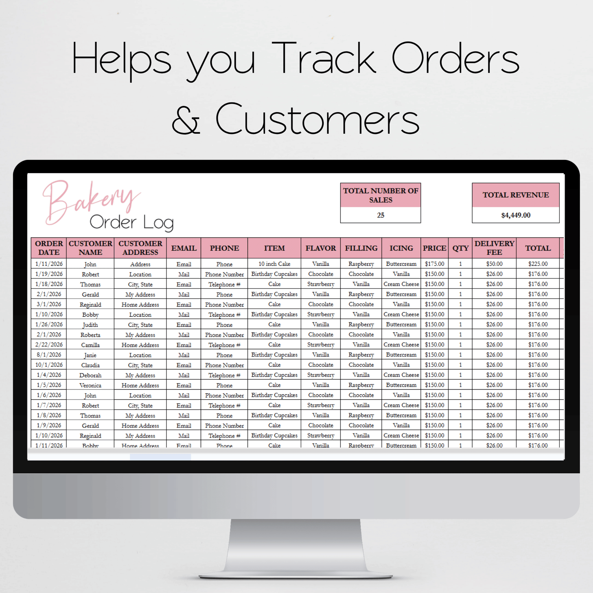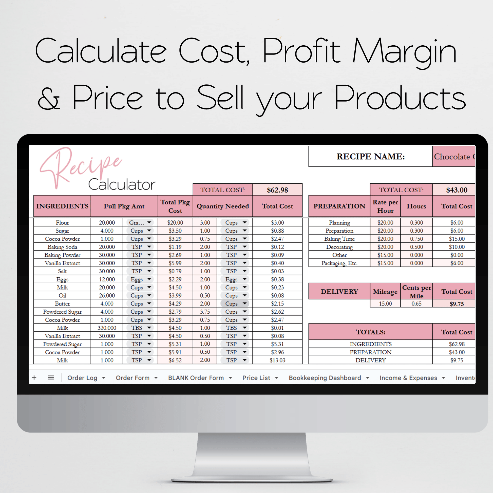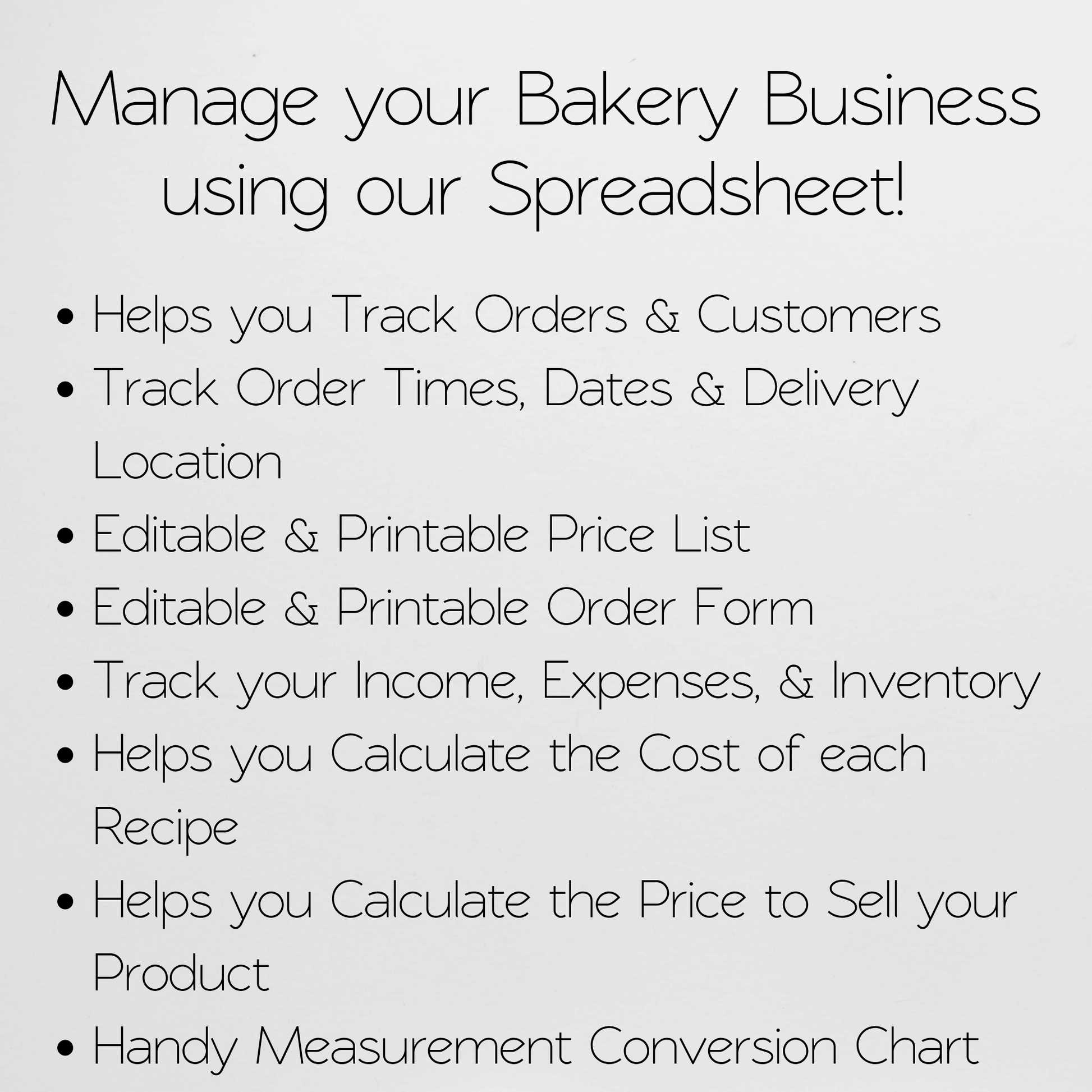 Take the hassle out of managing your bakery business with this Bakery Business Google Sheet. Keep track of inventory, expenses, and sales all in one place, freeing up your time to focus on baking delicious treats. This includes a recipe calculator, order form, order tracker. You can manage your baking business with this sheet. You can see your orders, client contact information. You can track your income and expenses and your inventory. You can calculate the cost of your cake, cupcakes, cookies, bread and more. You can calculate the price to sell your products and your profit margin with this all in one bakery business spreadsheet.