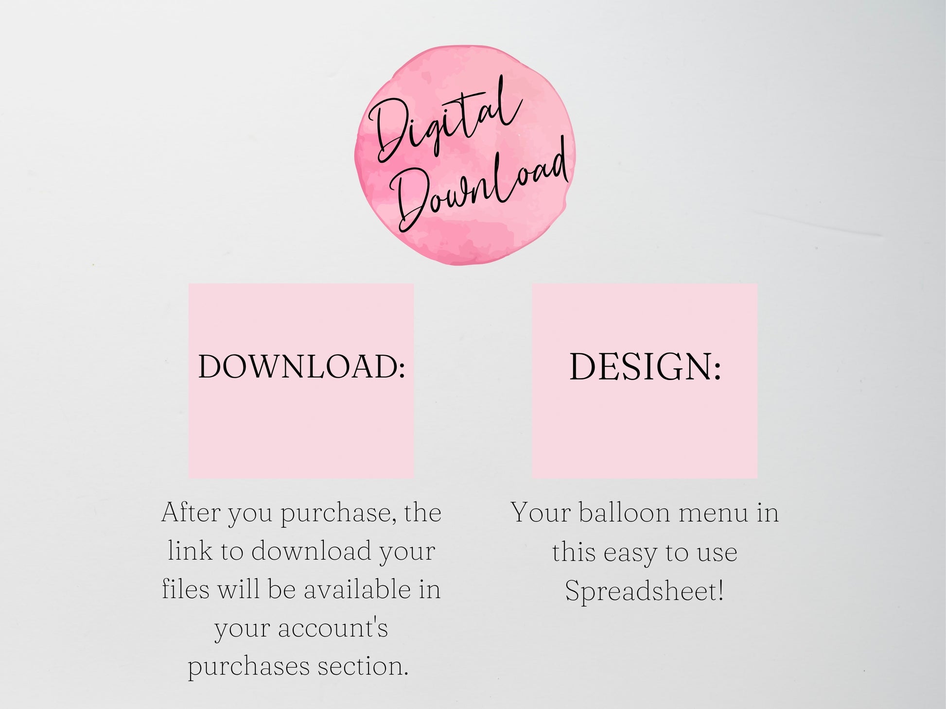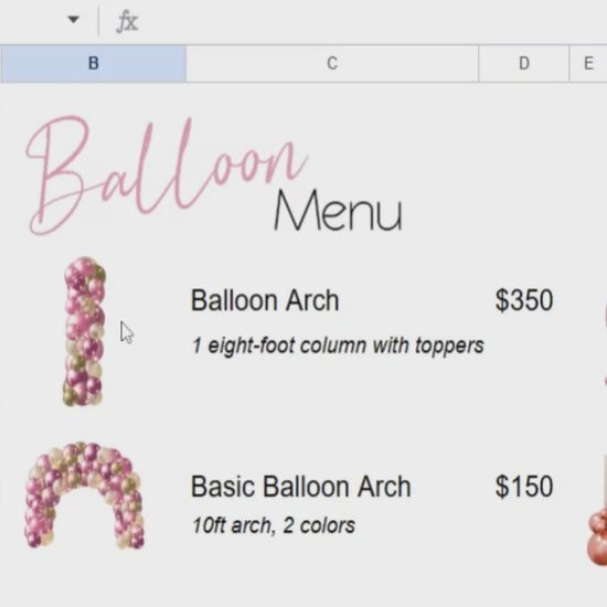 This editable balloon menu template is perfect to use so you can create and use a balloon pricing menu for your balloon business. This balloon price list is editable, printable, and easy to share with your customers. If you are a balloon artist or designer, this balloon price guide is perfect to add your photos of your balloon arch, column, or other designs, along with your price and details of your product. Â
