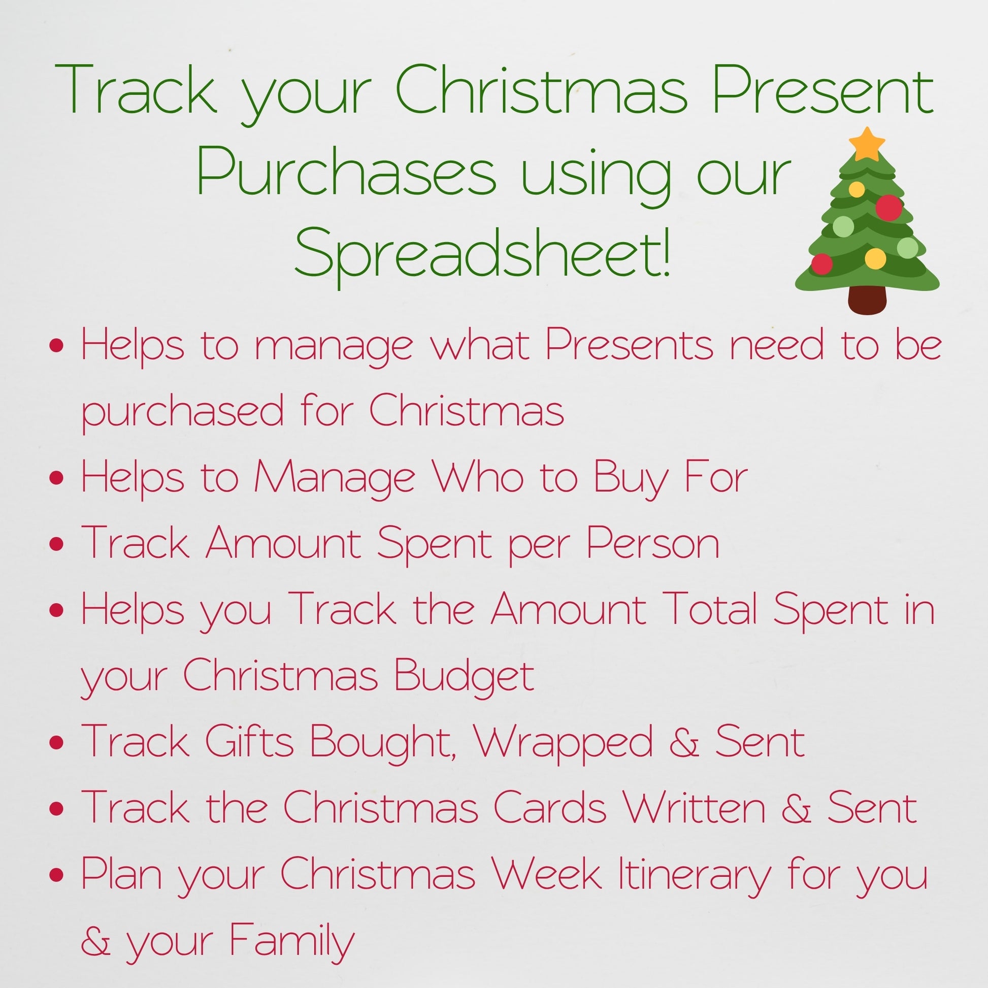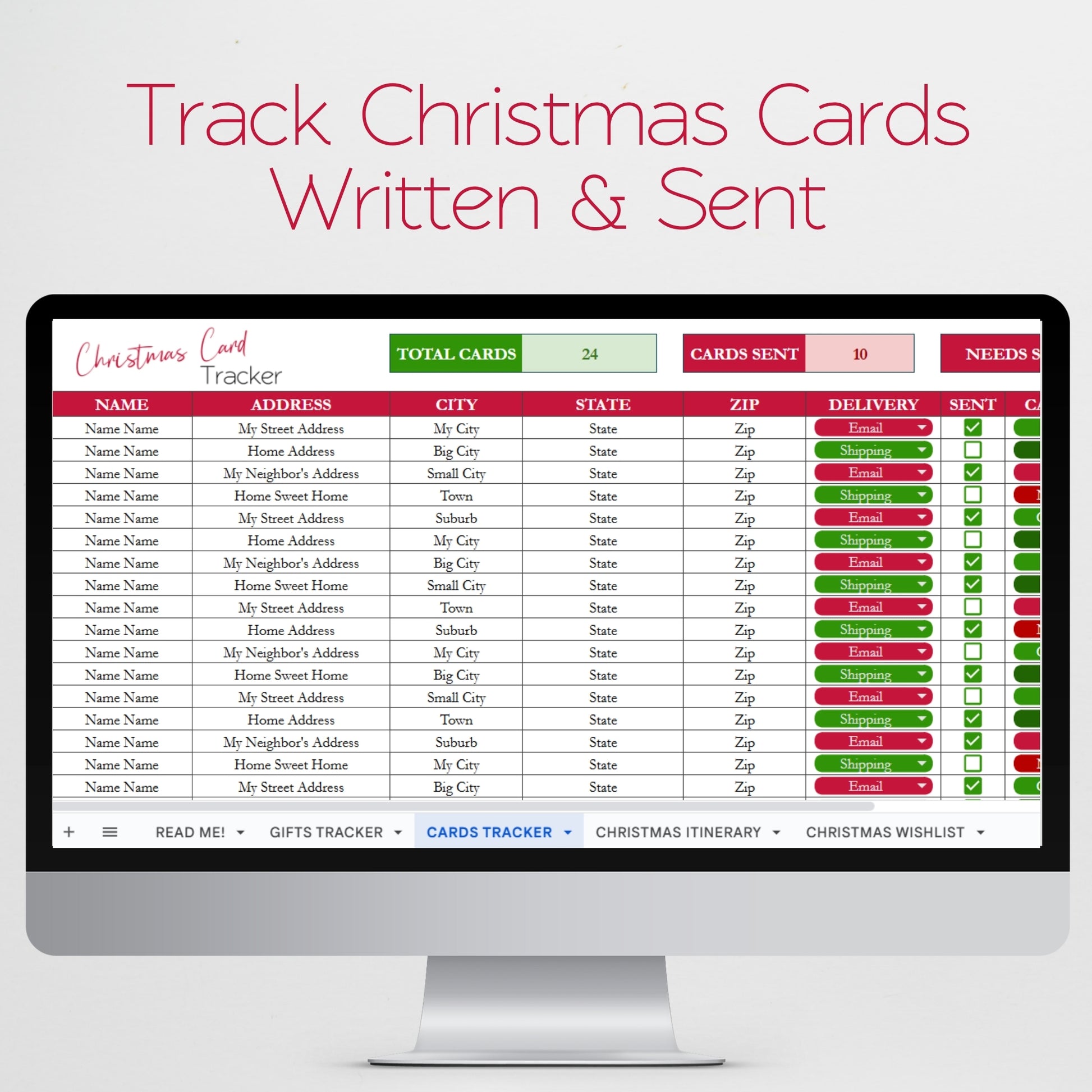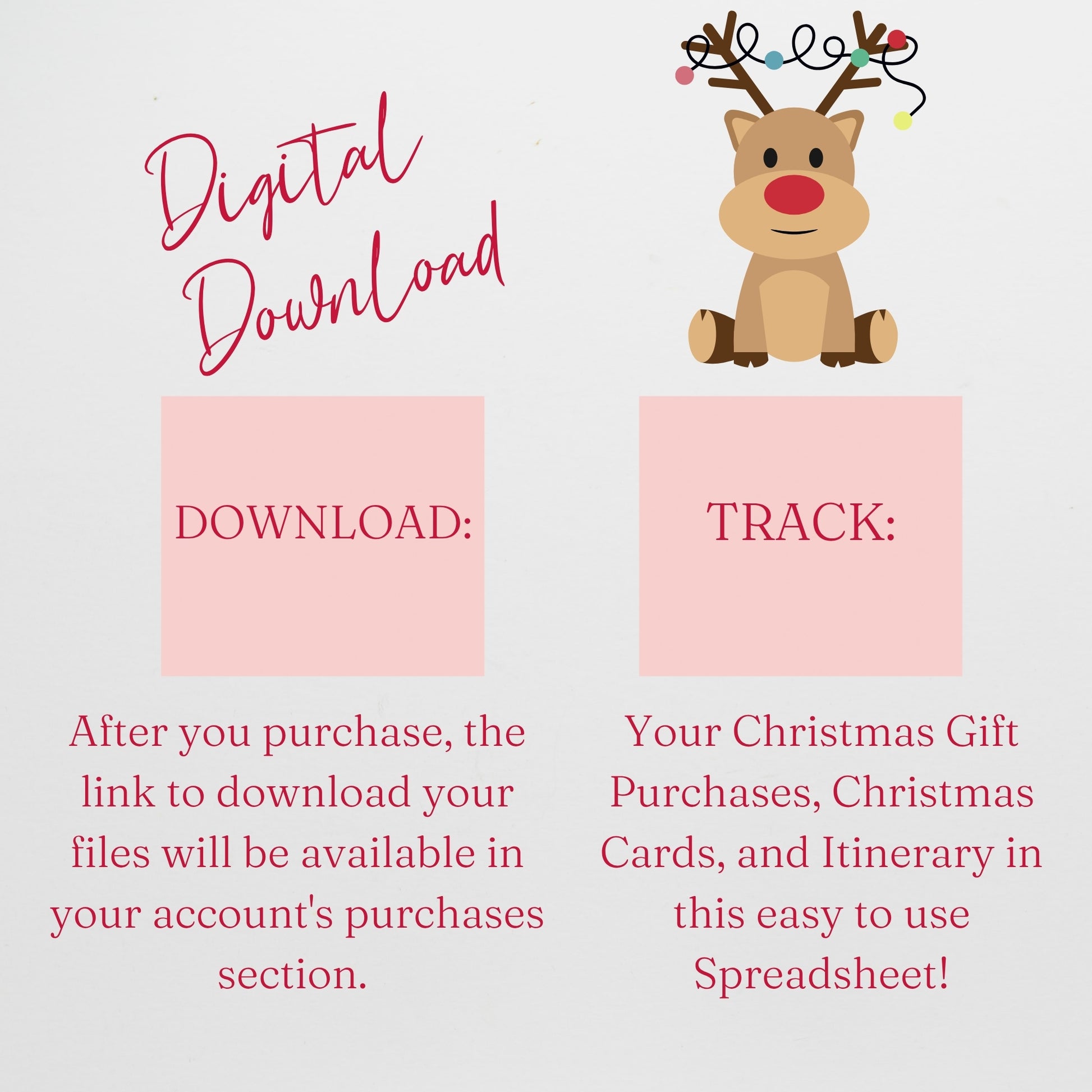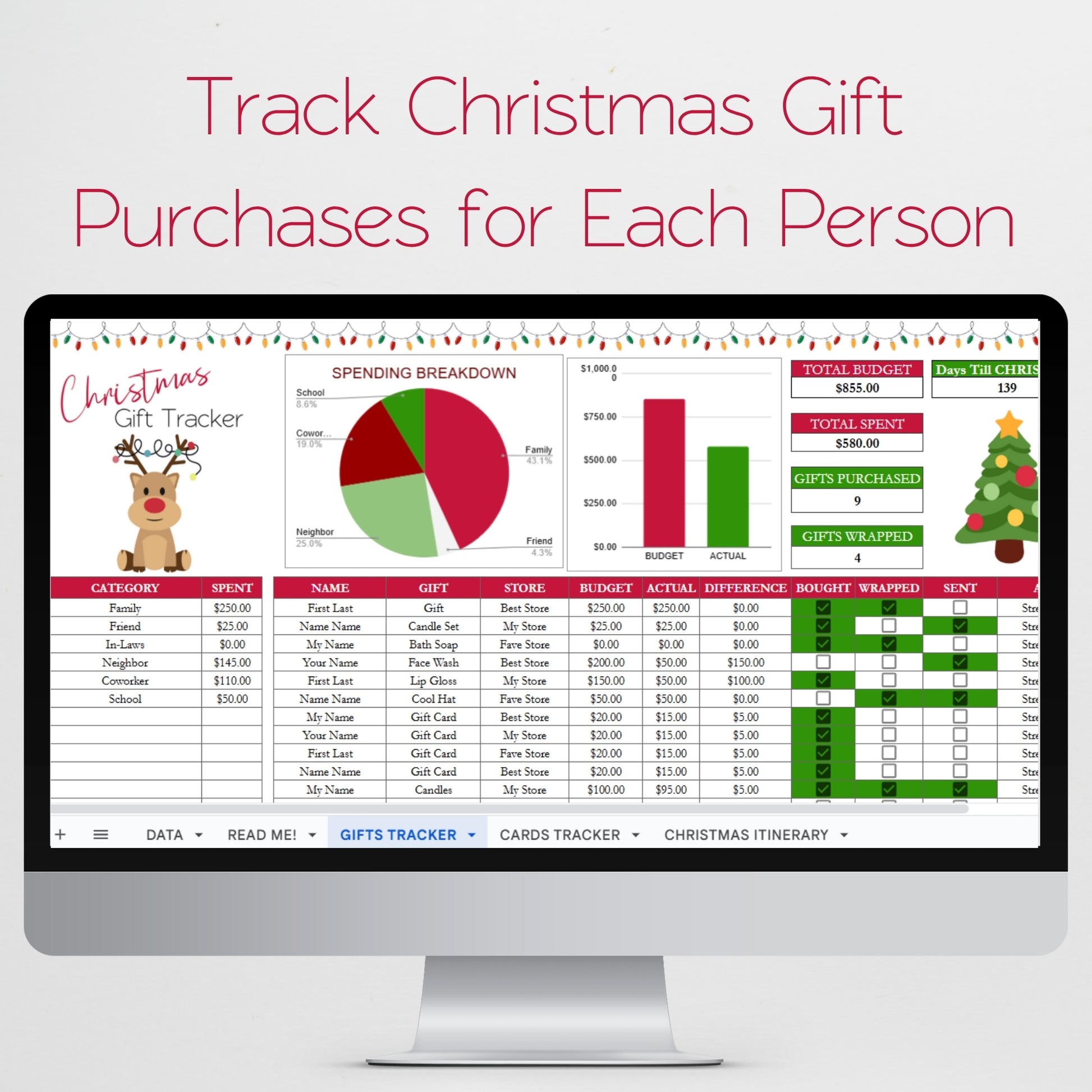 This is a Christmas Gift Tracker Excel Spreadsheet for you to organize your Christmas Budget, keep a Christmas Gift List, and plan your Christmas Vacation Itinerary, as well as keep track of your Christmas Cards that you send.Â
