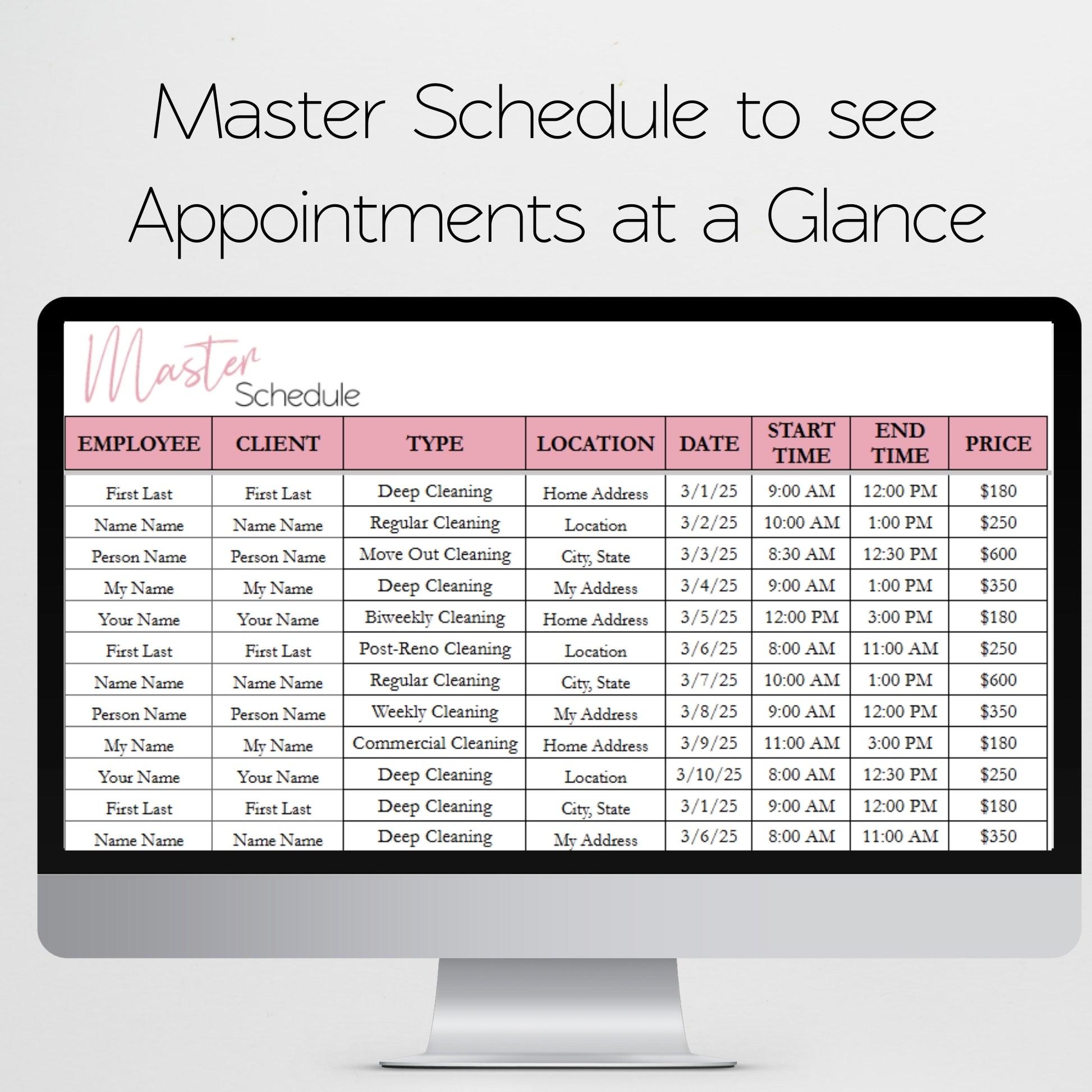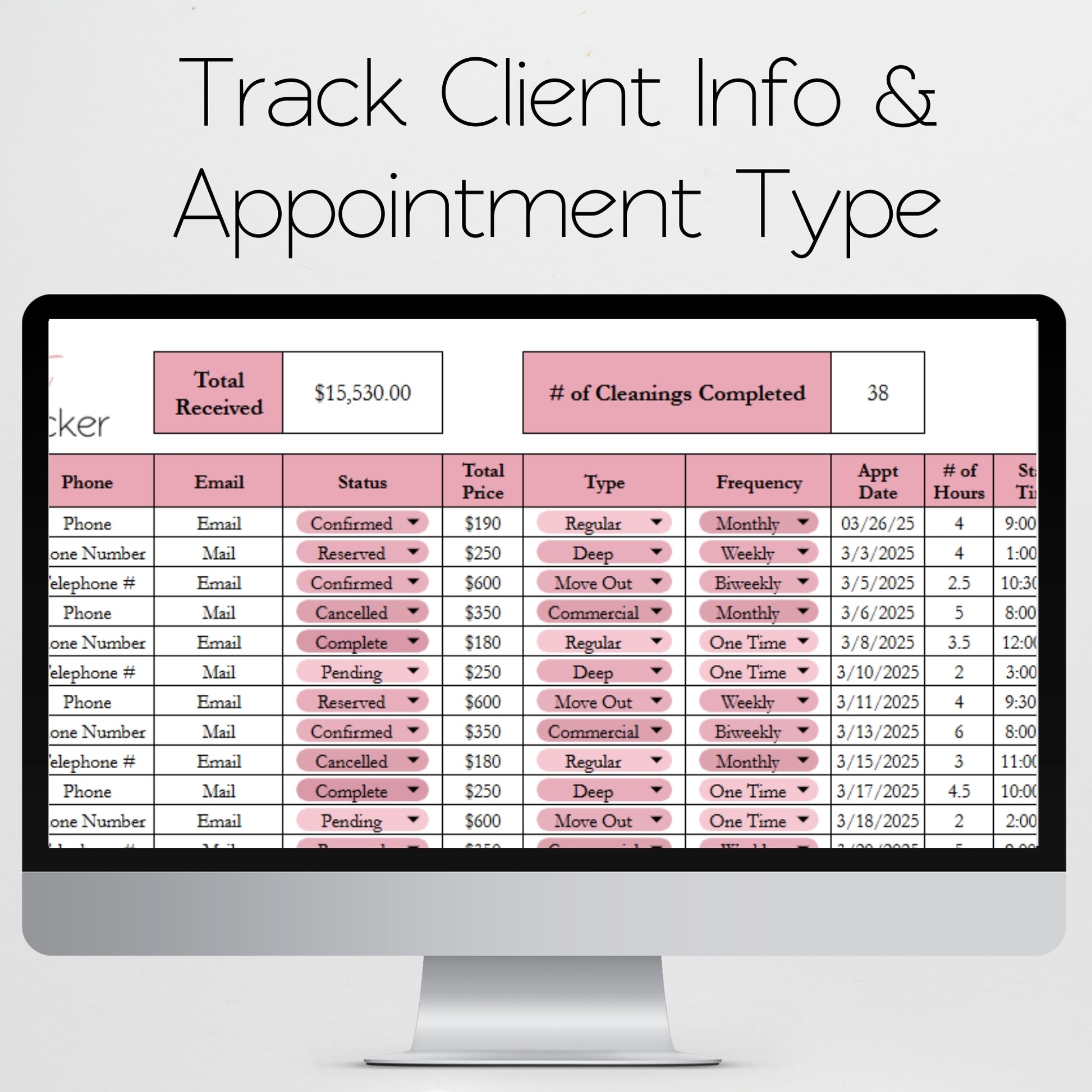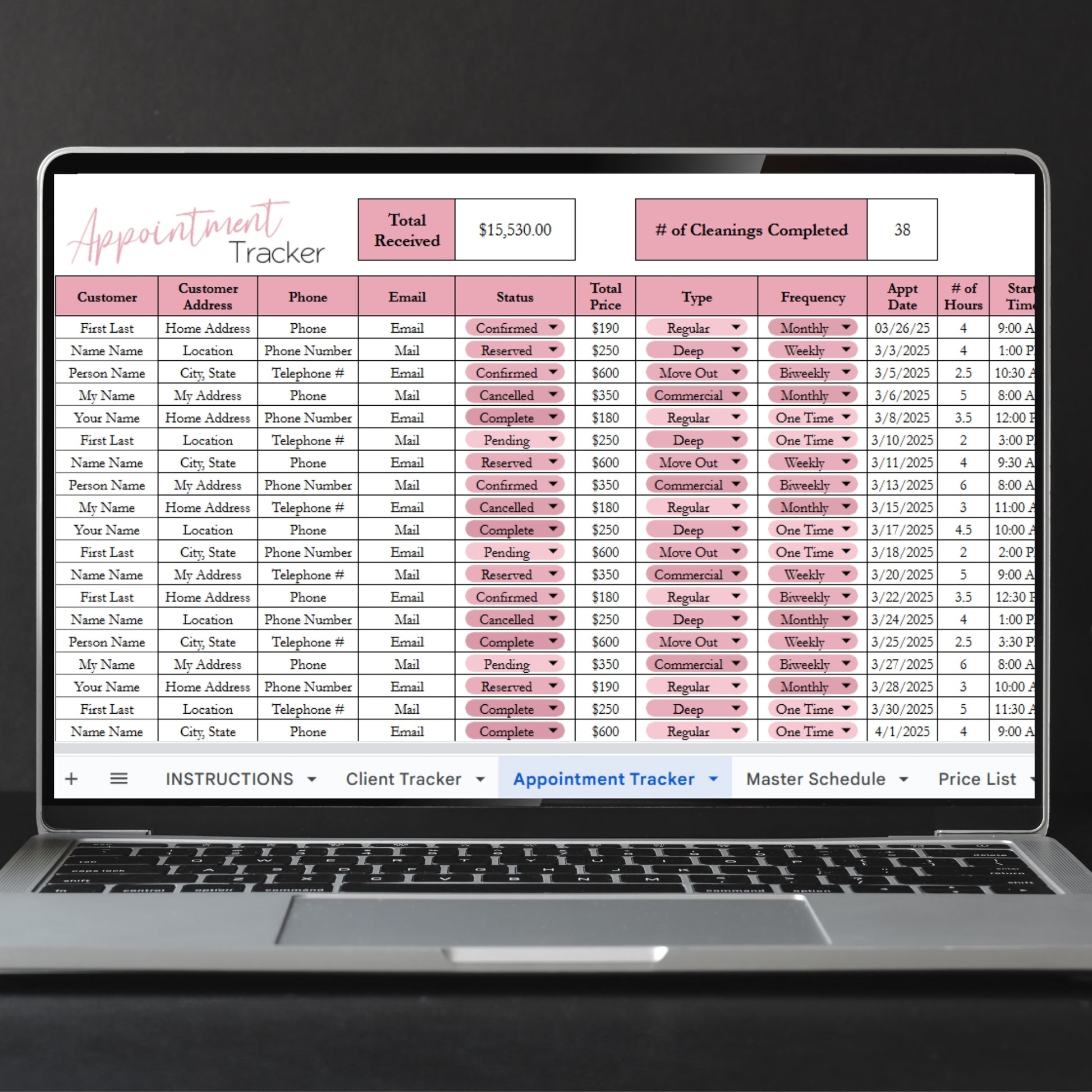 Track your cleaning business appointments with our appointment tracker template. Available for both Google Sheets and Excel, this spreadsheet helps you track client contact information, appointment dates and times, the type of service they are choosing, and the price. There is also a master appointment sheet so you can keep up with appointments at a glance.Â