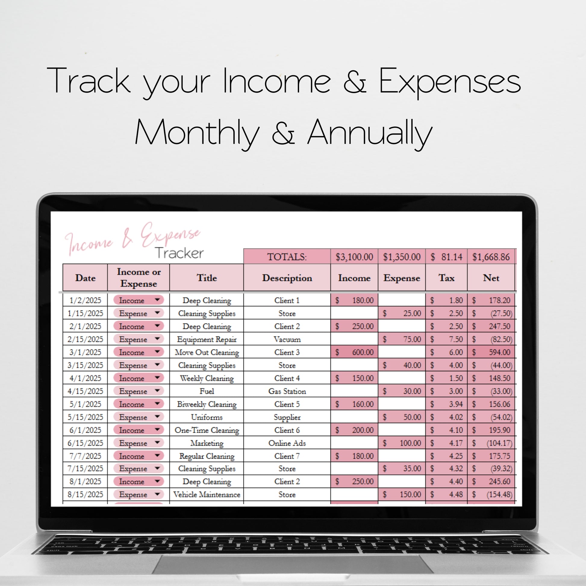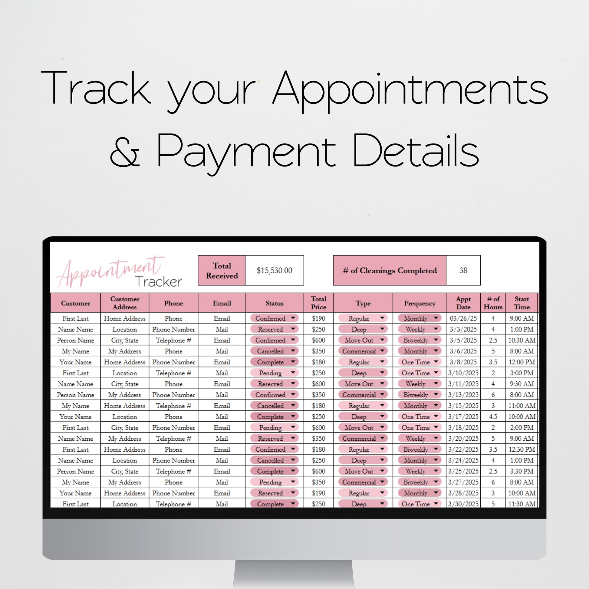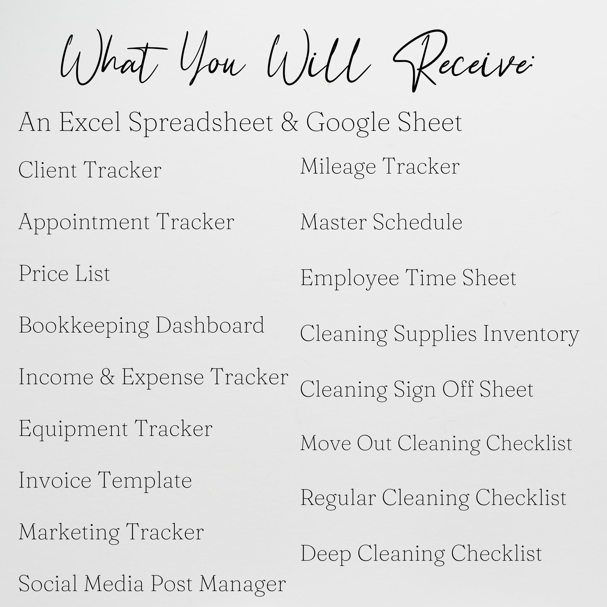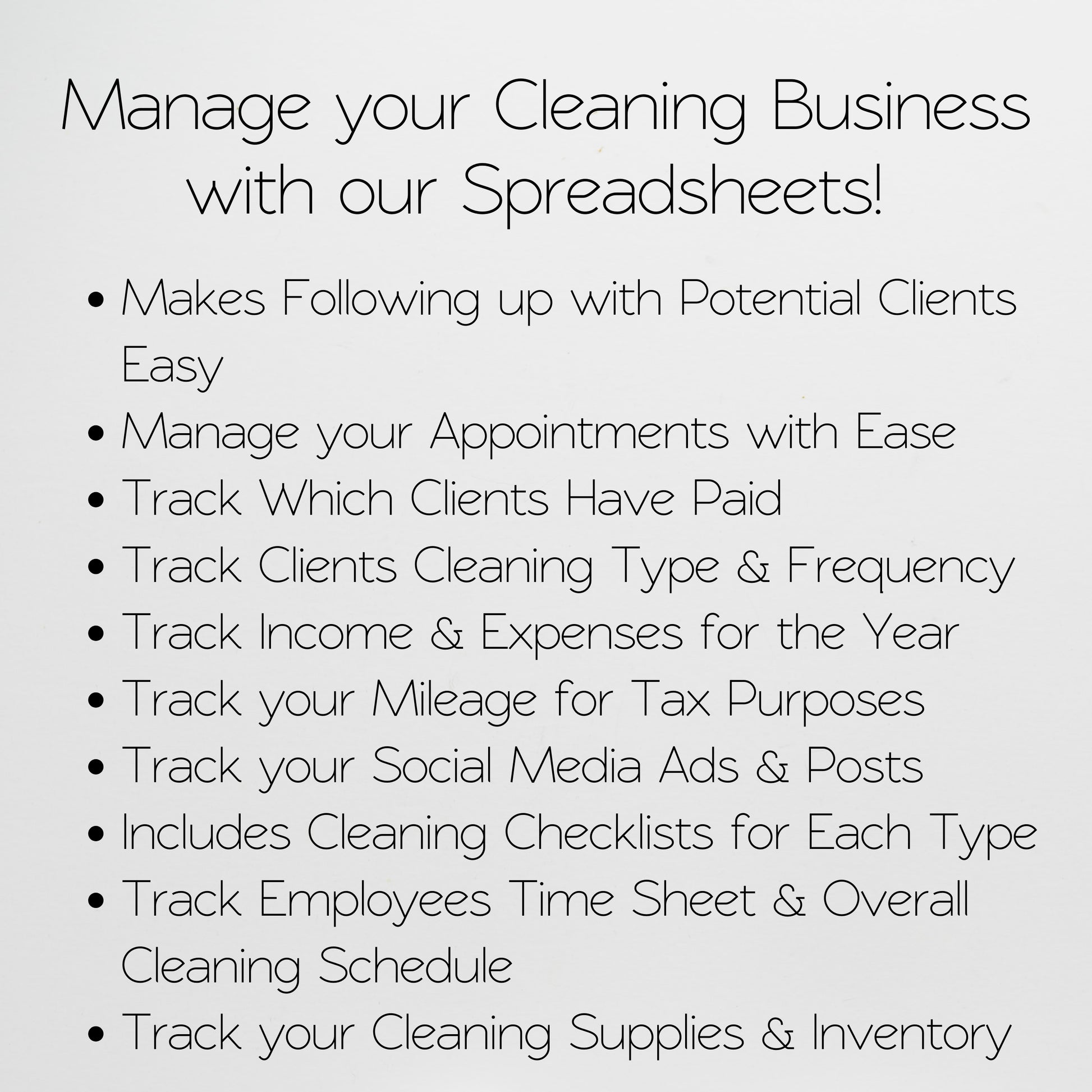 Organize your cleaning business operations with our planner template bundle that includes multiple spreadsheet trackers for clients, appointments, a potential client tracker CRM, income, expenses, inventory tracker, mileage tracker, cleaning checklists and more. Stay organized with social media marketing tools, employee time sheets, and a master schedule to track which cleanings have to be done next.There are detailed cleaning checklists for regular cleaning, deep cleaning, and move out cleaning. Available in both Google Sheets and Excel Spreadsheets.