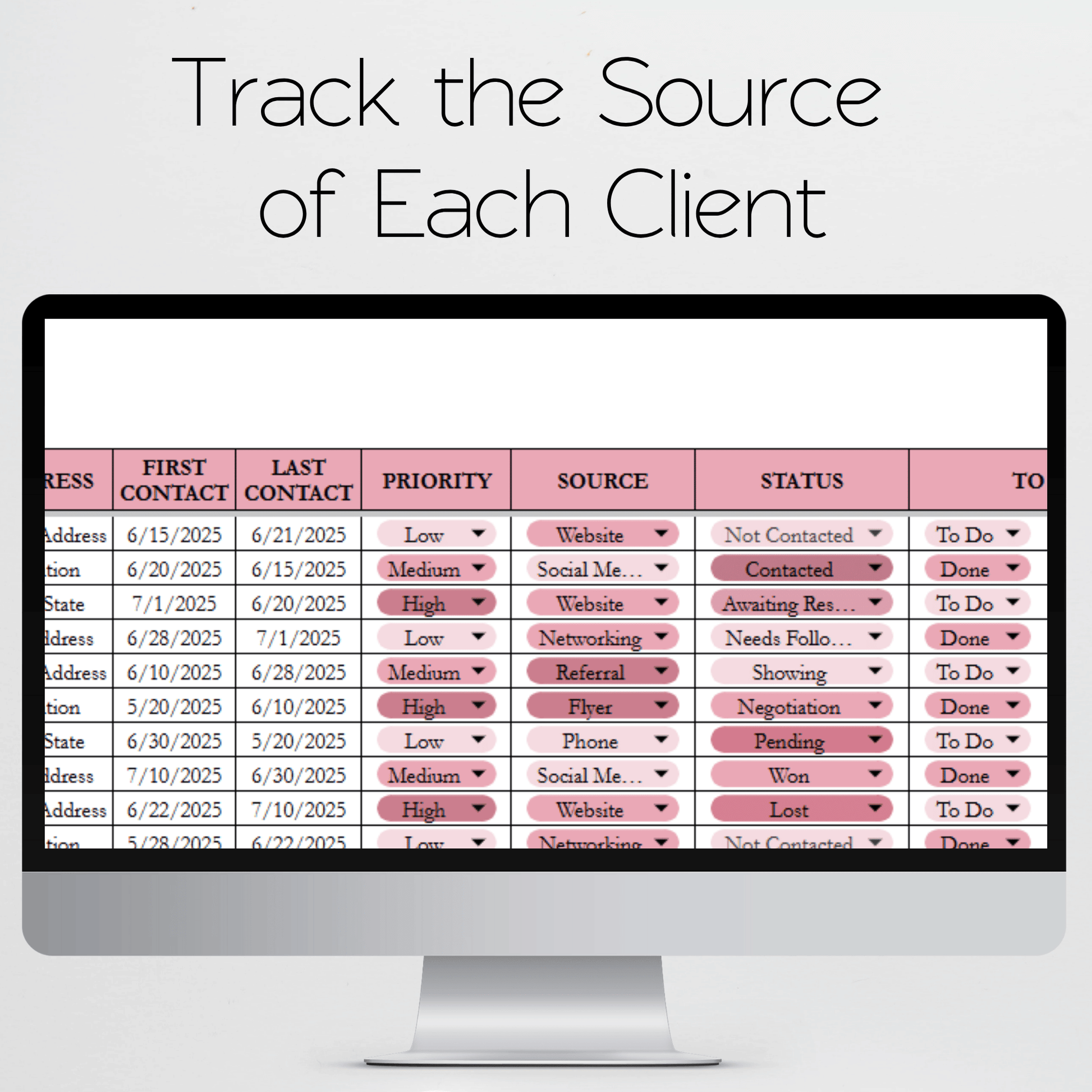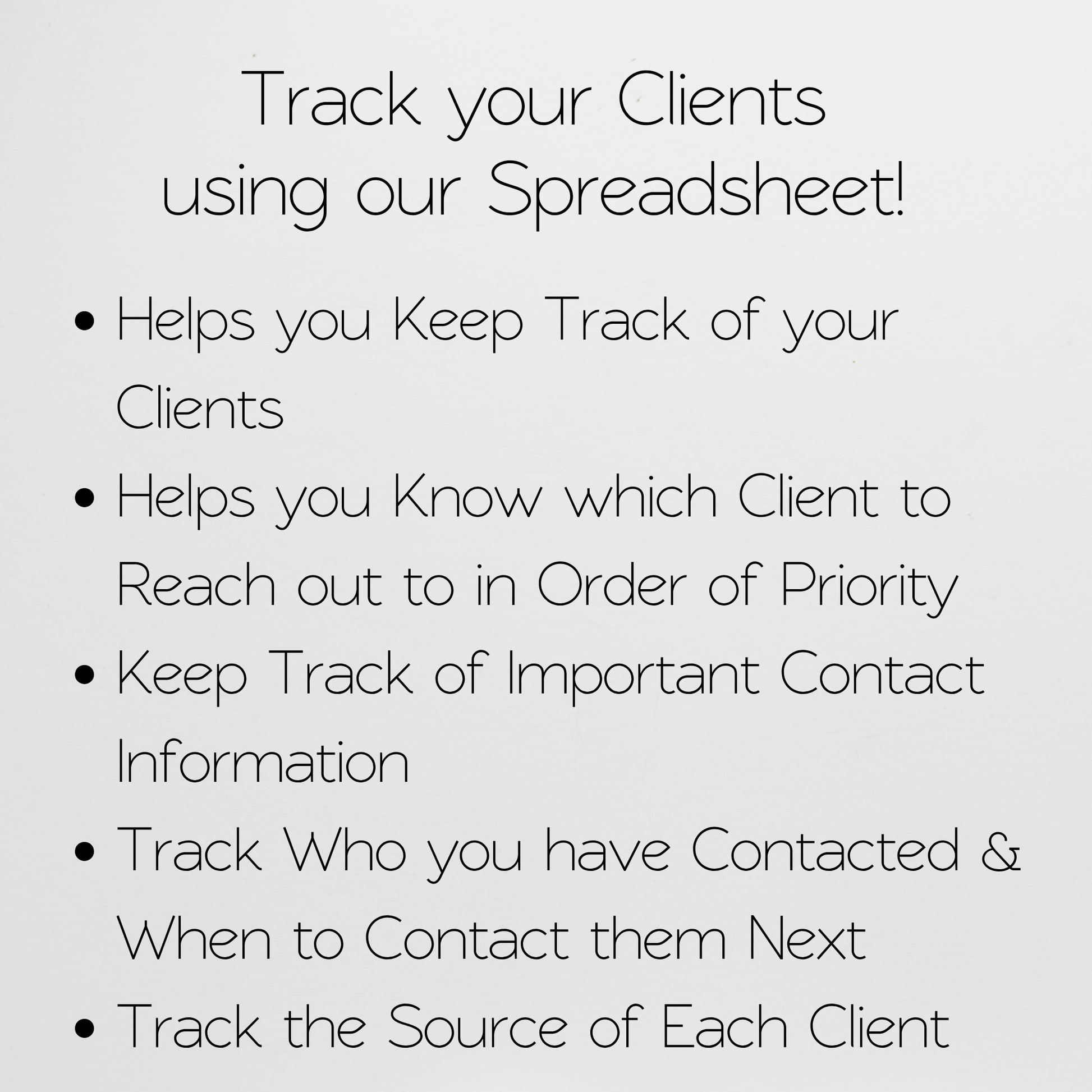 This is an Excel Spreadsheet that helps you to track your clients as you talk with them, set follow-ups, and create tasks and notes. This is a CRM tool that can help you know when to talk with your next client, which clients are in the high-priority status, and more!Â