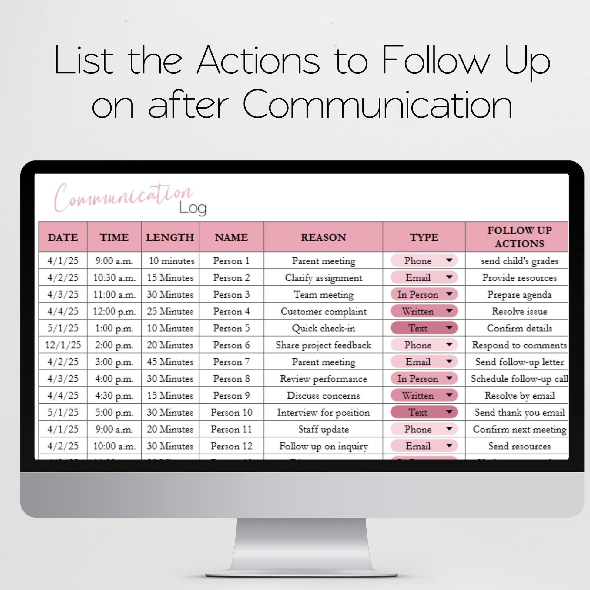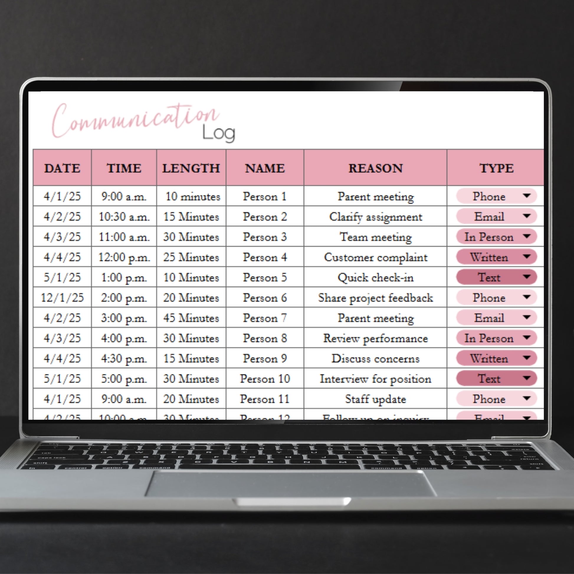 Tracking your communication is easy with this communication log tracker for Google Sheets and Excel spreadsheet. Keep track of phone calls, emails, and conversations with this easy to use communication tracker. Perfect for parents, teachers, coworkers, clients. This is great to record communication and track follow up tasks and goals.Â