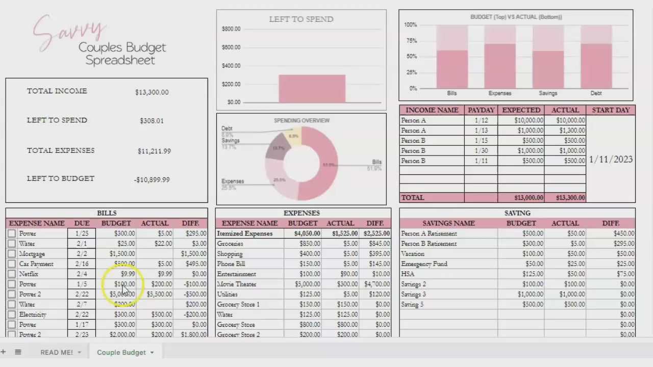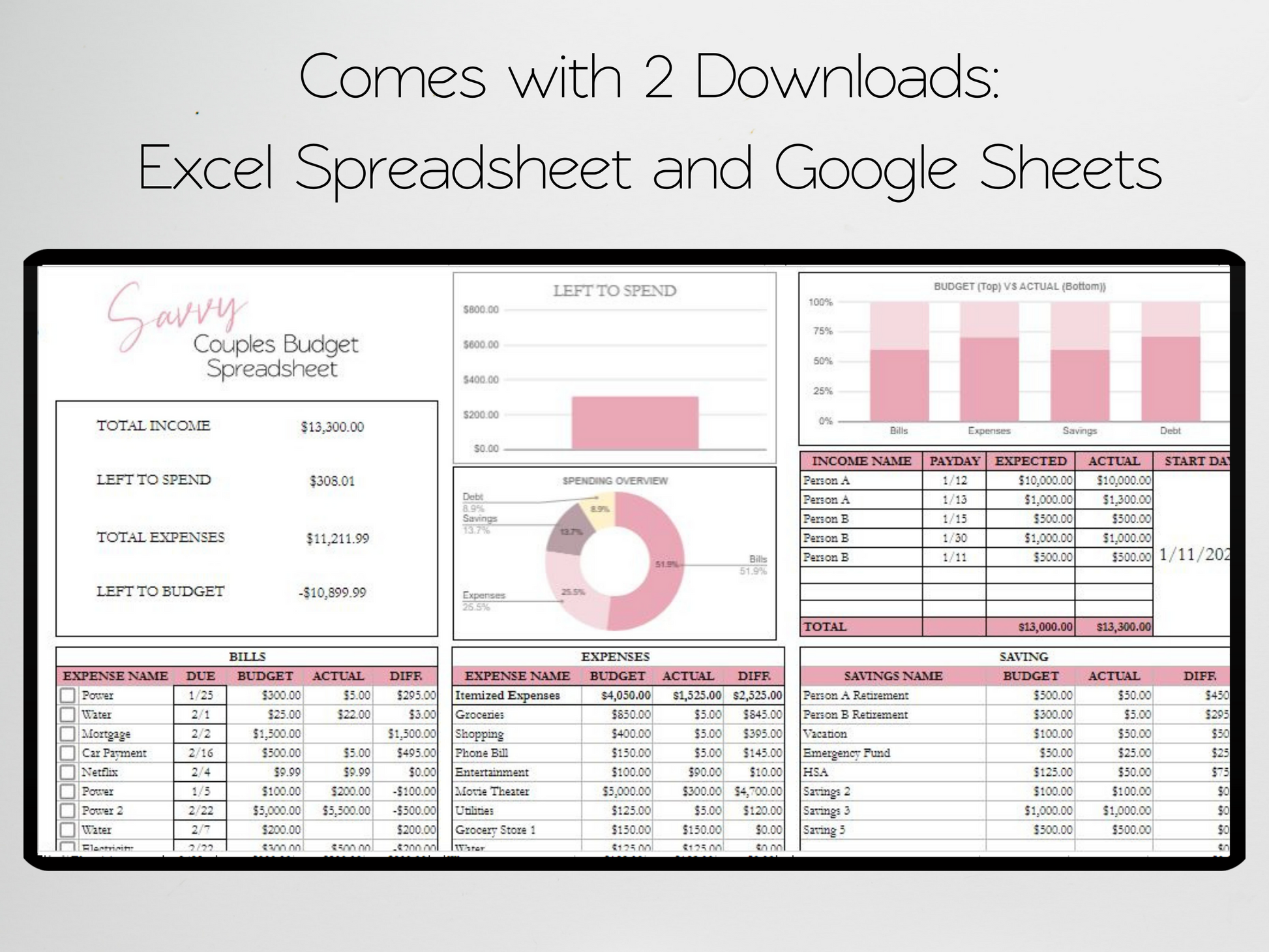 This is an Excel Spreadsheet that is designed specifically for couples to manage their budgets. With this template, you and your spouse can efficiently track your earnings, expenditures, and overall budget. This helps you both stay on top of your financial situation.