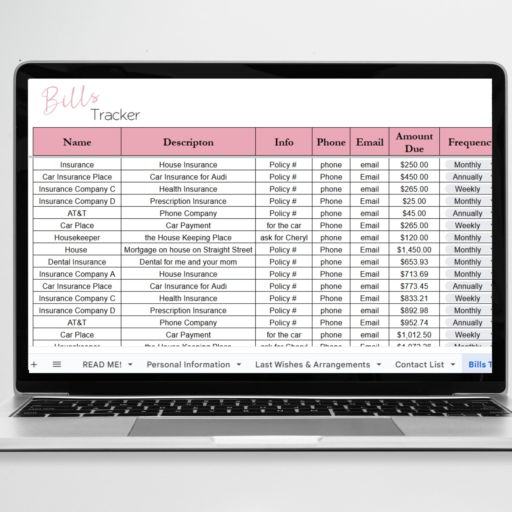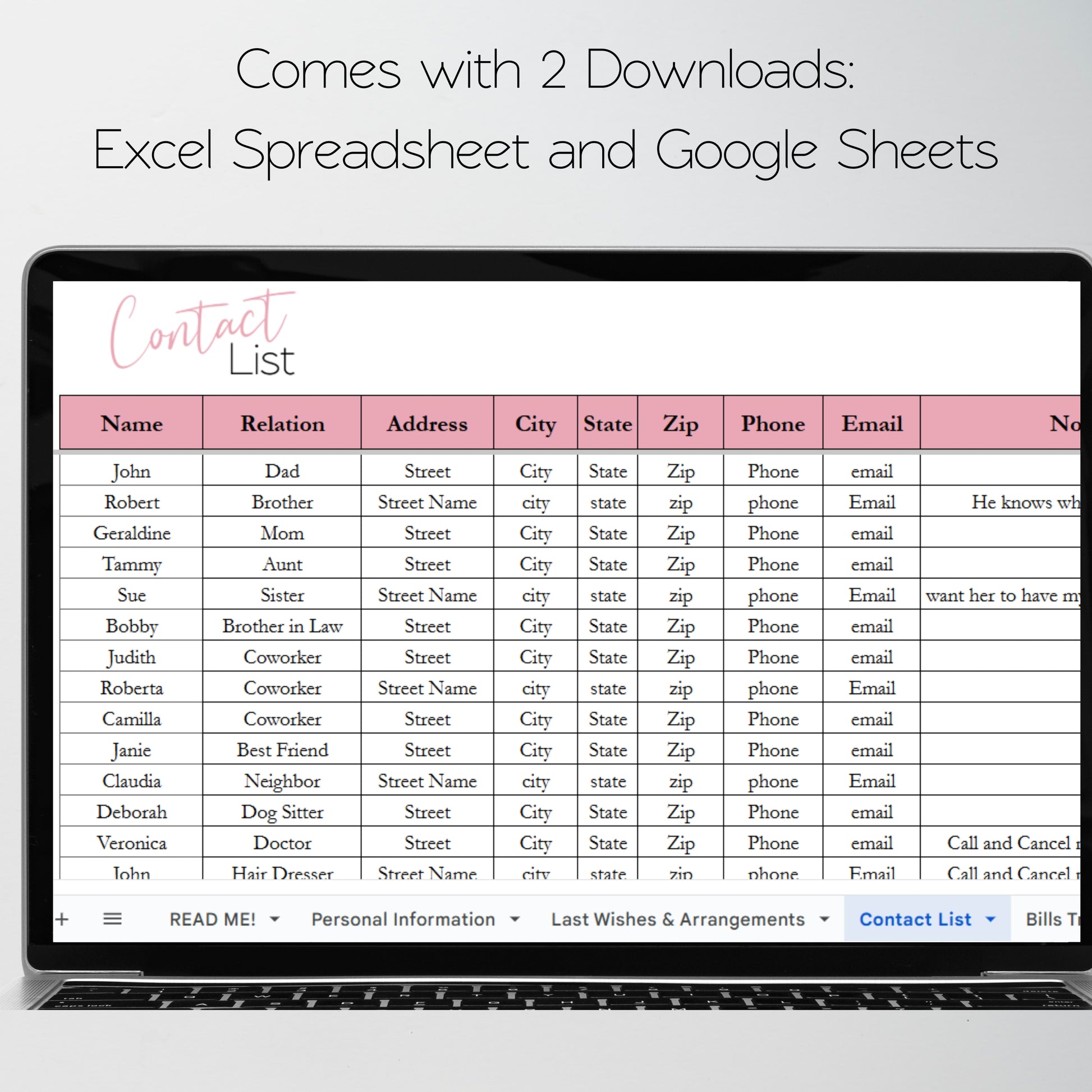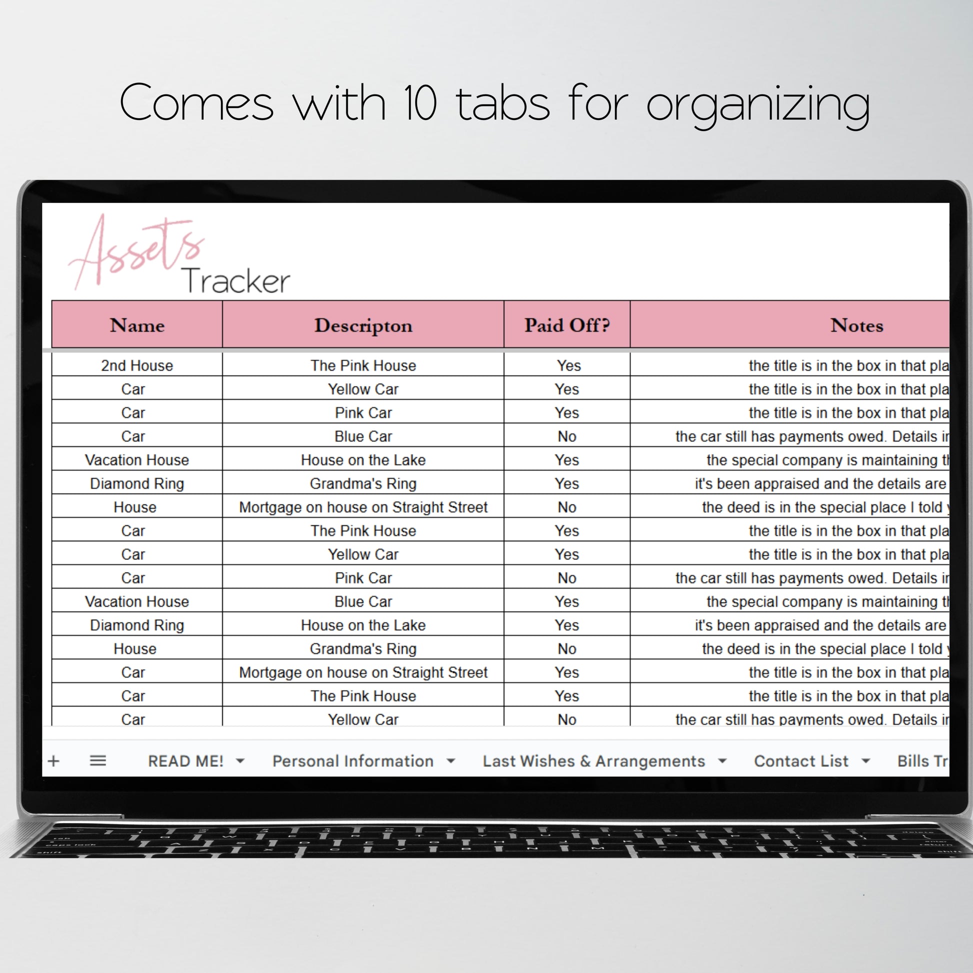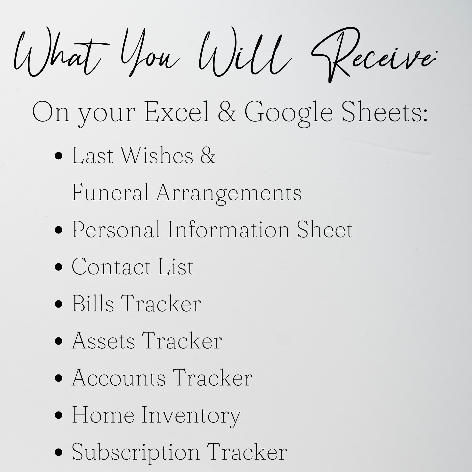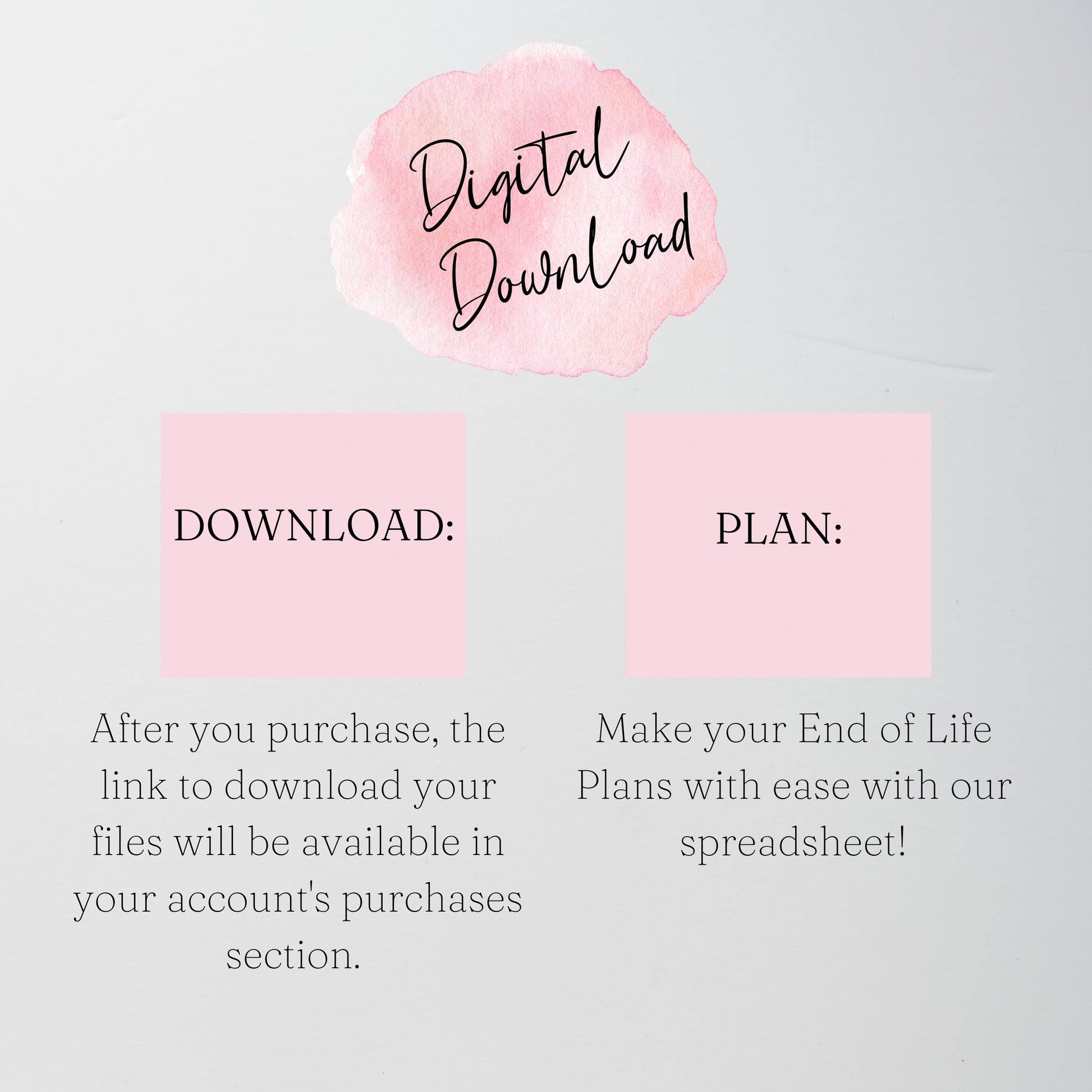 Get organized for the ultimate goodbye with our End of Life Planner Google Sheet Template. Easily plan and prepare for your final farewell with our handy Death Planner. Say goodbye in style, with no stress or fuss. (Death has never been this organized!)