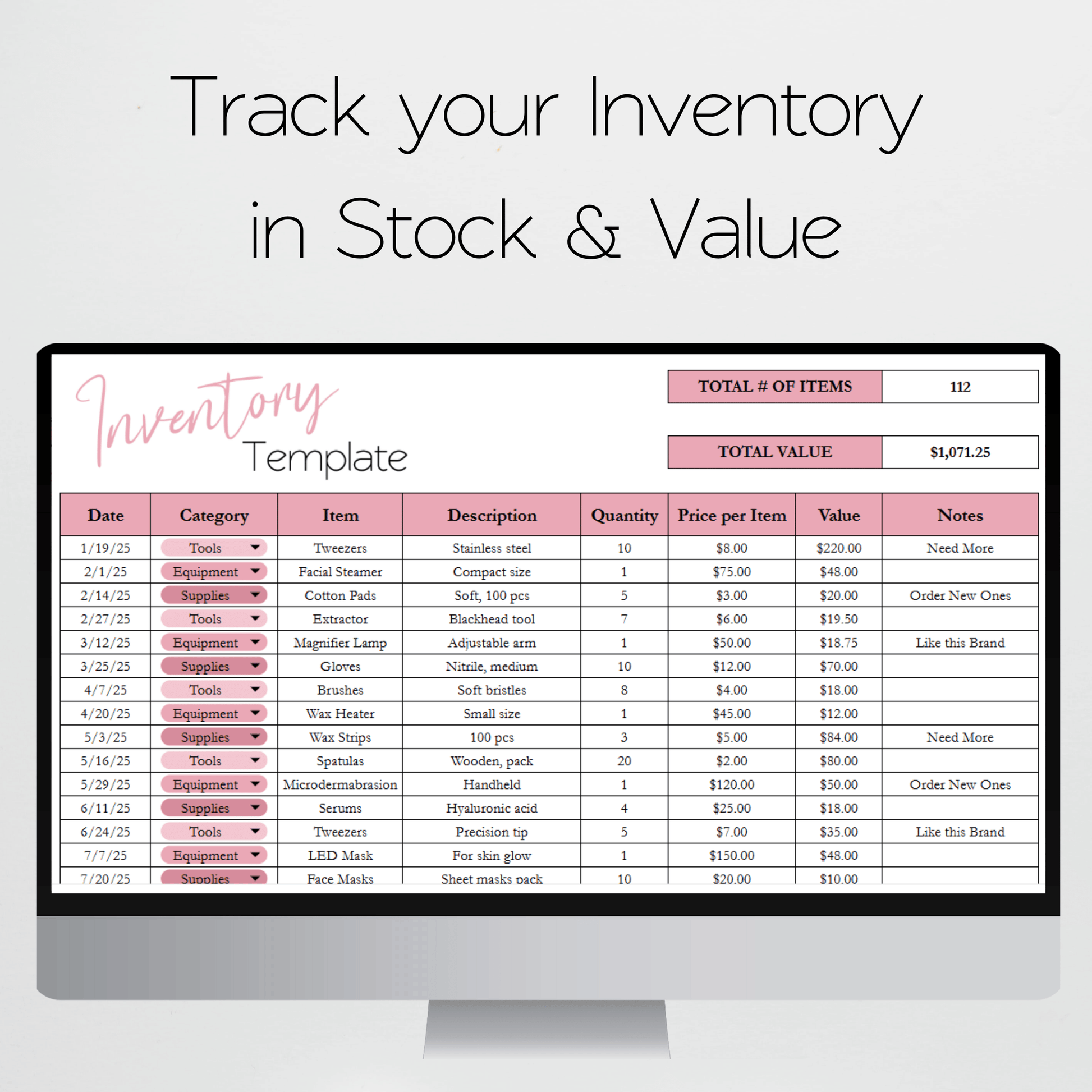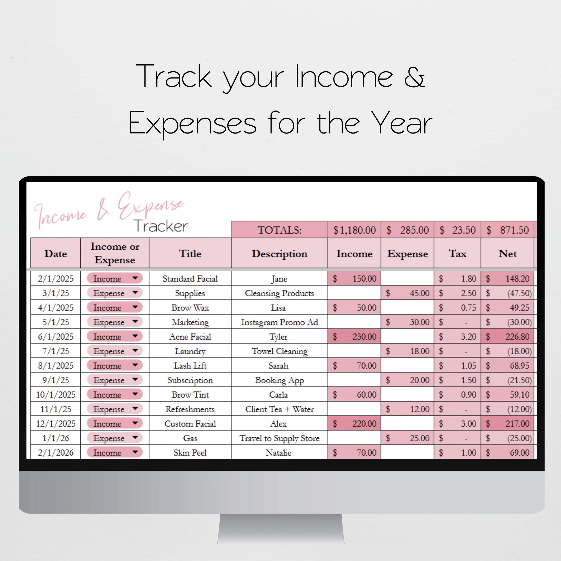 This Esthetician Business Template Bundle includes Google Sheets and Excel spreadsheets to help you organize and manage your beauty business. You can track appointments and payment details to track the facials, lash services, brow treatments, and wax services for your skincare business. You can track your income, expenses, and client information all in one place for your spa business. The client information tracker works as a CRM to track potential clients. You can track your equipment and your inventory for your business. Perfect for estheticians to keep your business organized.
