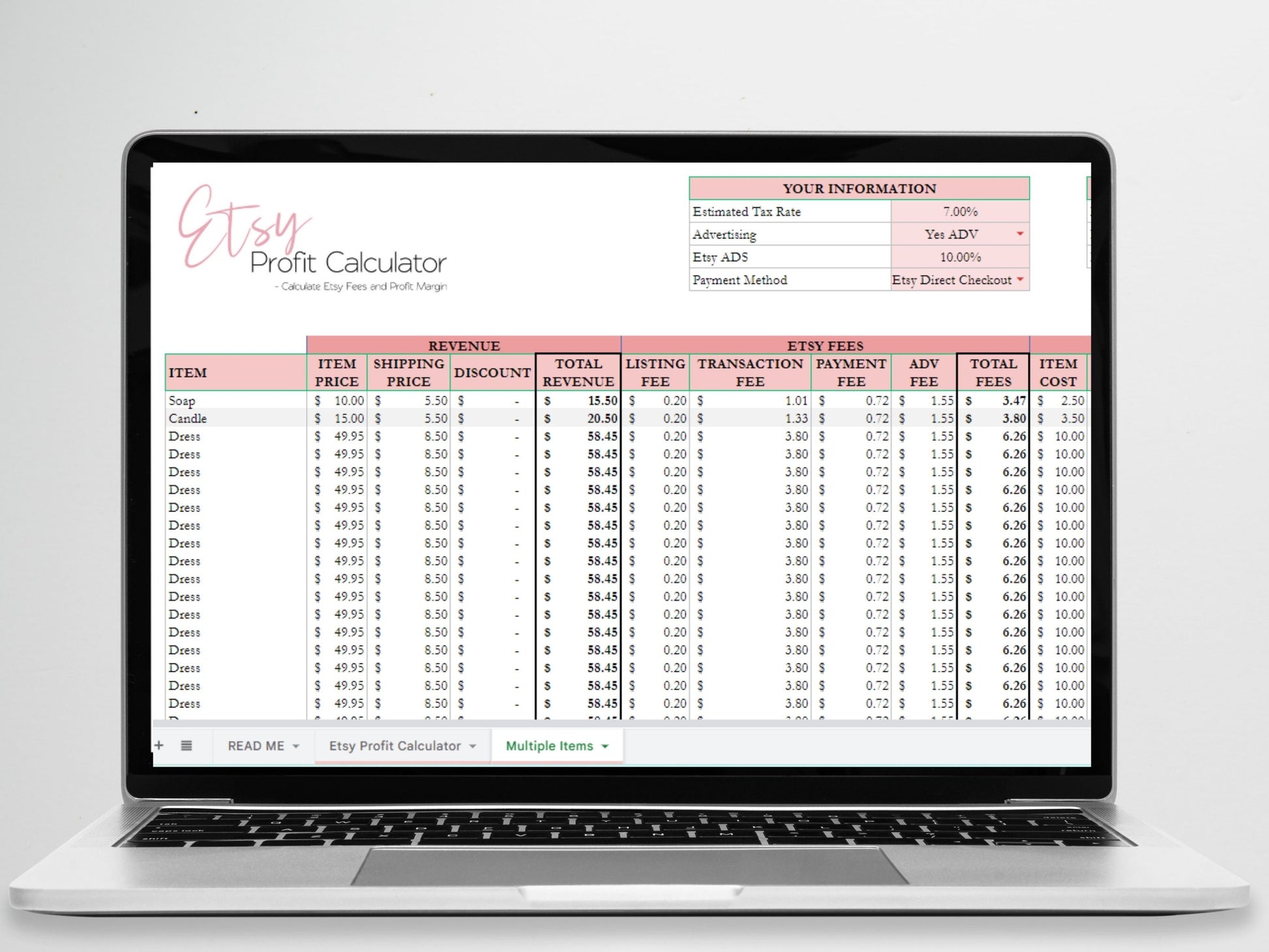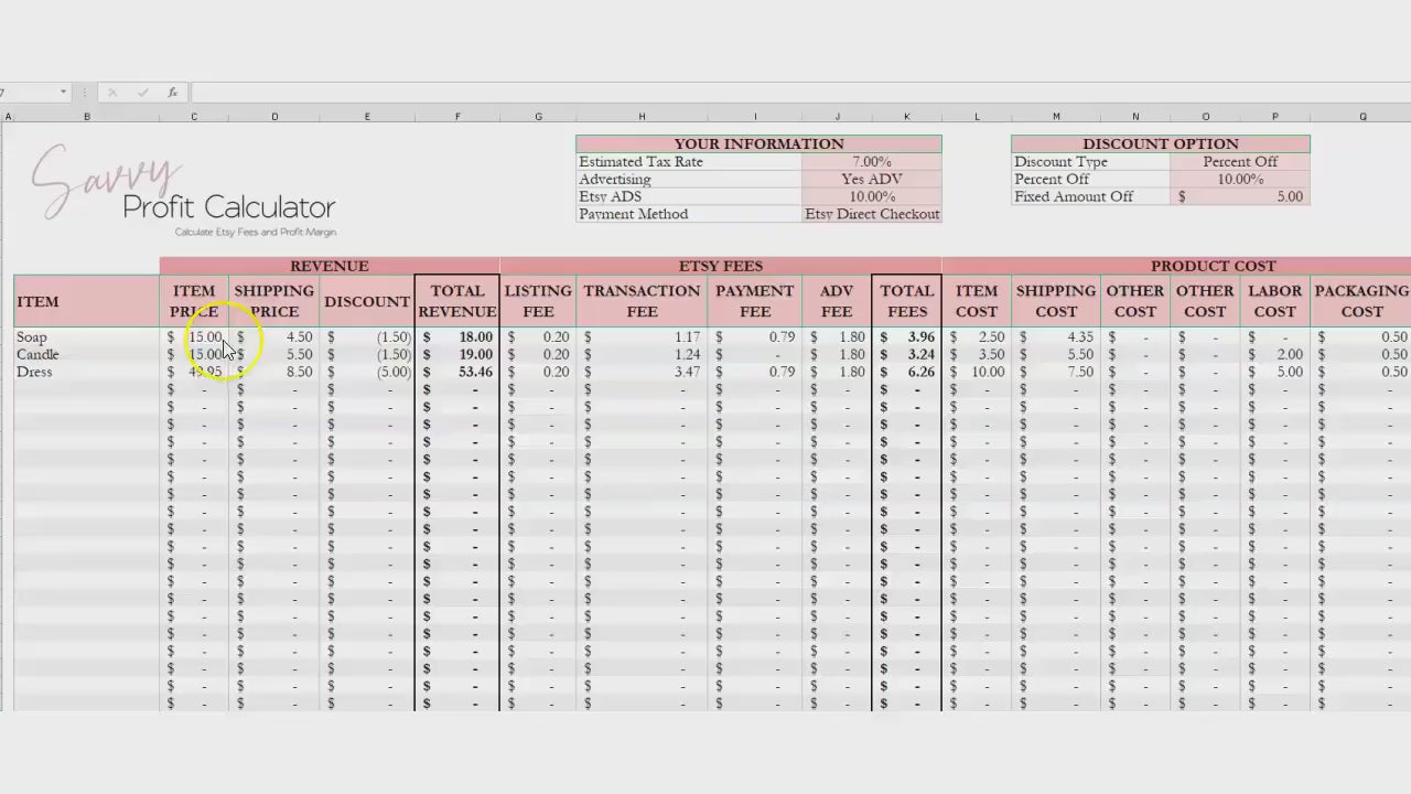 This is an Etsy Profit Calculator Excel spreadsheet to help you calculate your Etsy Fees. You will be able to know your Etsy profit margin for 2023 using this calculator. This spreadsheet is easy to use on Google Sheets or on Excel as a download. Included is video instructionsÂ