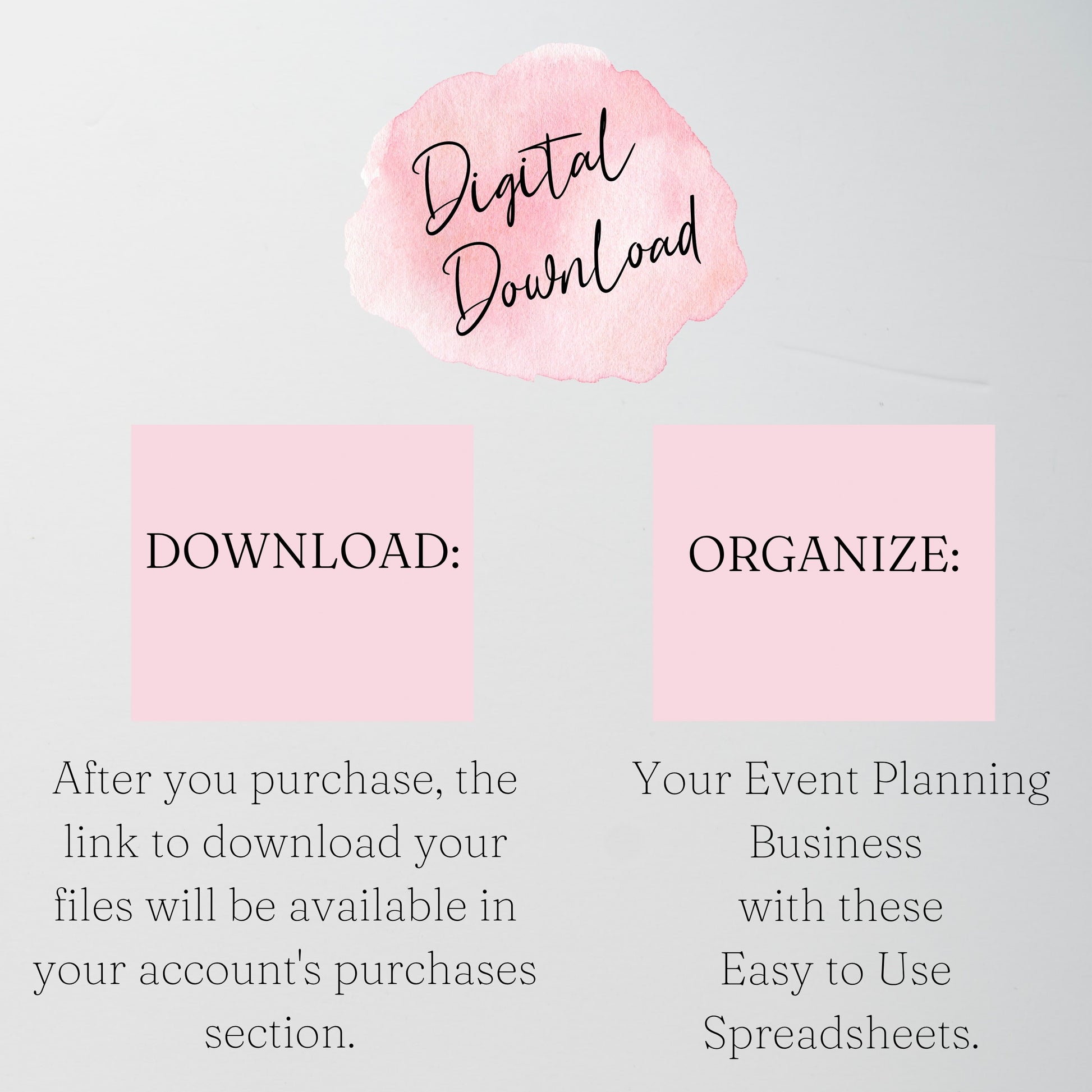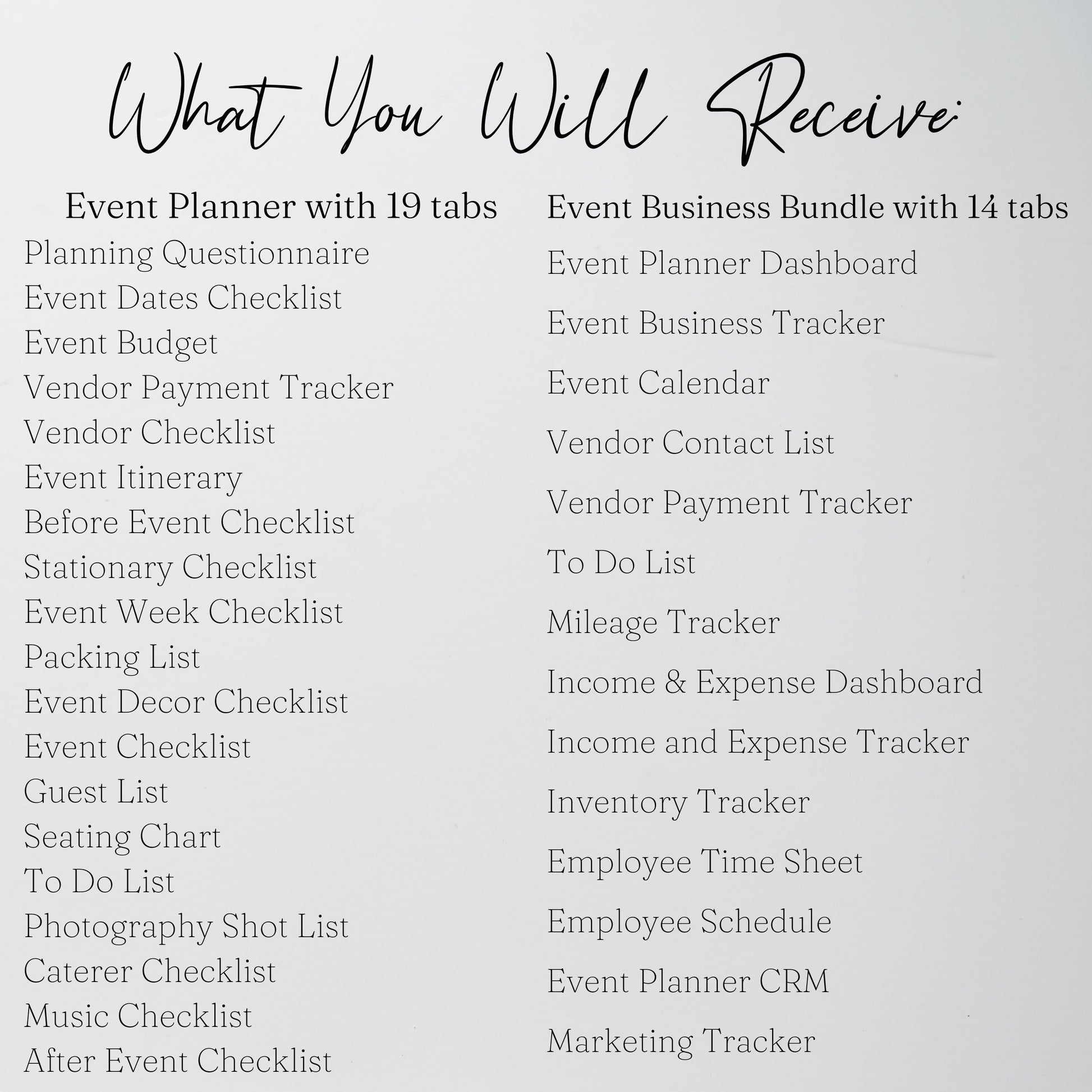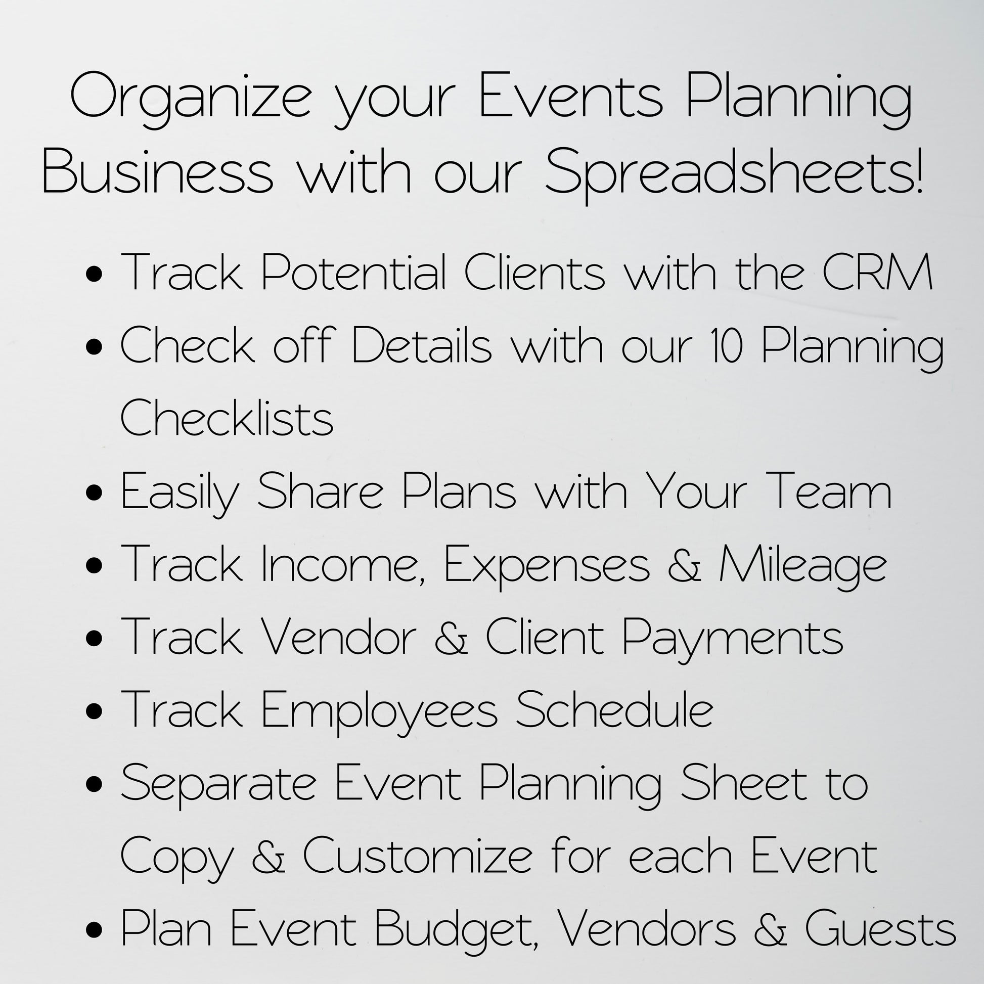 Organize your event planning business with this with this business template bundle. There are 2 spreadsheets with 33 tabs including an event planner, event budget, 10 checklists, and more. Manage your vendors, guests, staff, income and expenses, mileage and more with this sheet. The event planning business bundle has 19 tabs, and the event planner has 14 tabs. The event planner template is great to copy and rename for each event, and is perfect for a wedding planner, corporate event planner, nonprofit event planning, conference planners, and a party planner. Â