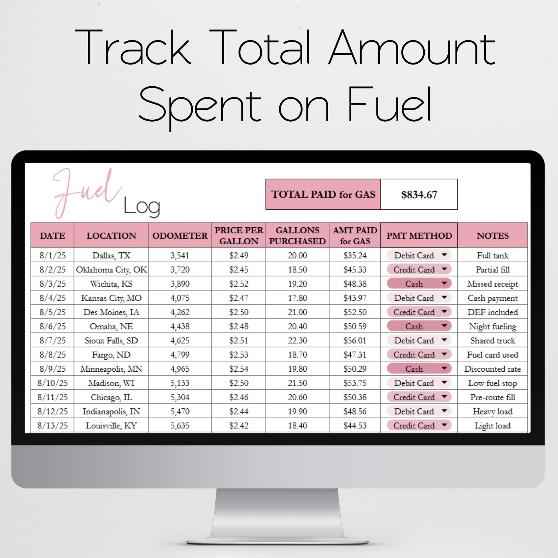 This fuel log template will help you to track the amount of gas that you have put into your car, truck, or vehicle. This gas tracker is perfect if you are a truck driver, and need to track your gas spent. You will love how each this fuel tracker is to use, which is perfect for any driver or trucker to keep track of your expenses. Â