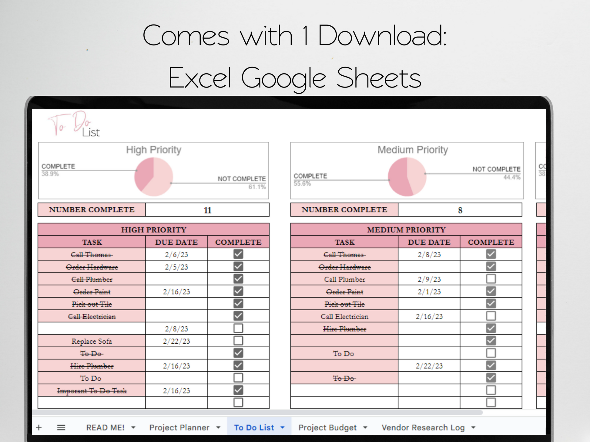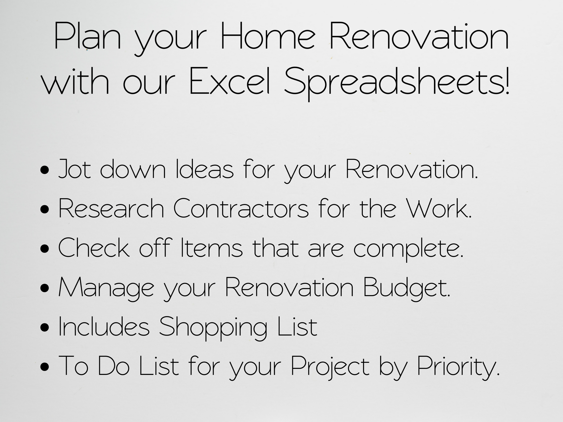 This is an Excel Spreadsheet that helps you to plan a home renovation project. This could be anywhere in your home including the kitchen, bathroom, living room, closet, exterior, interior, bedroom, and garage. This would be a helpful spreadsheet to use if you are an interior designer or business owner.Â