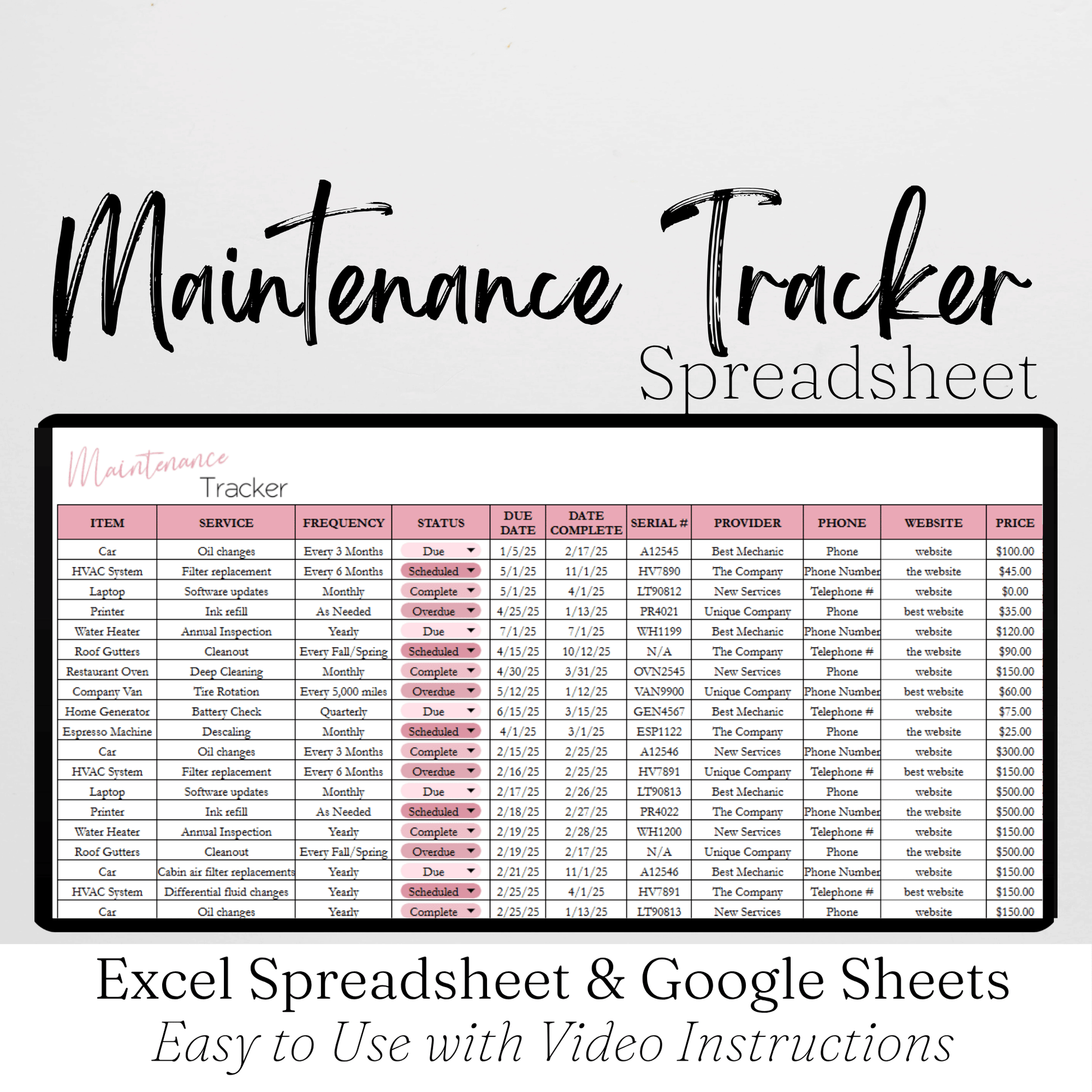 Maintenance Tracker Template for Google Sheets and Excel Spreadsheet