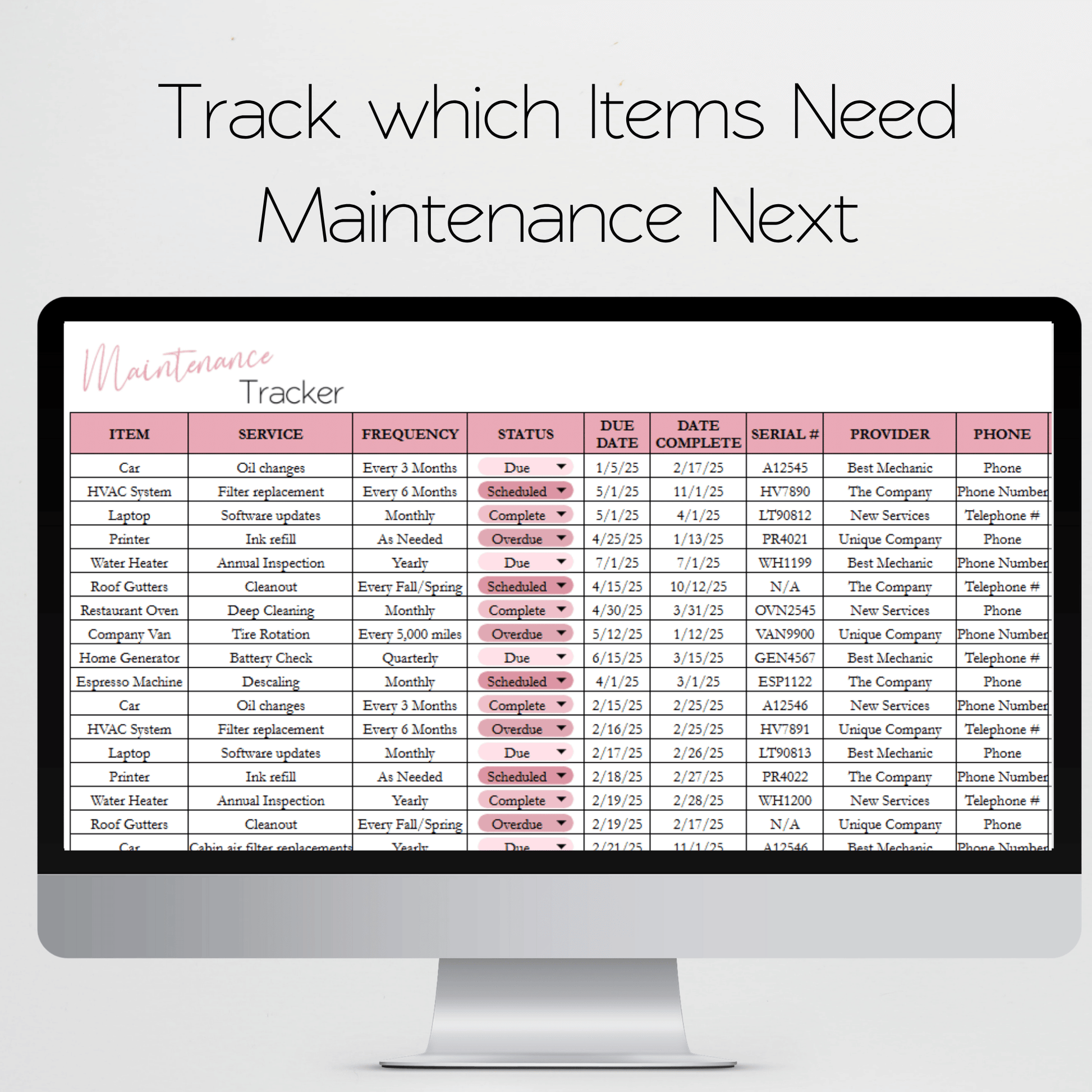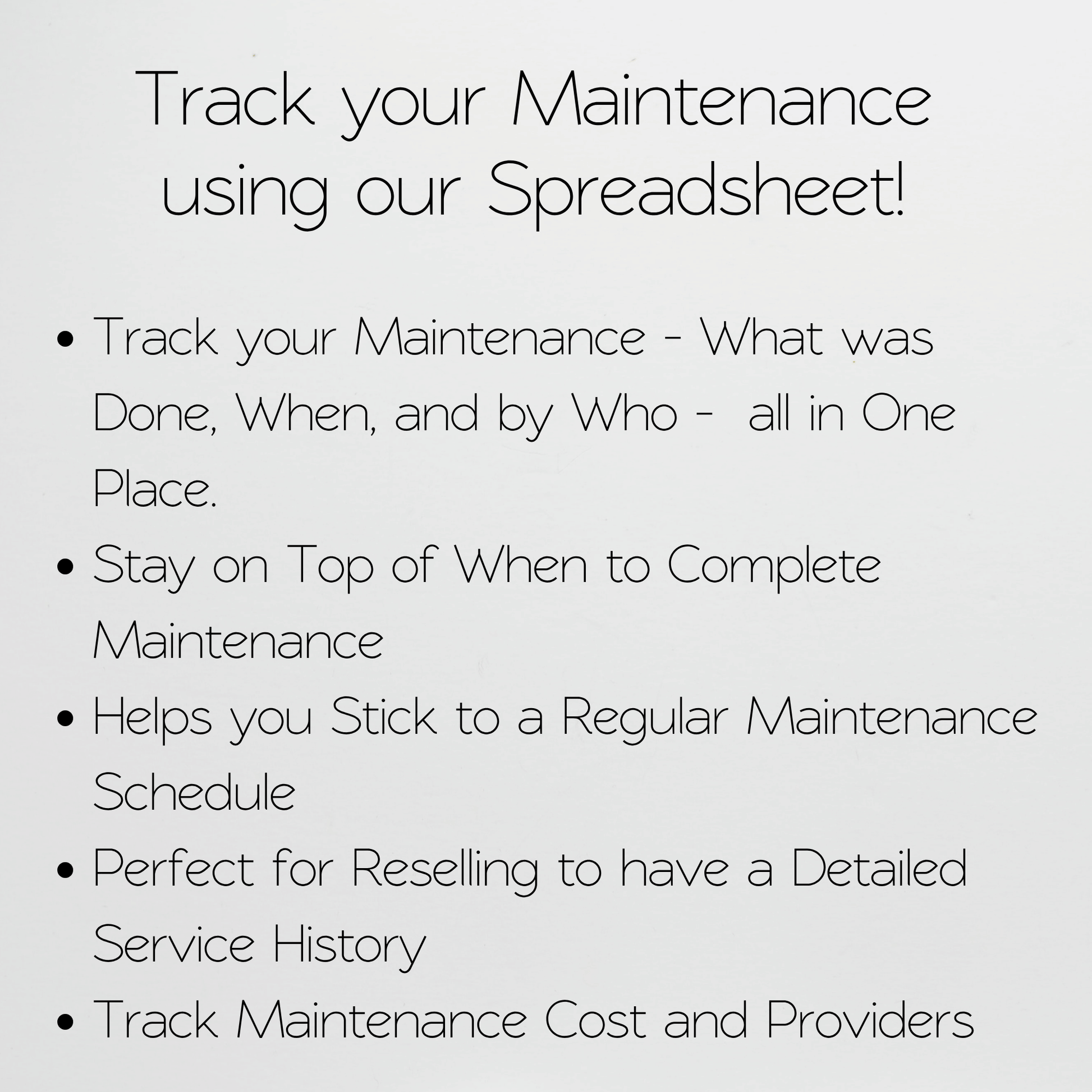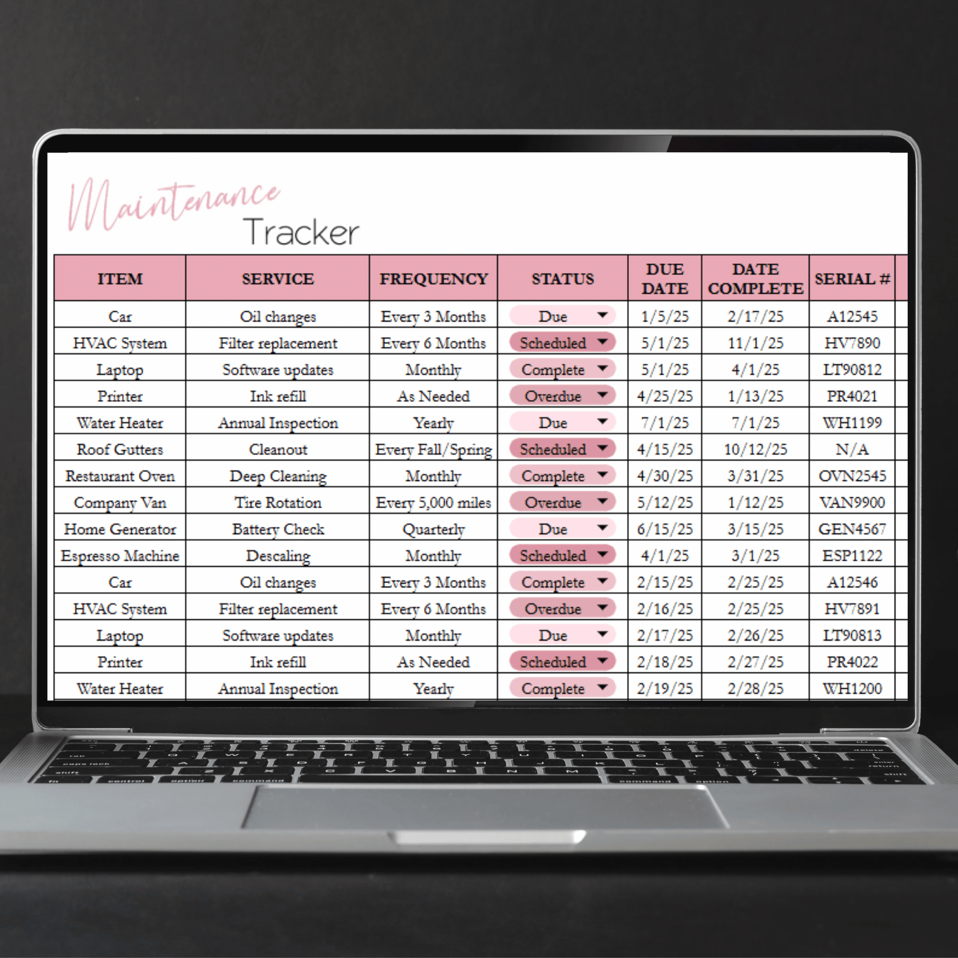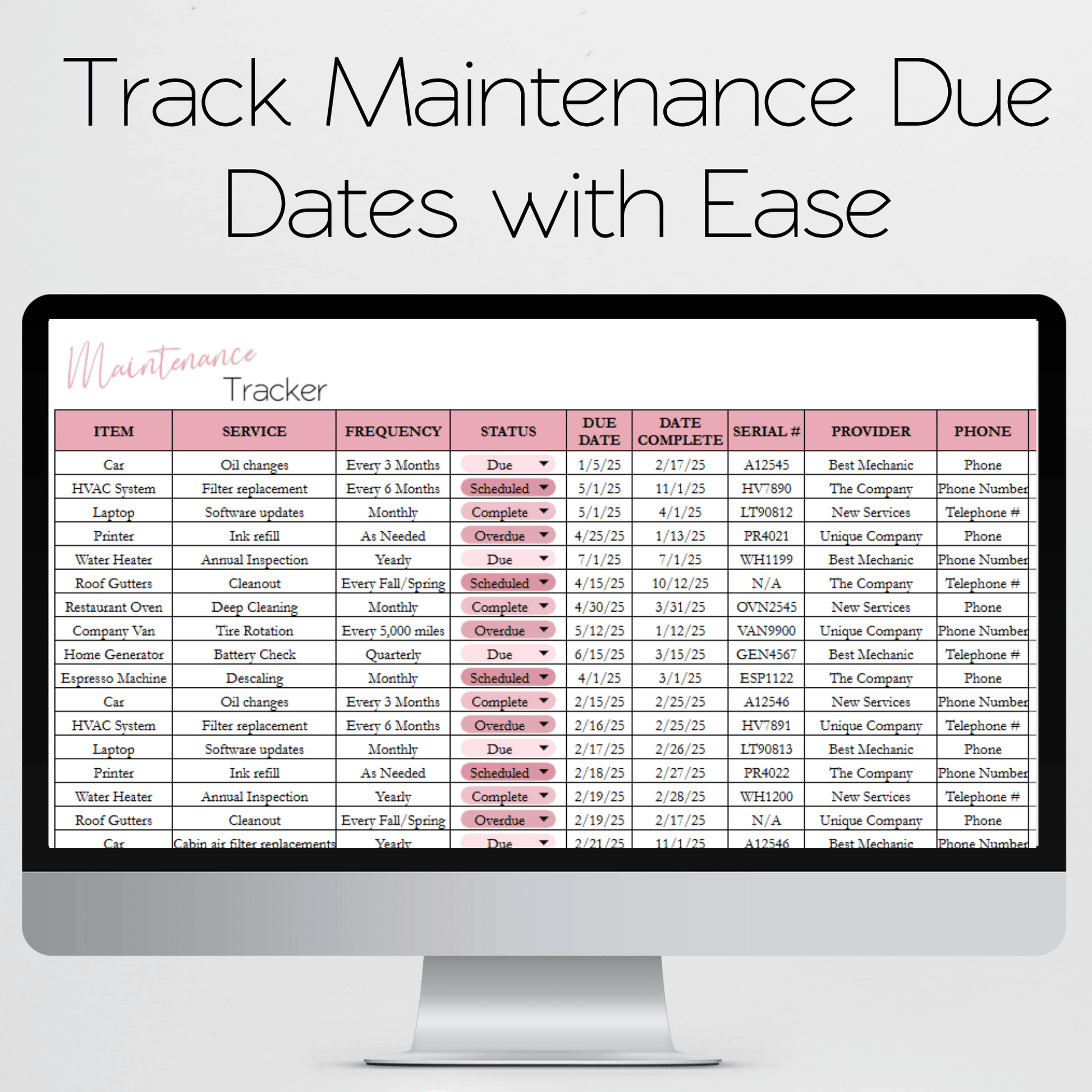 Track and manage maintenance for your cars, machines, and equipment with this maintenance tracker template for Google Sheets and Excel. Stay on top of routine tasks and prevent unexpected breakdowns with this essential tool for work or business. Whether you have sewing machines, heavy duty equipment like cars or tractors, or business equipment like laptops and computers - you can track all of your routine maintenance in this easy to use spreadsheet template.Â