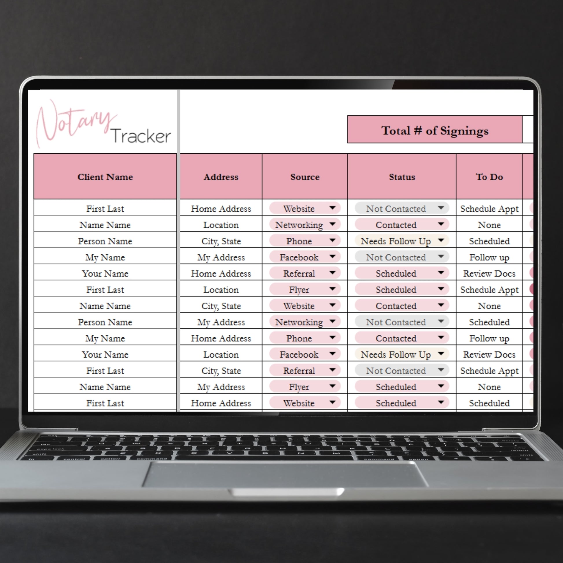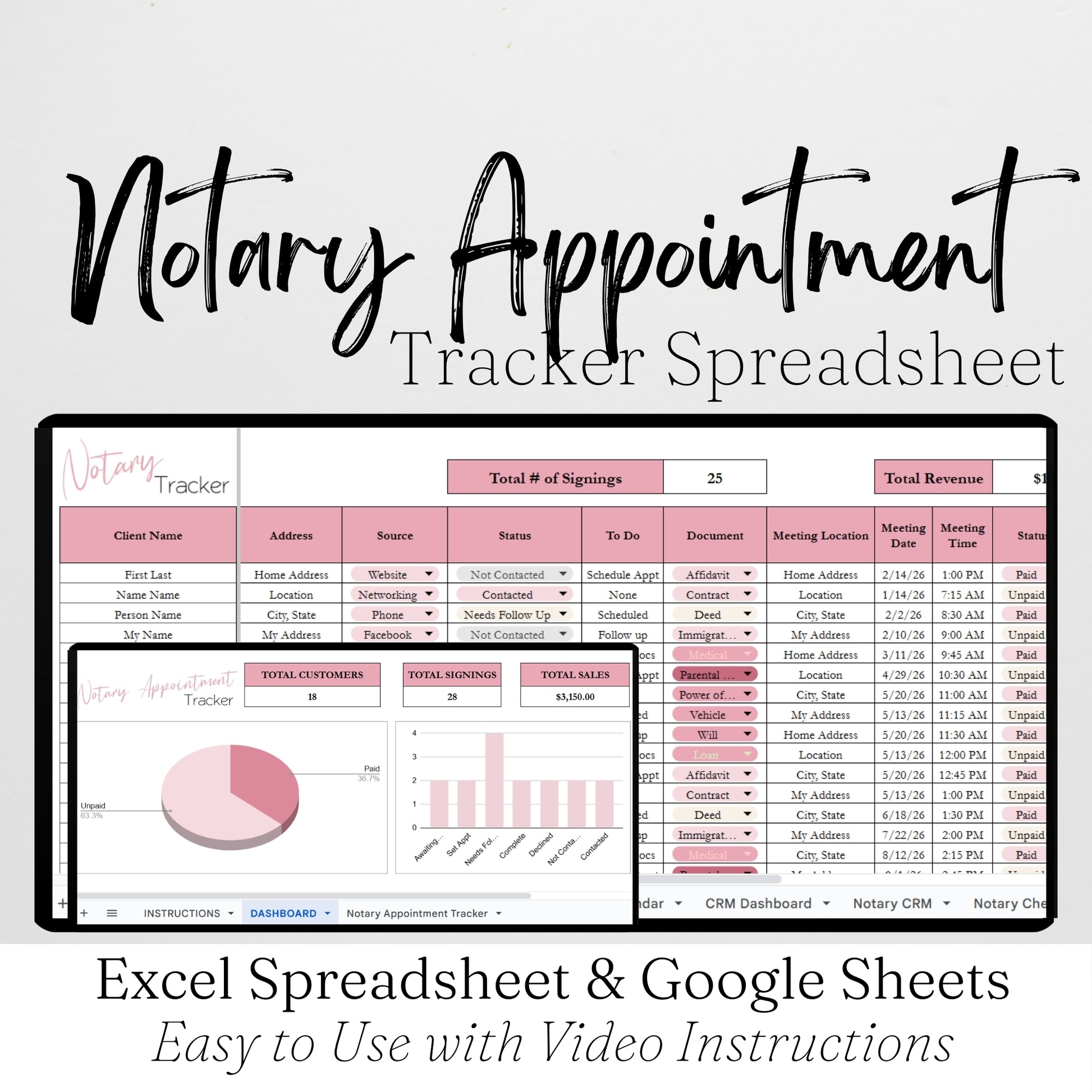 Organize your notary appointments with this notary appointment tracker for Google Sheets and Excel. This notary public appointment template works with Excel Spreadsheet and Google Sheets to track your client contact information, appointment date and time, and revenue made. If you are a mobile notary, apostille, or loan signing agent this notary appointment tracker is perfect for you.Â