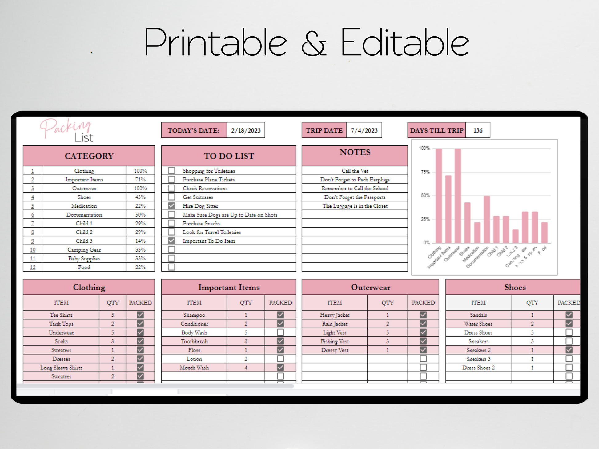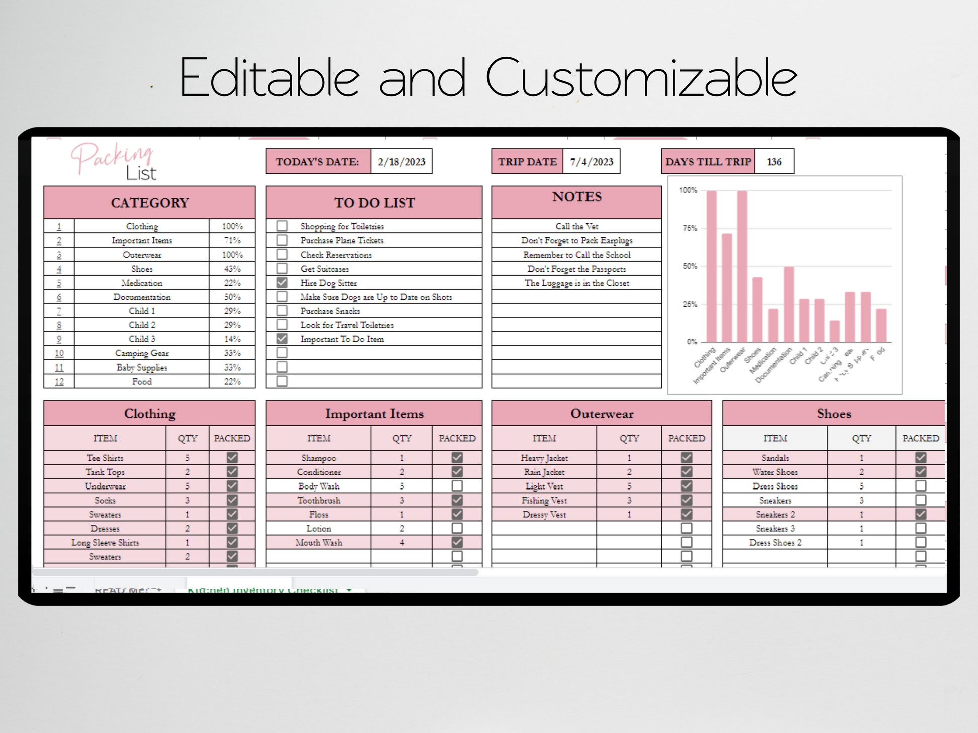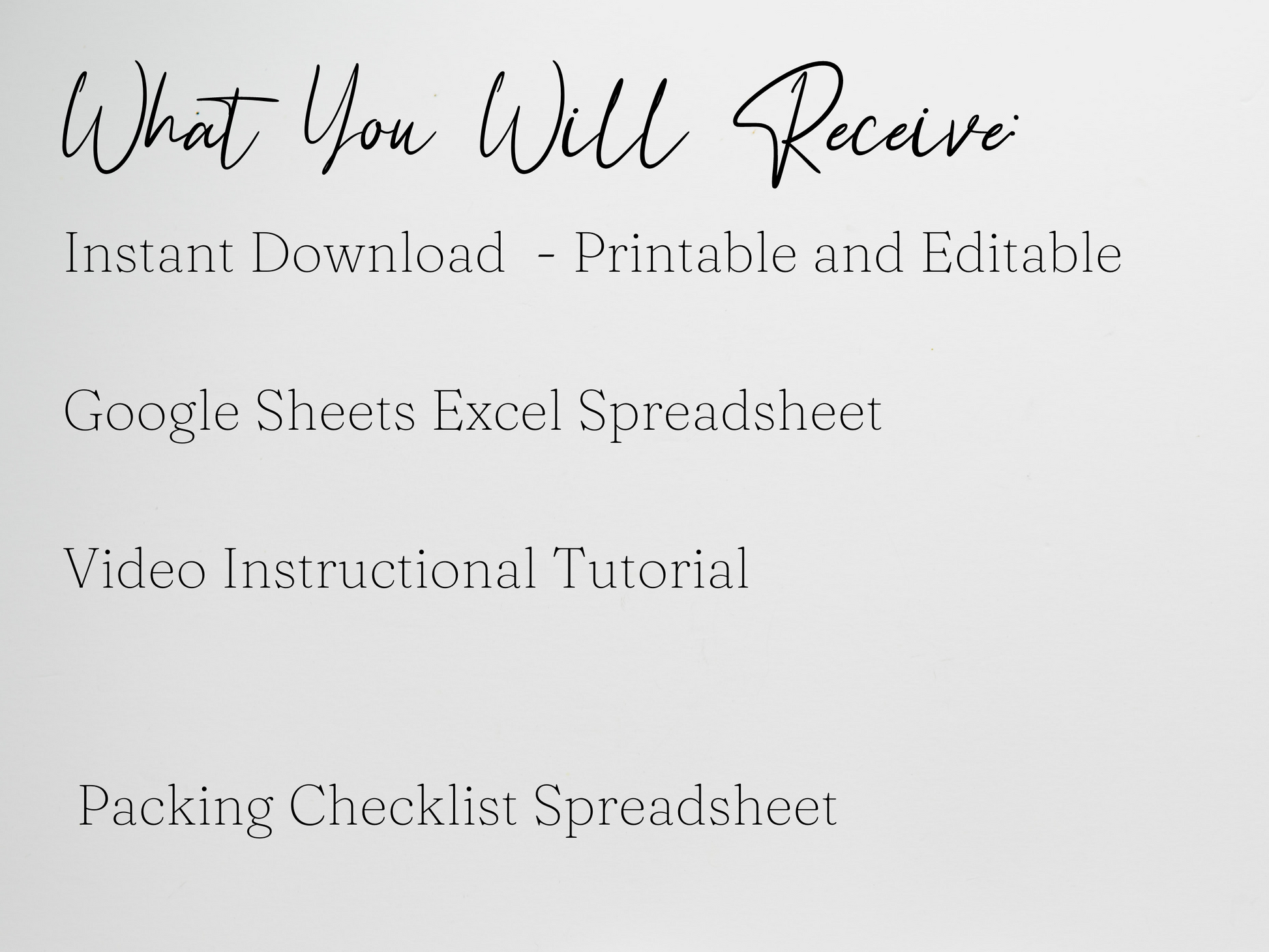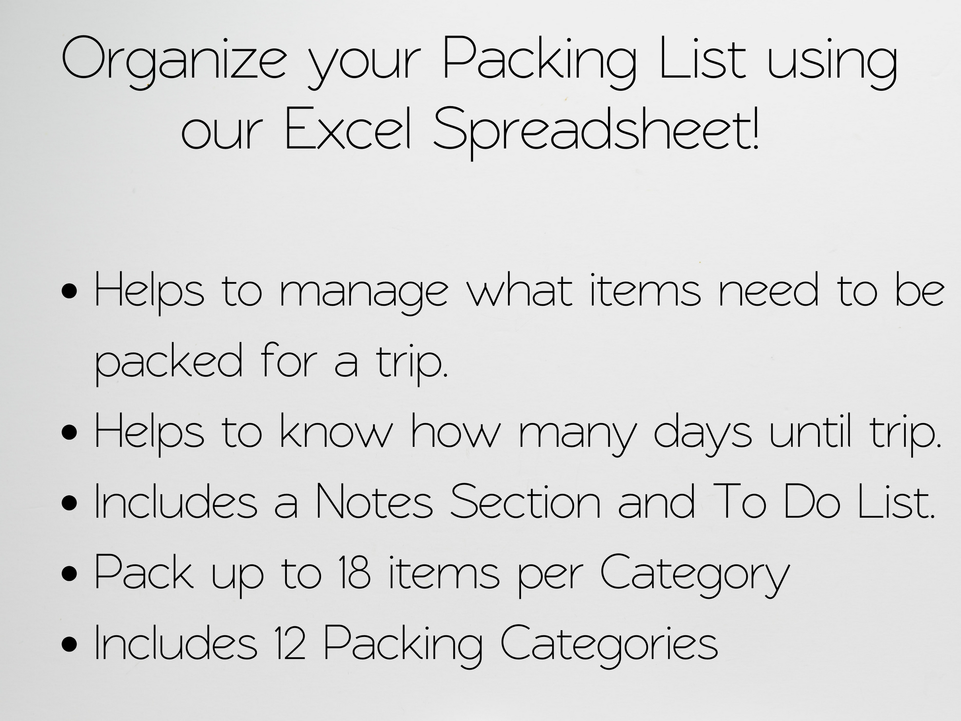 This is an Excel Spreadsheet that helps you to create and manage a packing checklist for any type of vacation or trip, whether it's to Europe, the beach, Hawaii, camping, travel, for kids, Mexico, a cruise, a bachelorette party, Orlando, Italy, or more! Our excel spreadsheet allows you to input all the items you need to pack and mark them off as you go. Stay organized and ensure you don't forget anything important with our packing checklist spreadsheet.