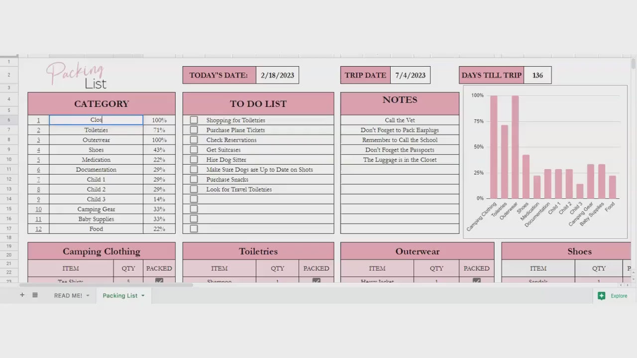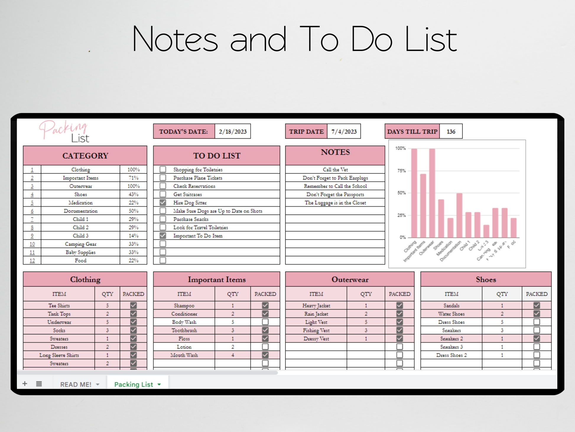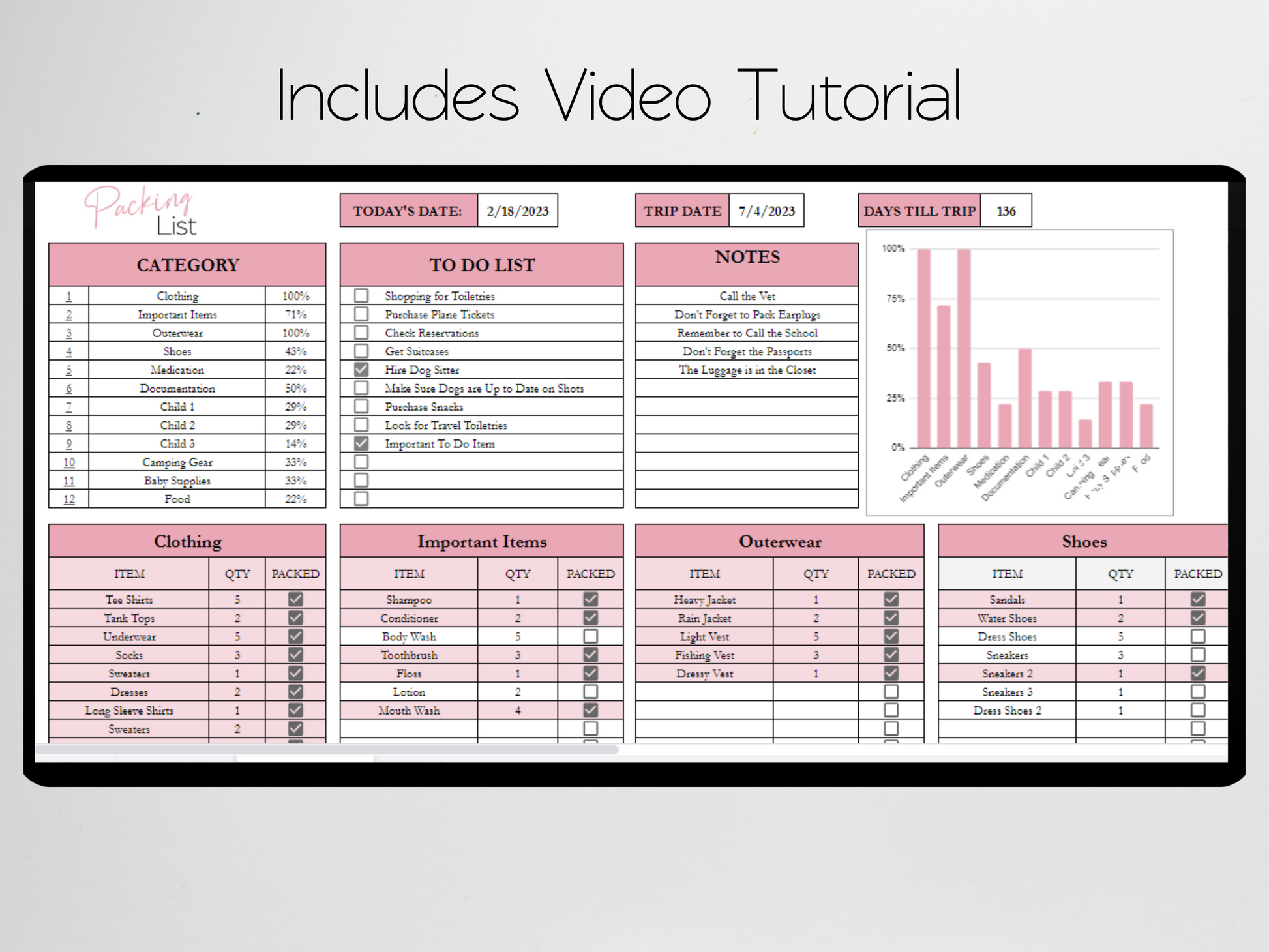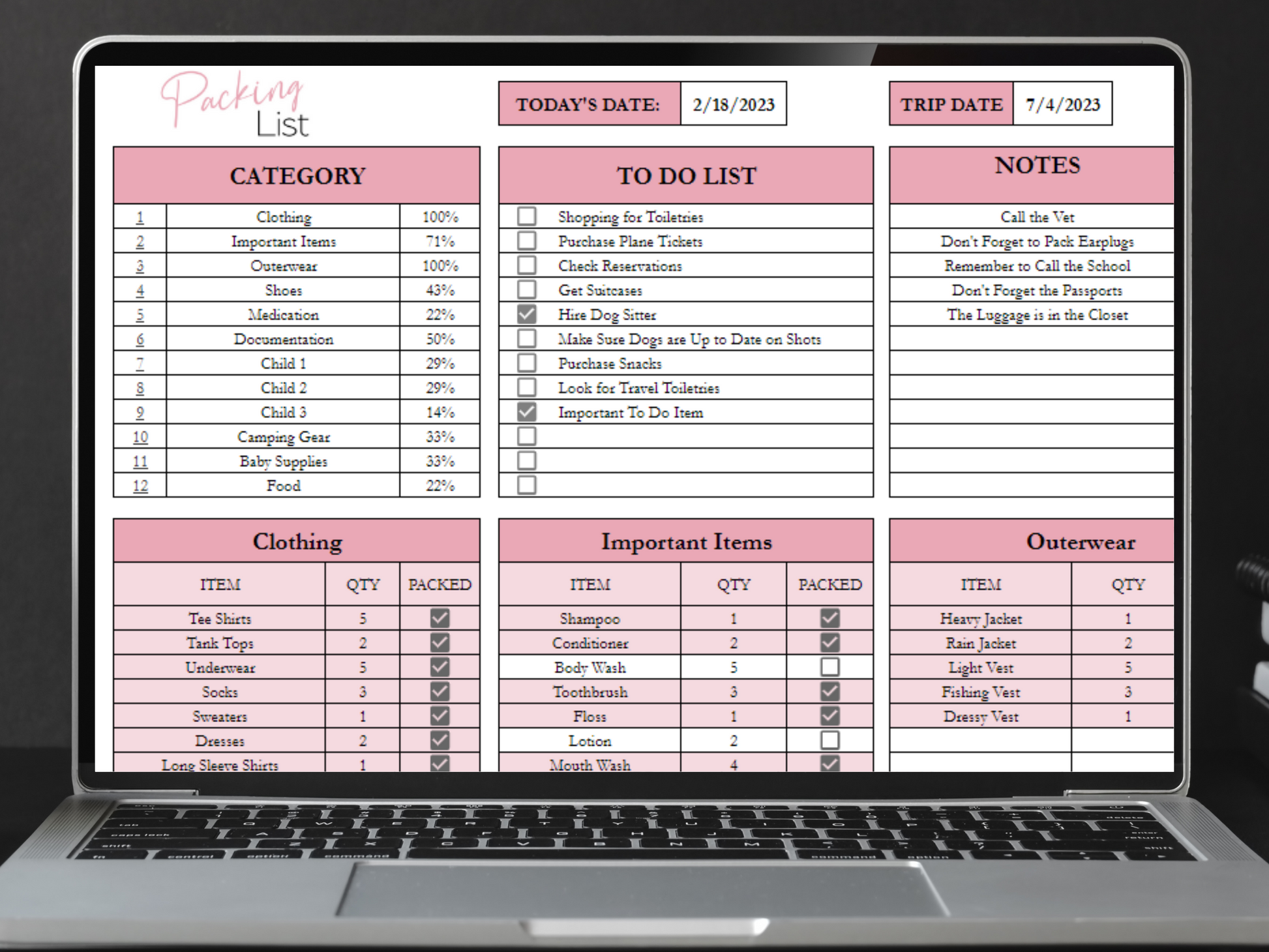 This is an Excel Spreadsheet that helps you to create and manage a packing checklist for any type of vacation or trip, whether it's to Europe, the beach, Hawaii, camping, travel, for kids, Mexico, a cruise, a bachelorette party, Orlando, Italy, or more! Our excel spreadsheet allows you to input all the items you need to pack and mark them off as you go. Stay organized and ensure you don't forget anything important with our packing checklist spreadsheet.
