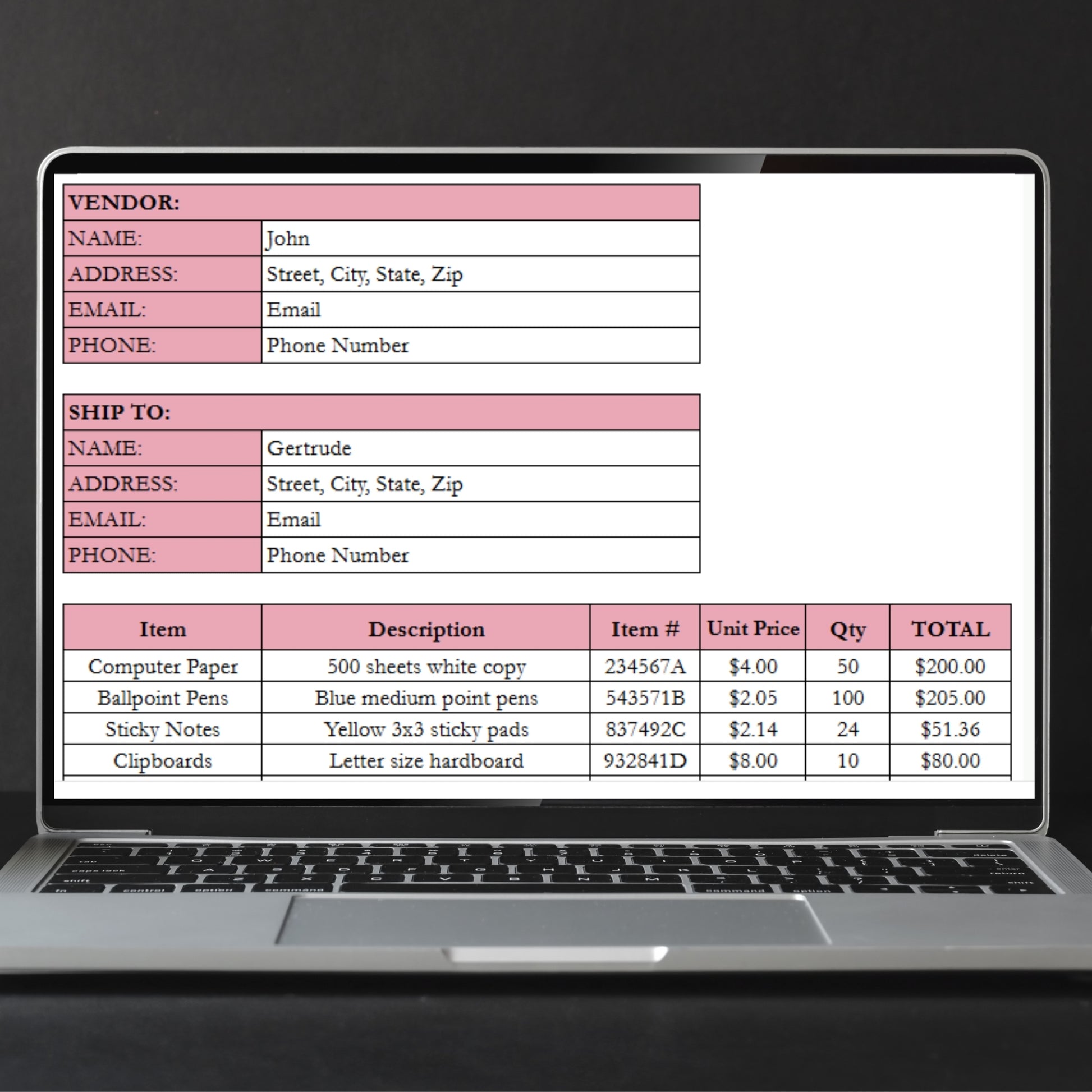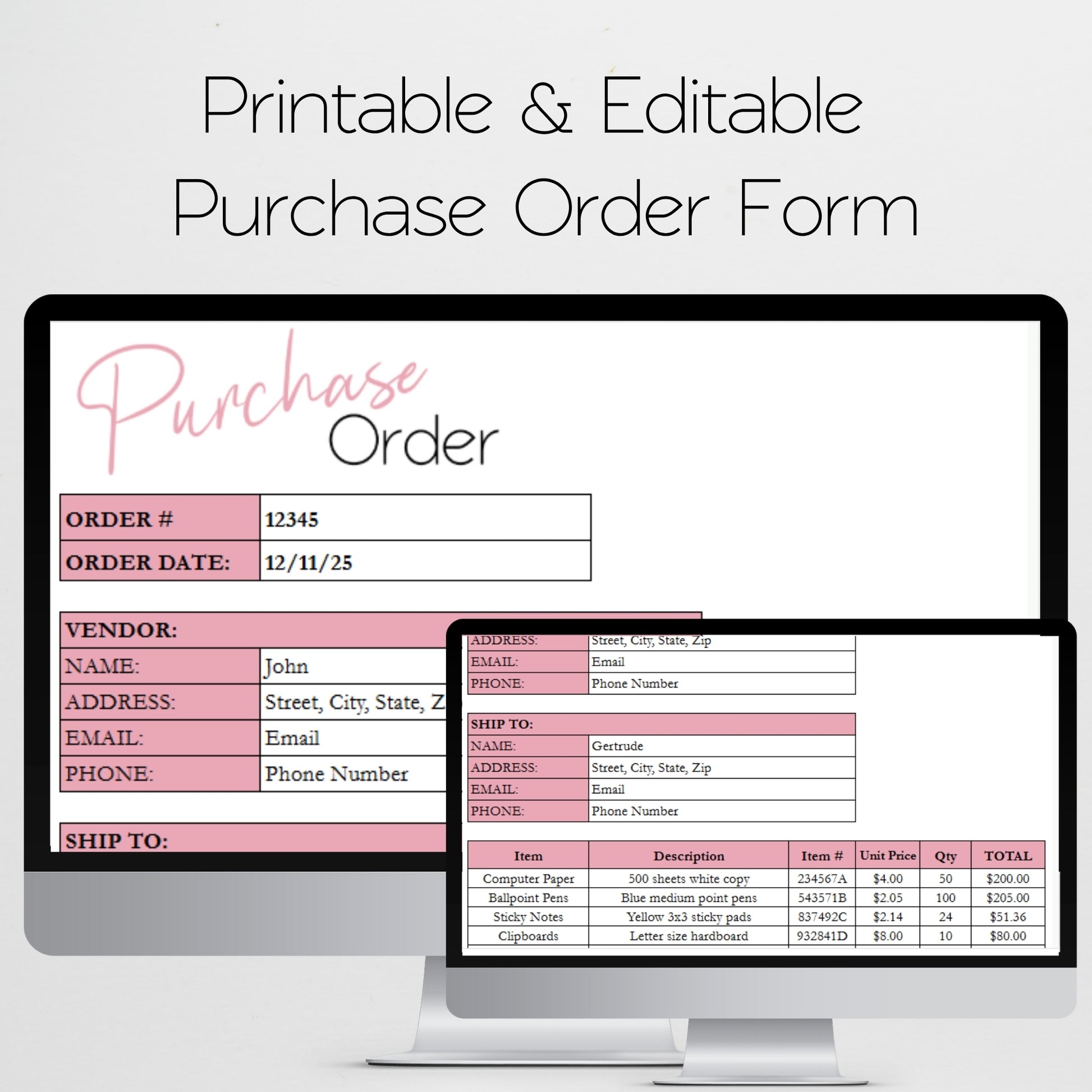 Track your purchases made for your business with this printable and editable purchase order form template. This template works in both Google Sheets and Excel and helps you track vendor contact information, track items purchased with pricing details. You can monitor order status from the date ordered to delivery. You can also track the total number of expenses paid with purchases. This purchase order template is perfect for small business owners to stay organized with your suppliers and expenses paid.Â