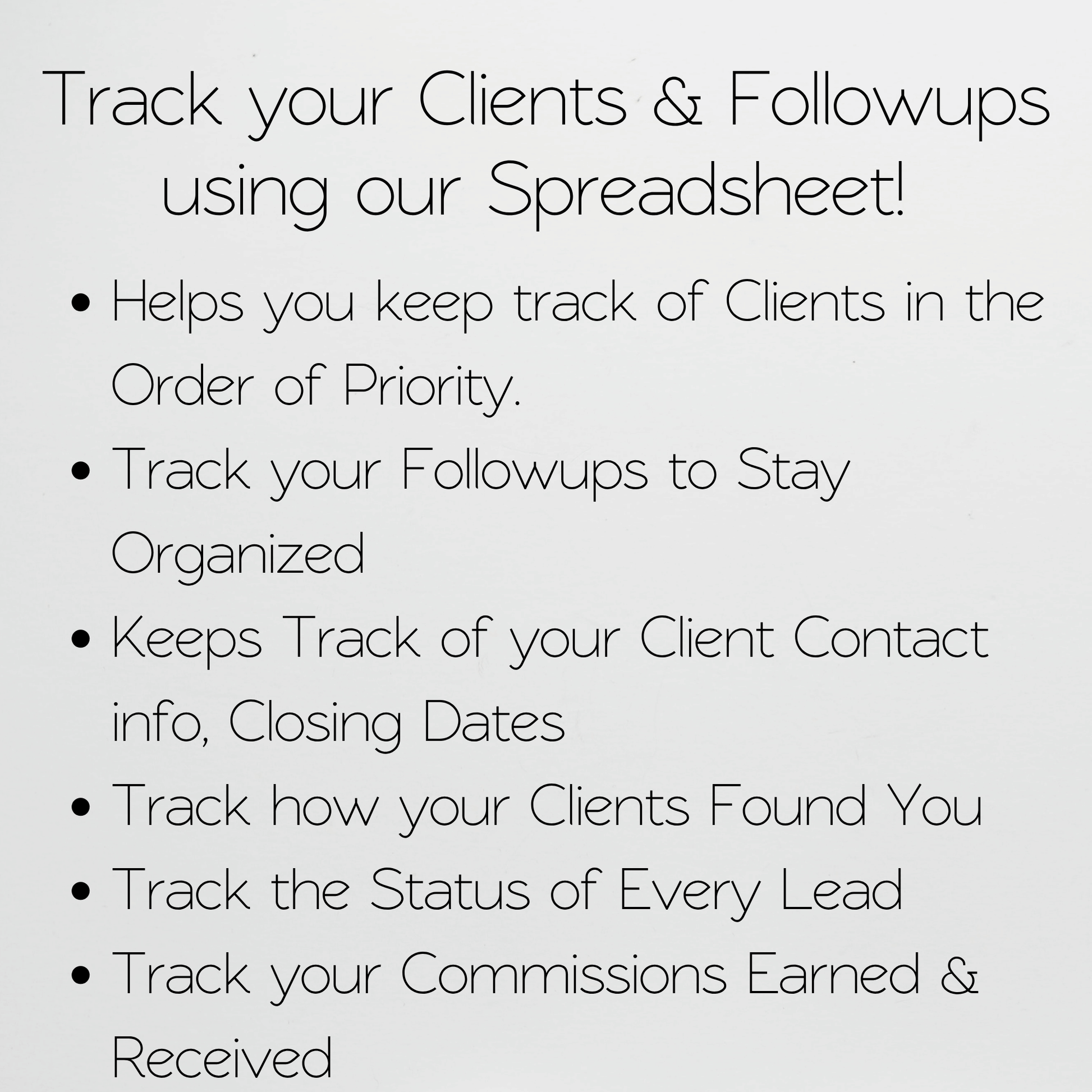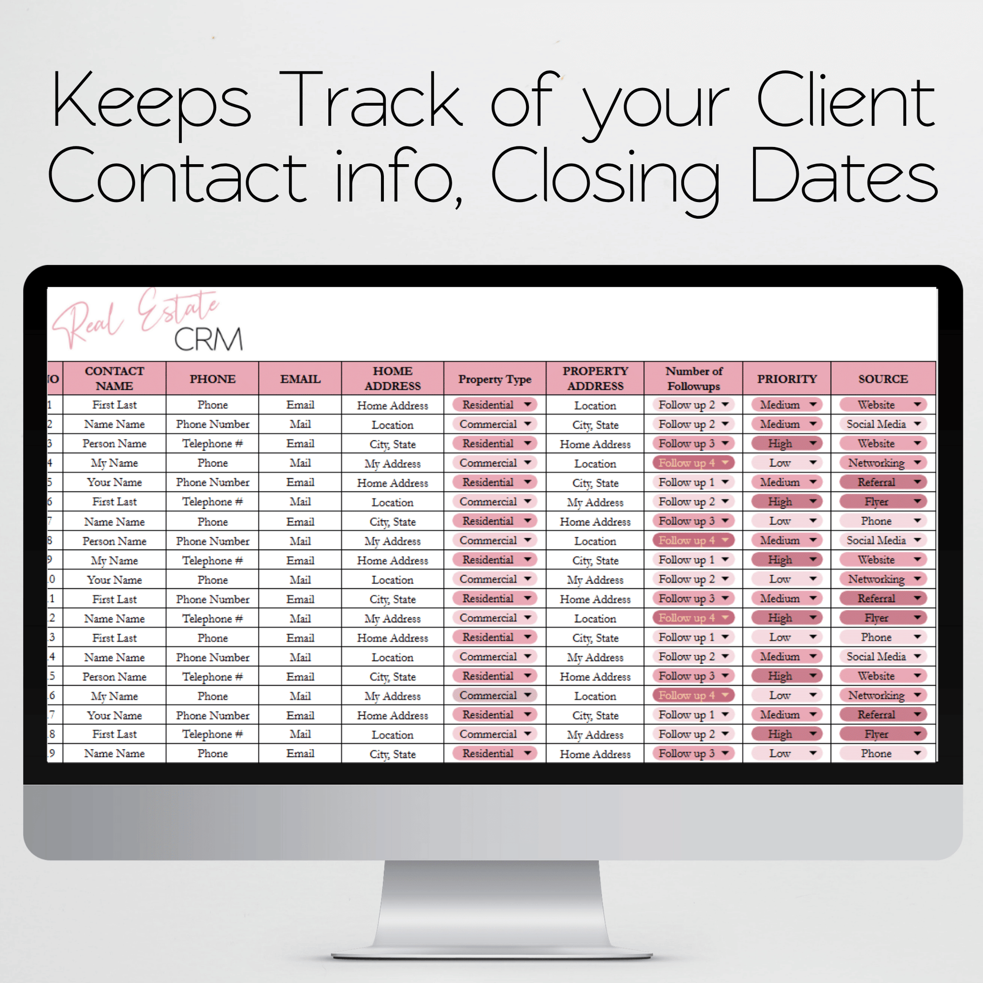 This is an Excel Spreadsheet that helps you keep track of your business clients throughout the buying and selling process. Using our spreadsheet, you can easily monitor each step of the real estate closing process and ensure that nothing falls through the cracks. Stay organized and on top of your business with our real estate CRM spreadsheet.Â