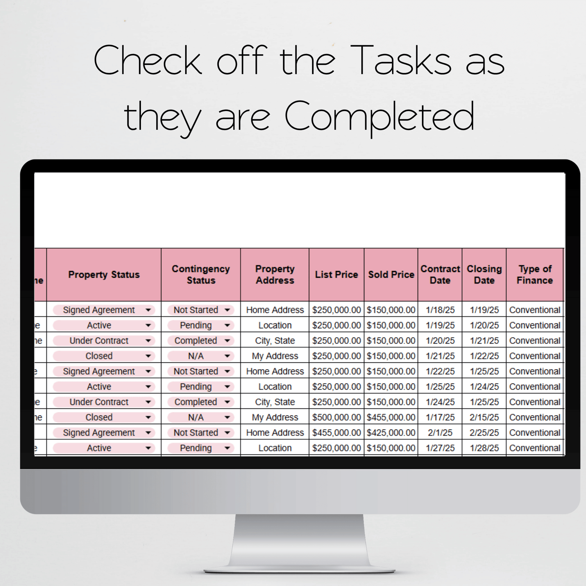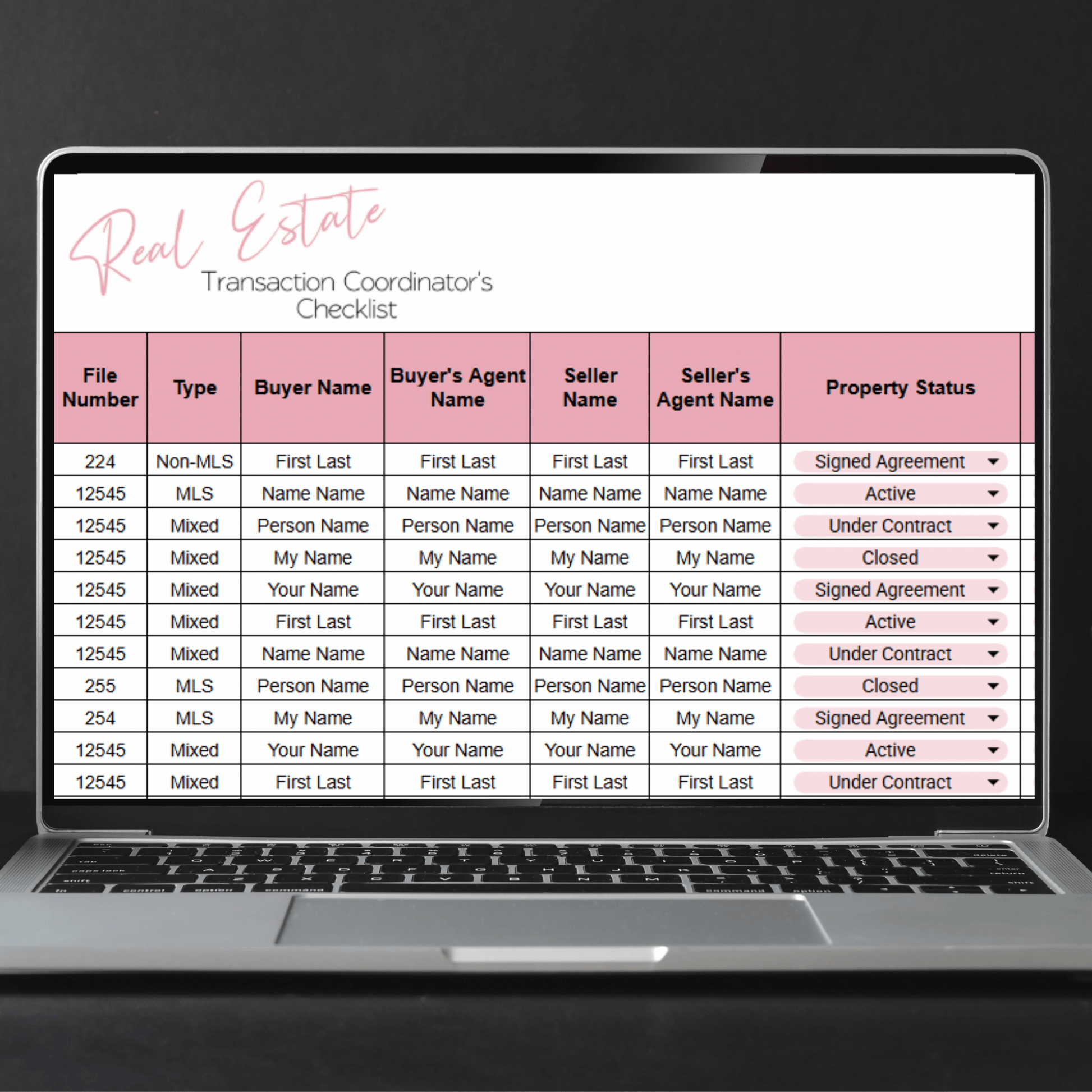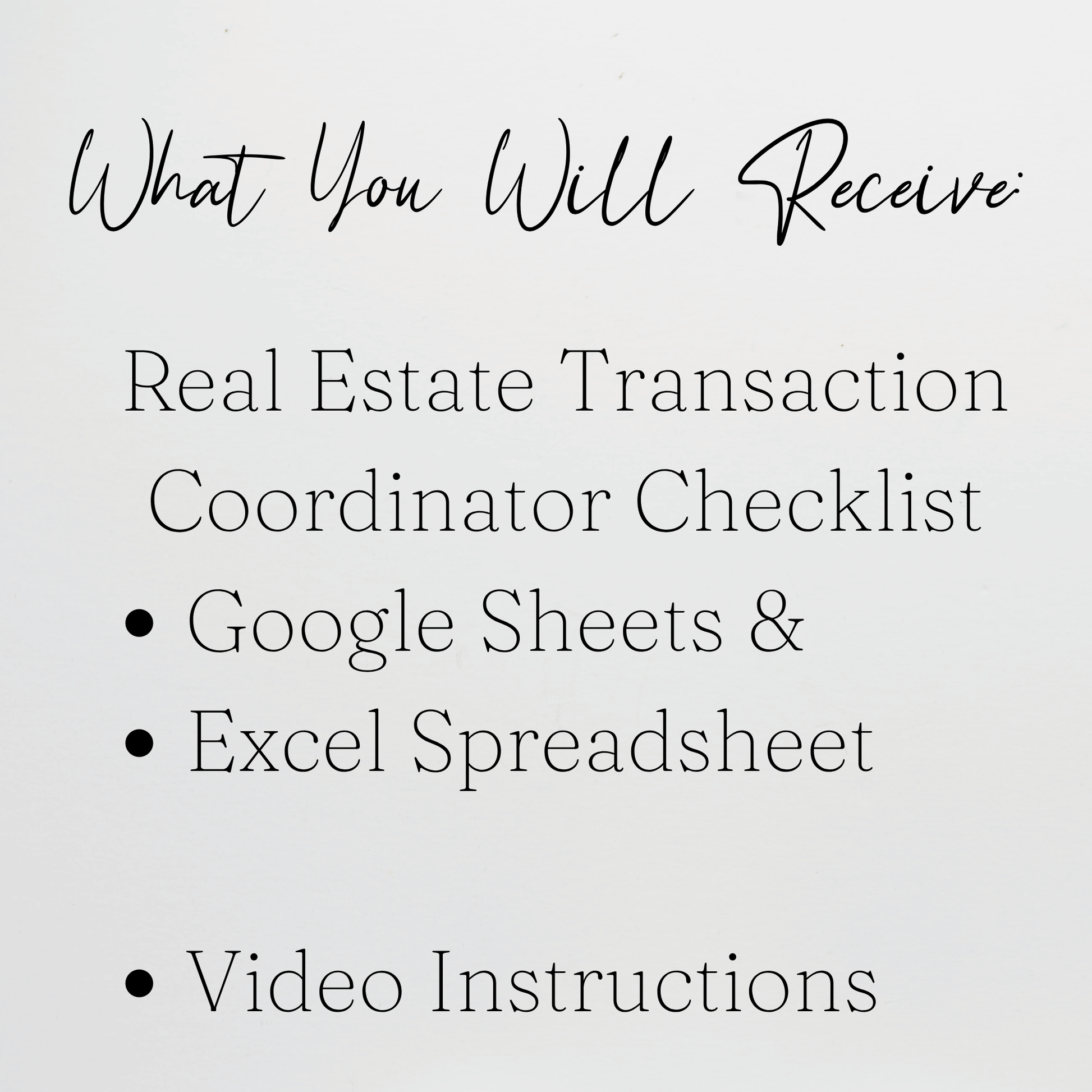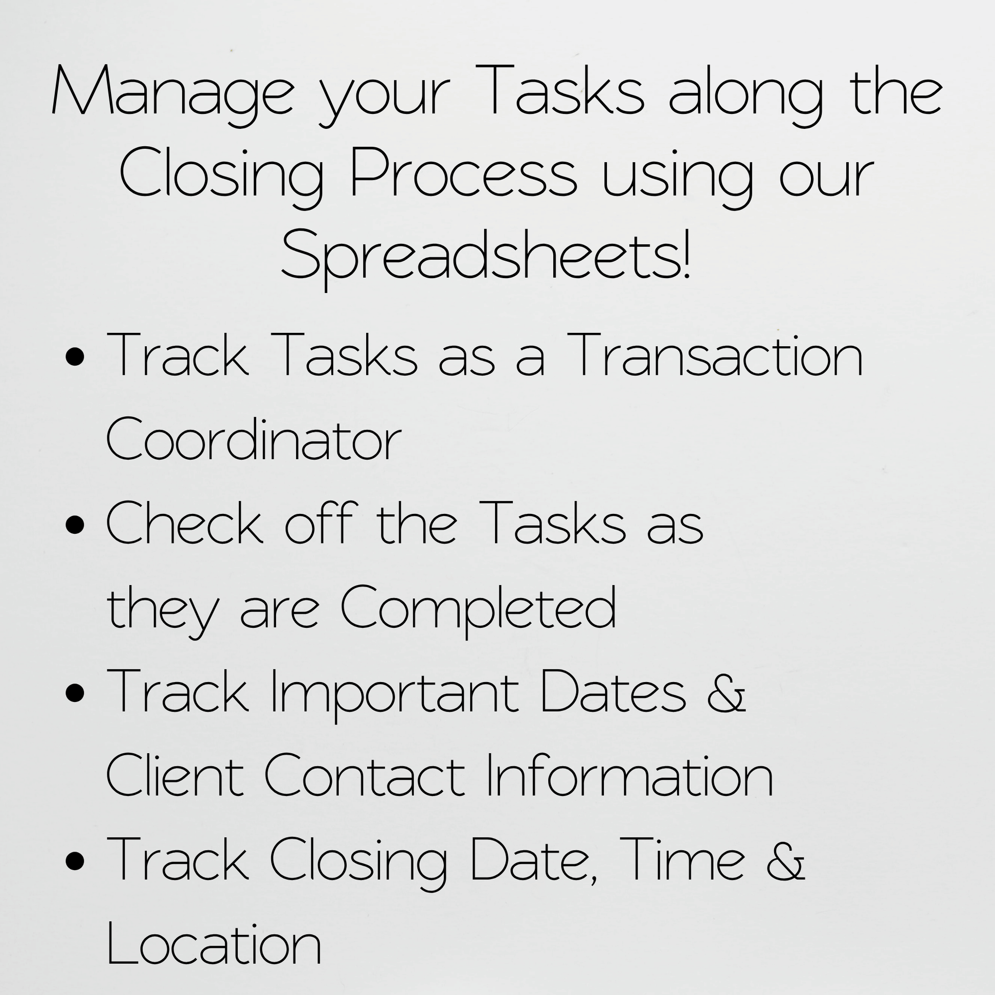 This is an Excel Spreadsheet that helps a real estate transaction coordinator to check off all the items along the buying and selling process to keep track of dates, names, important items, closing dates, and more!