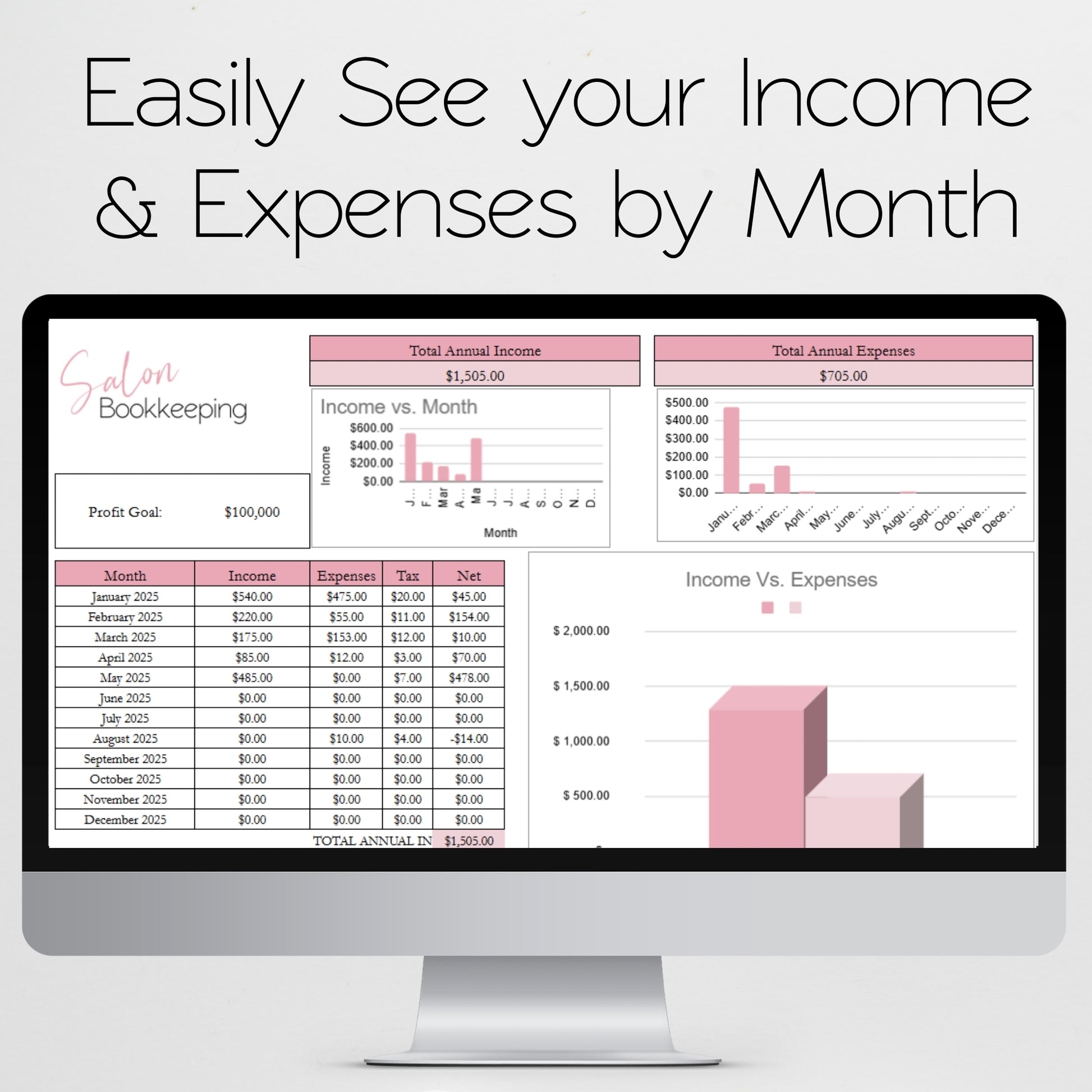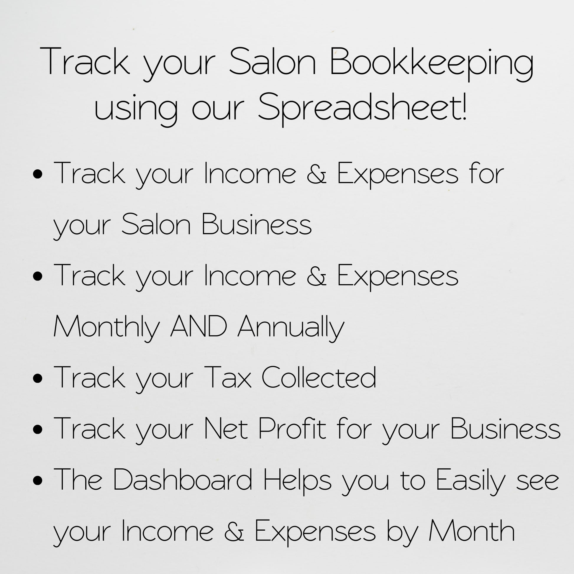 This salon bookkeeping template will help you to track your income and expenses annually for tax purposes. This is perfect if you have a nail salon or hair salon and want to manage your monthly income.