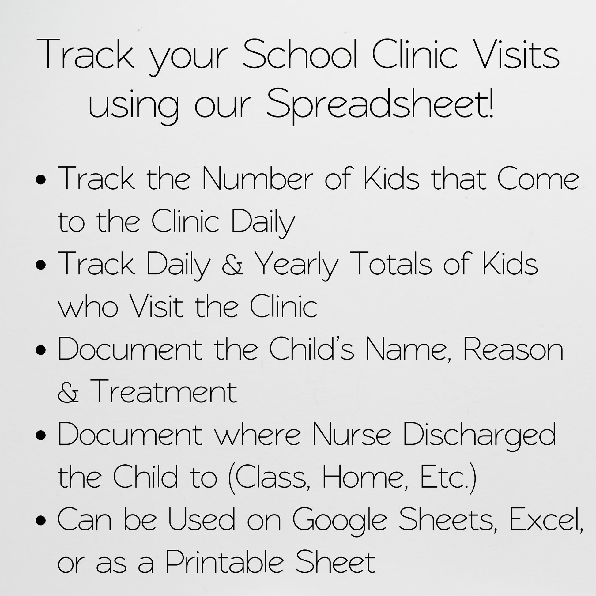 If you are a nurse in a school clinic, then this school nurse visit log template is perfect to track the number of children who have visited the clinic. You can also document the child's name, reason for visit, treatment provided, and where they were discharged (classroom, home, EMS). This spreadsheet template works in Google Sheets, Excel, or as a printable sheet. This is perfect to track the patients who come to visit the clinic to have good recordkeeping as well as tracking the number of kids who have seen you in the clinic daily and yearly.