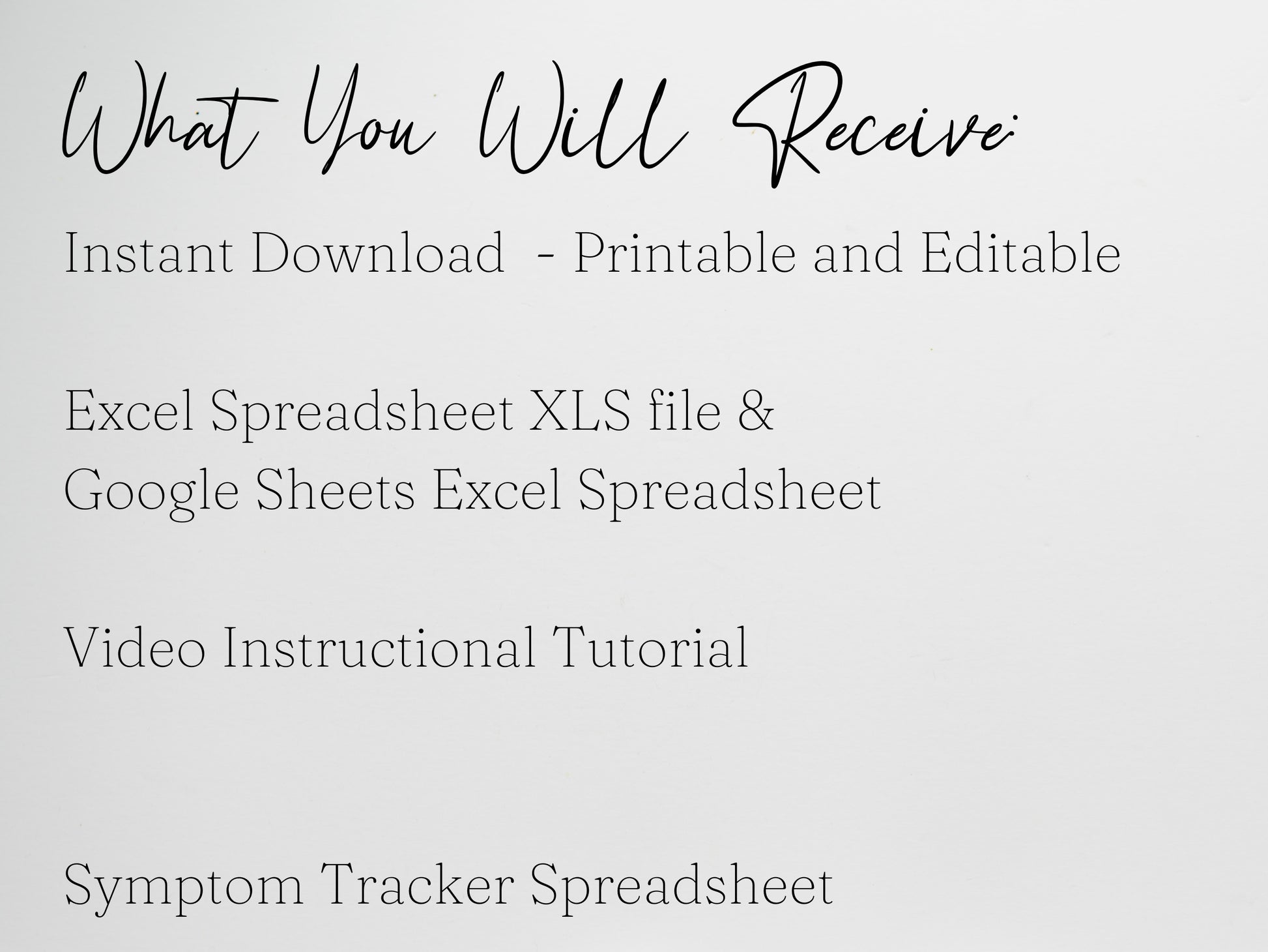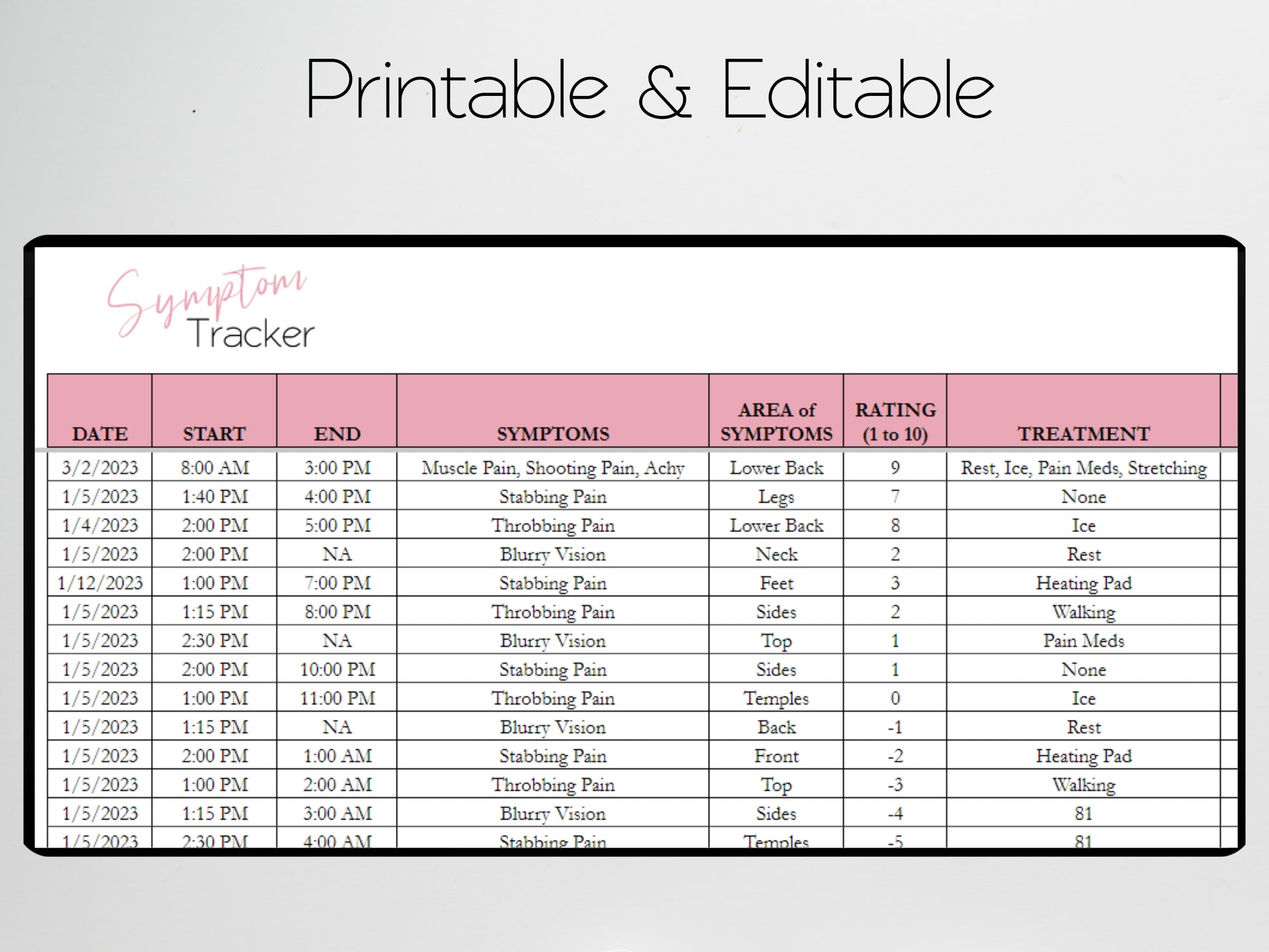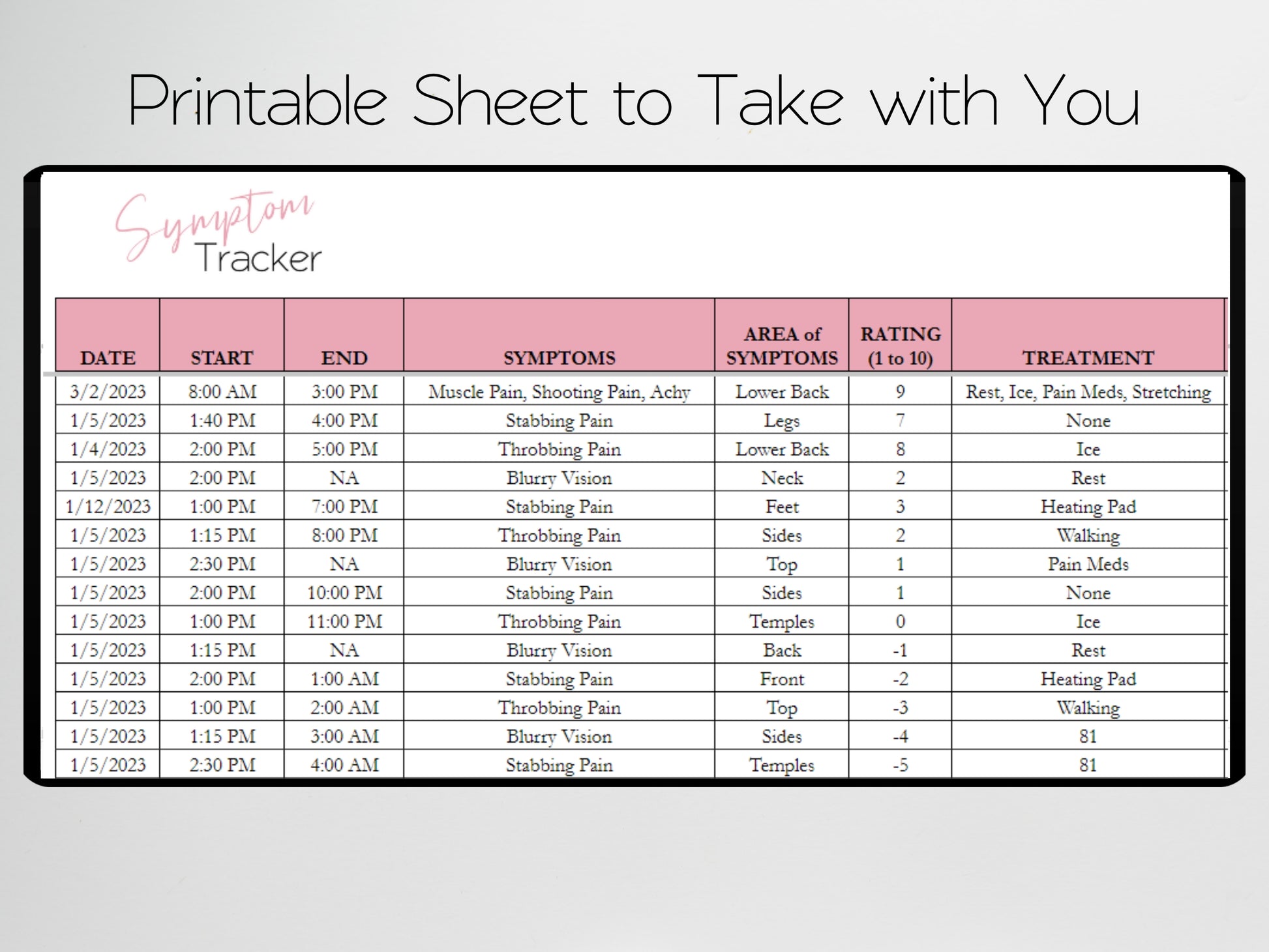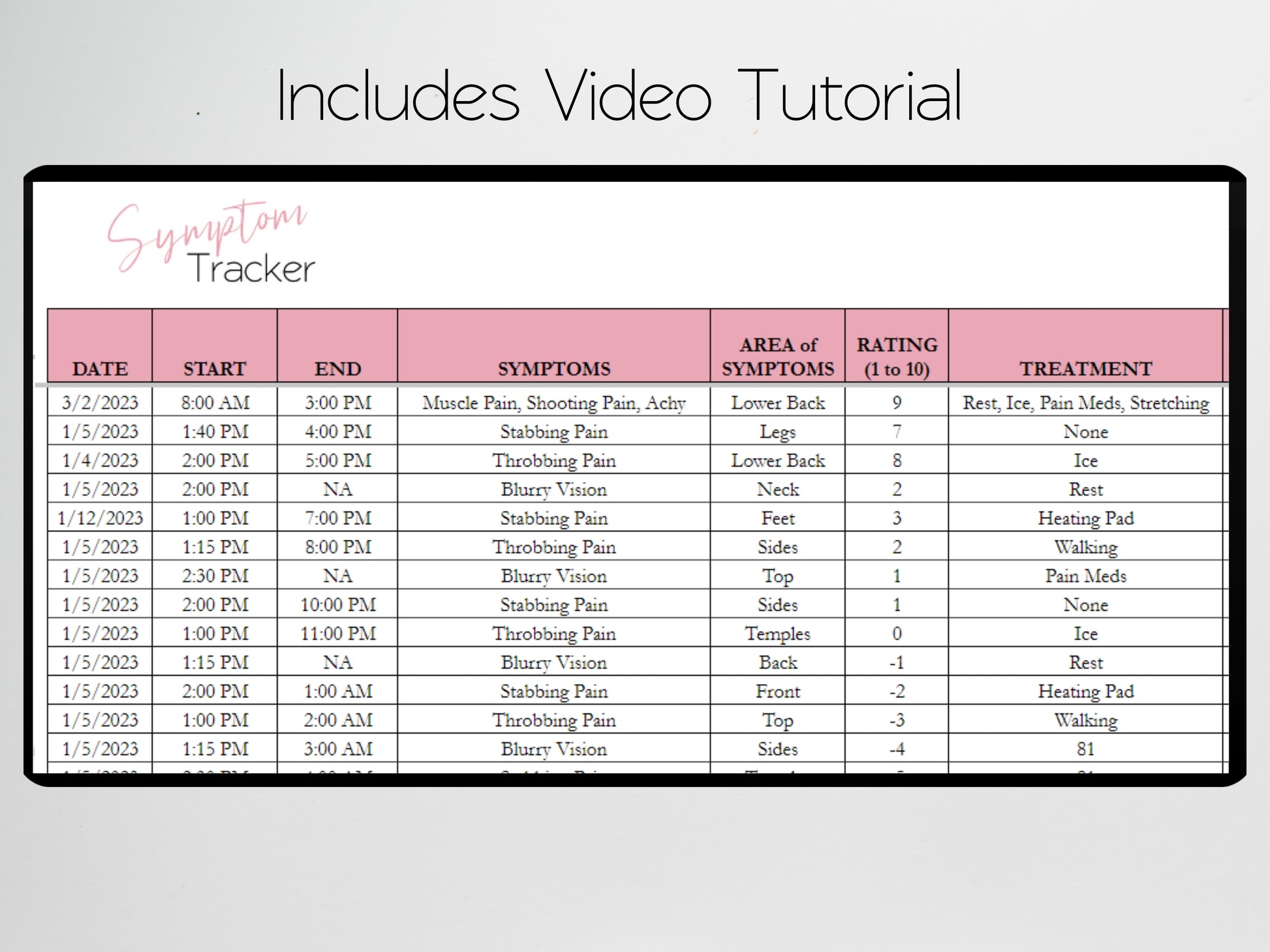 This symptom tracker will help you track the symptoms that you have. Whether you are in pain or writing down your feelings for the day, this spreadsheet template is sure to help.Â
