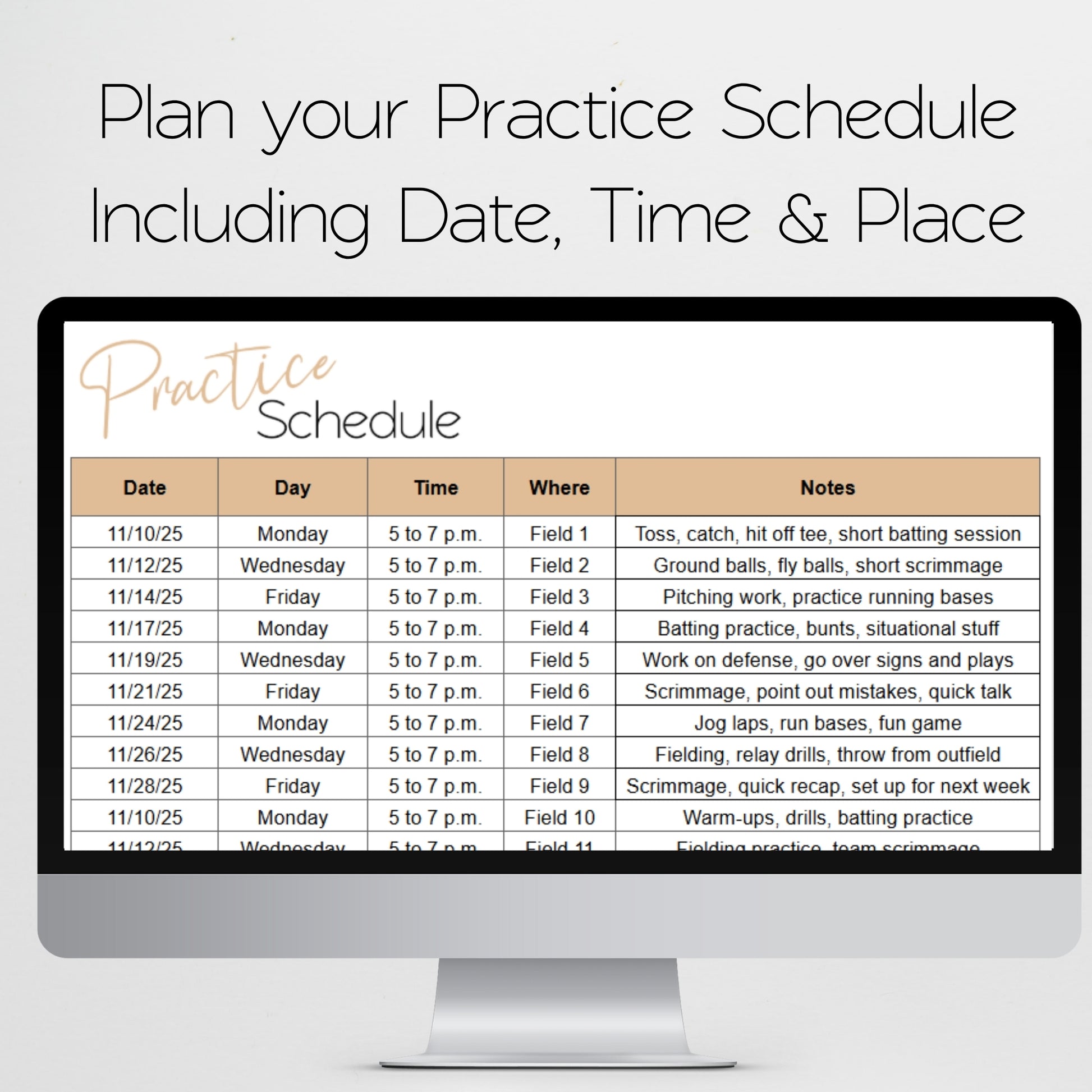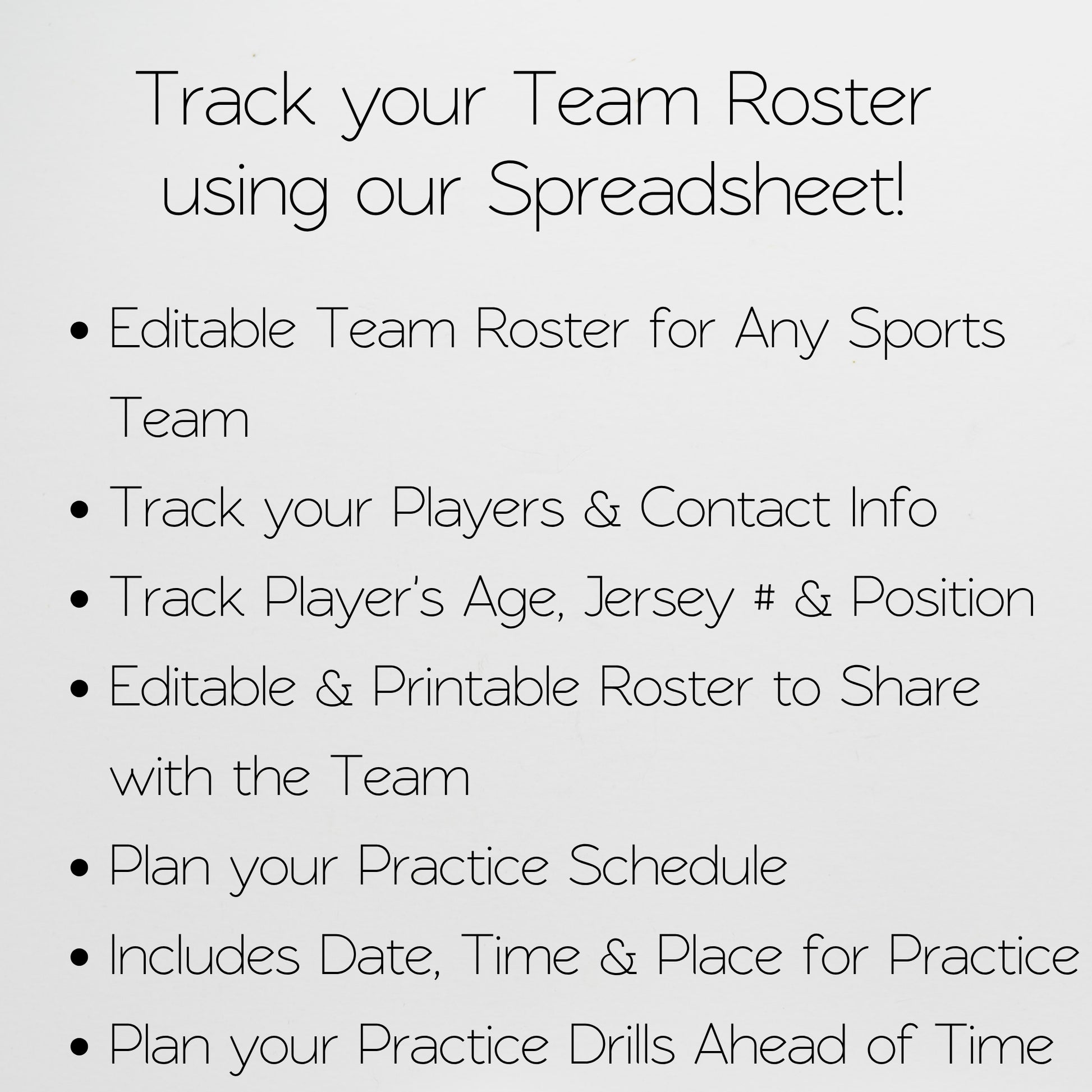 If you are a coach, this team roster Google Sheet and Excel Spreadsheet will help you stay organized. Whether you are coaching baseball, softball, football, soccer, and more, this template will help you to track your team players, their contact information, position, and jersey number. You can also plan your practice schedule for your youth sports team such as volleyball, softball, lacrosse, or field hockey team. This sports template is editable and printable for your team. Â