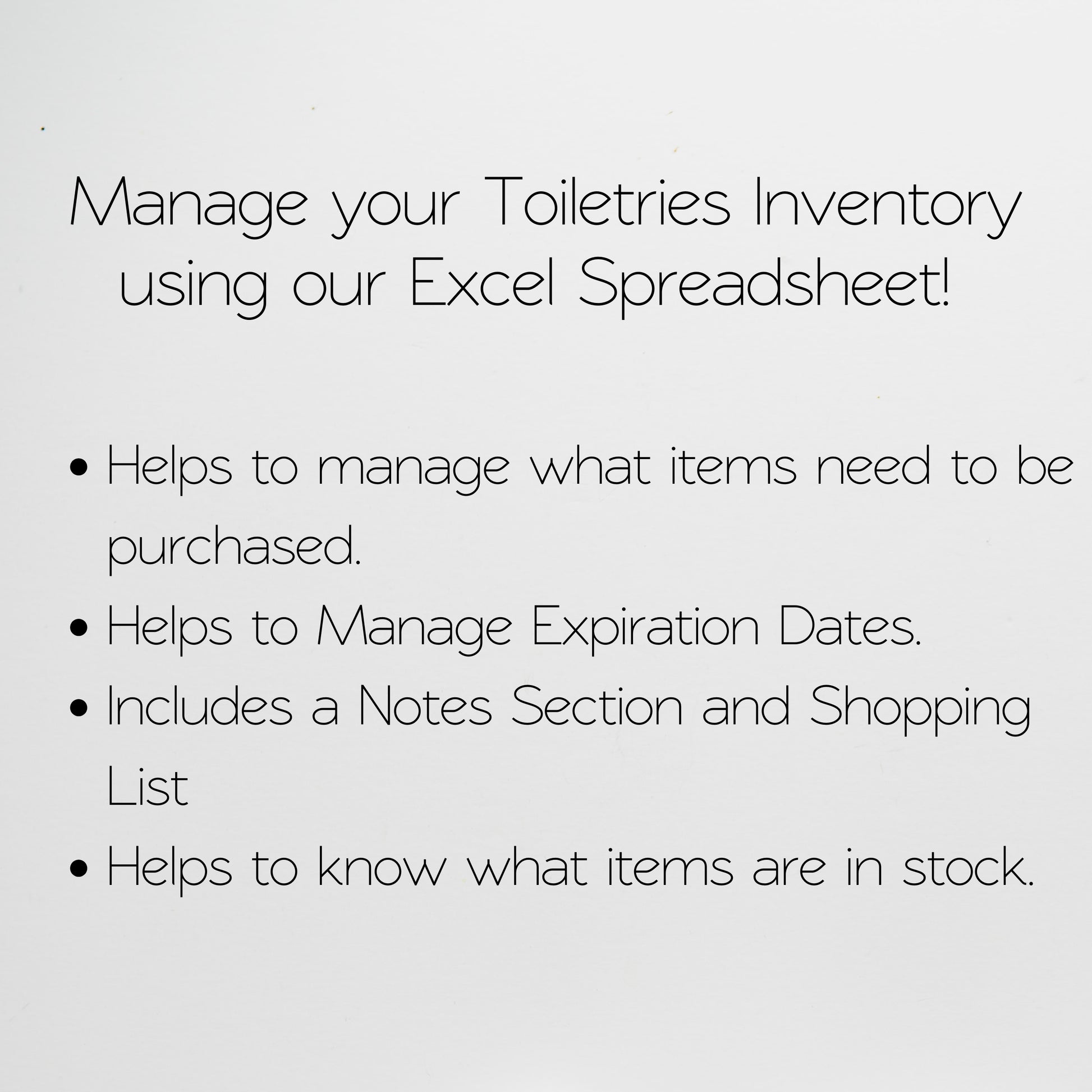 This is a toiletry check list template excel spreadsheet that helps you to manage your household items that you need to purchase. This toiletries inventory tracker is perfect for planning for a vacation, planning a short term rental property, housekeeping, cleaning company, or for someone who wants to stay organized. Â