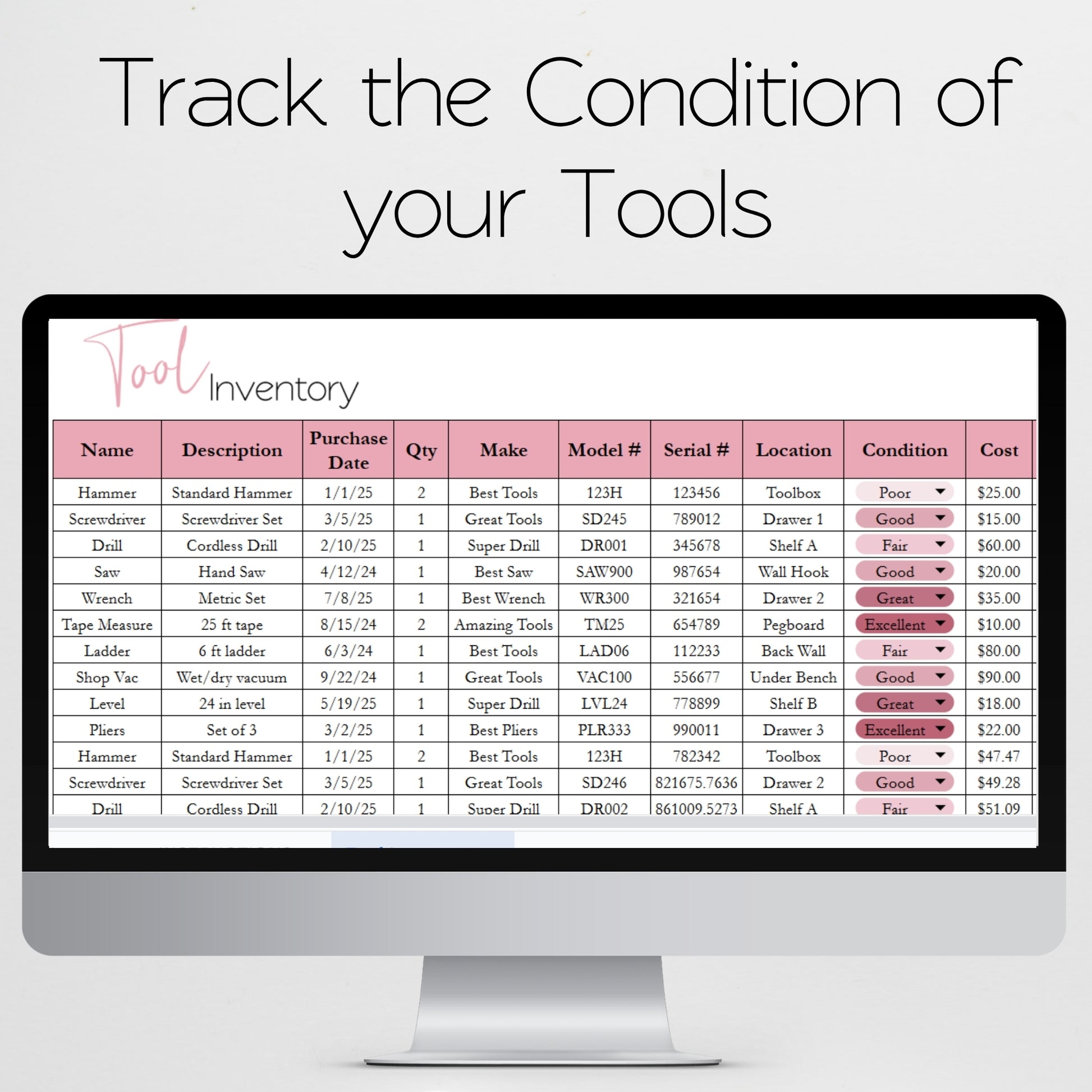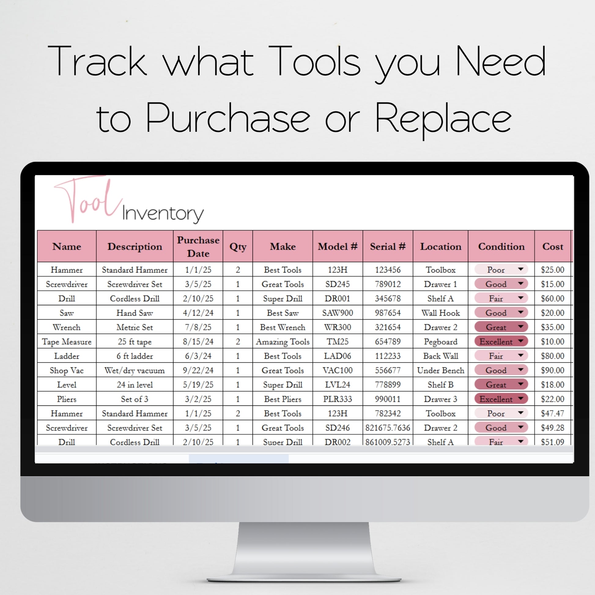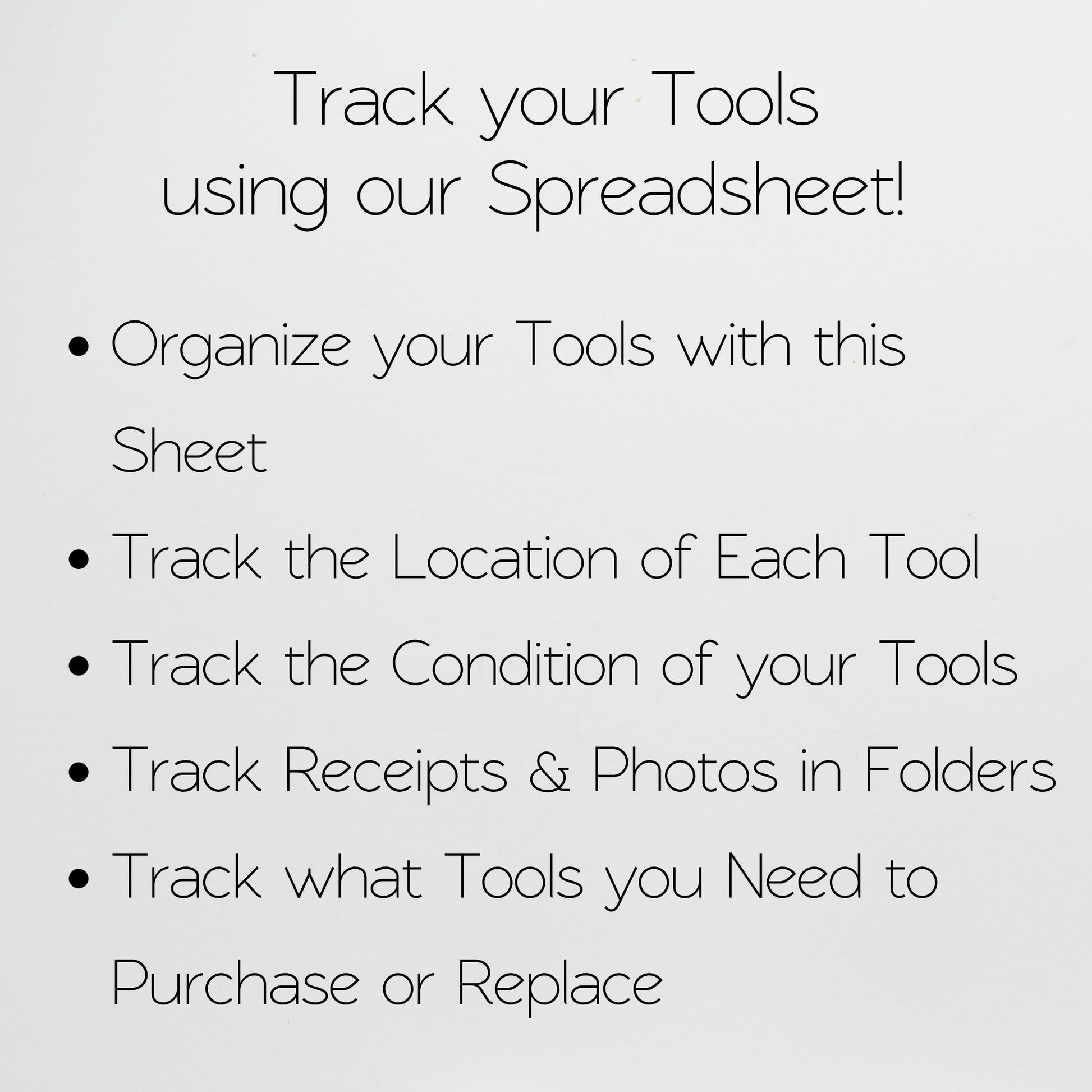 If you want to organize your tools in your garage or business, then this tool inventory log is perfect for inventory management. You can track your tools that you have, the condition of your tools, how many, the cost of your equipment, and if you need to replace them. This is perfect for warehouse management or garage inventory tracking so that you can track the receipts and photos of your tools for insurance purposes.Â