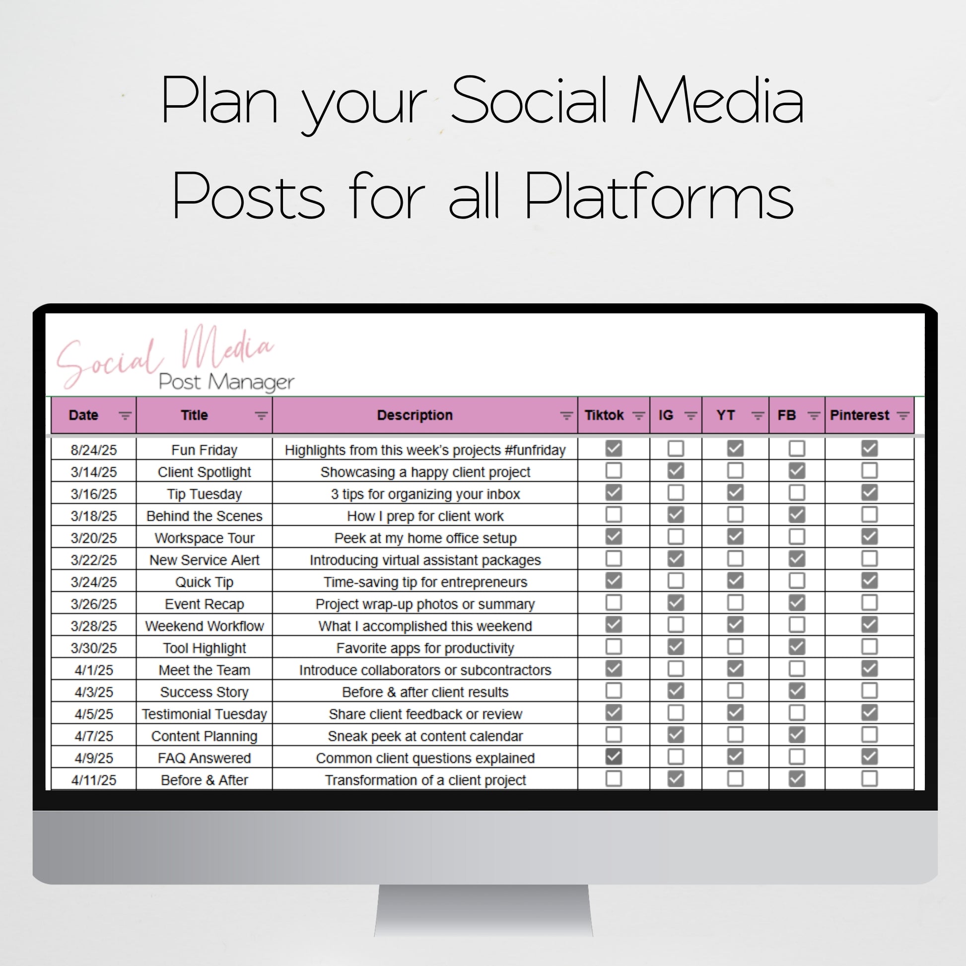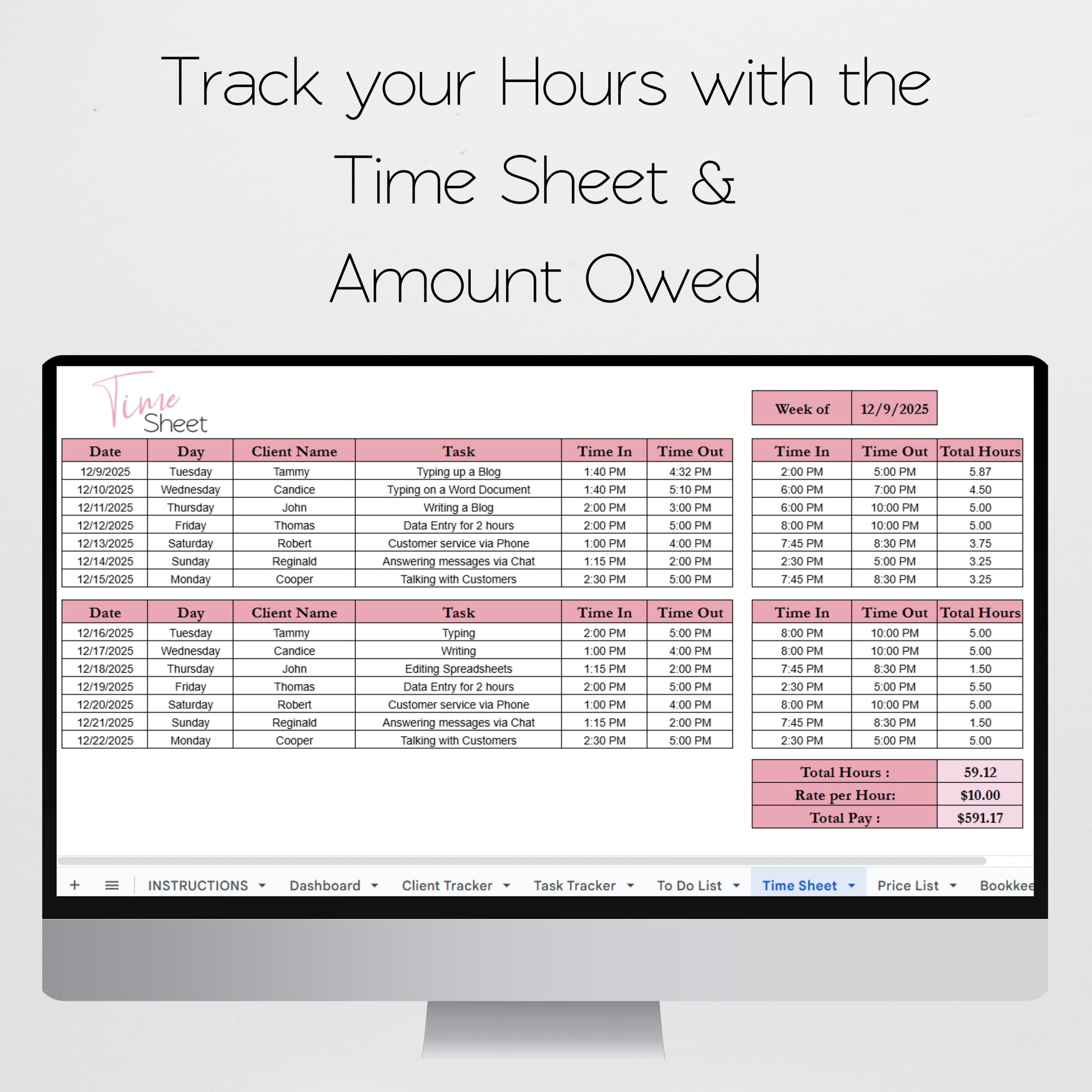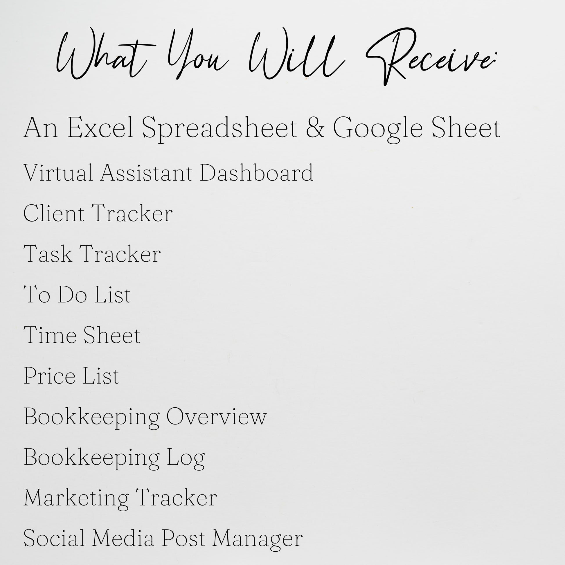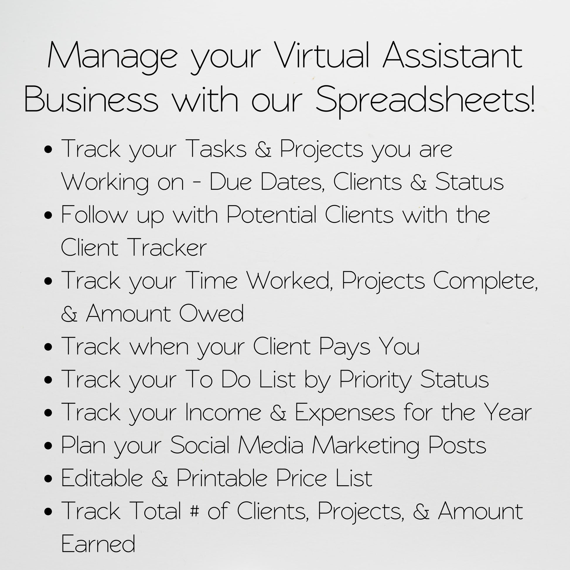 This virtual assistant template bundle is perfect for you to organize your business. You can track your clients, tasks, money, to do list, and more. These freelancer templates help you to stay organized by managing your projects, due dates, and if you have been paid. This spreadsheet is perfect if you are a graphic designer, personal assistant, content creator, social media marketer, and more. You can juggle multiple clients and stay organized with your next item on your list. Check off items as you go, manage your income and expenses, marketing your business, and even manage your time sheet all within this easy to use template. Â
